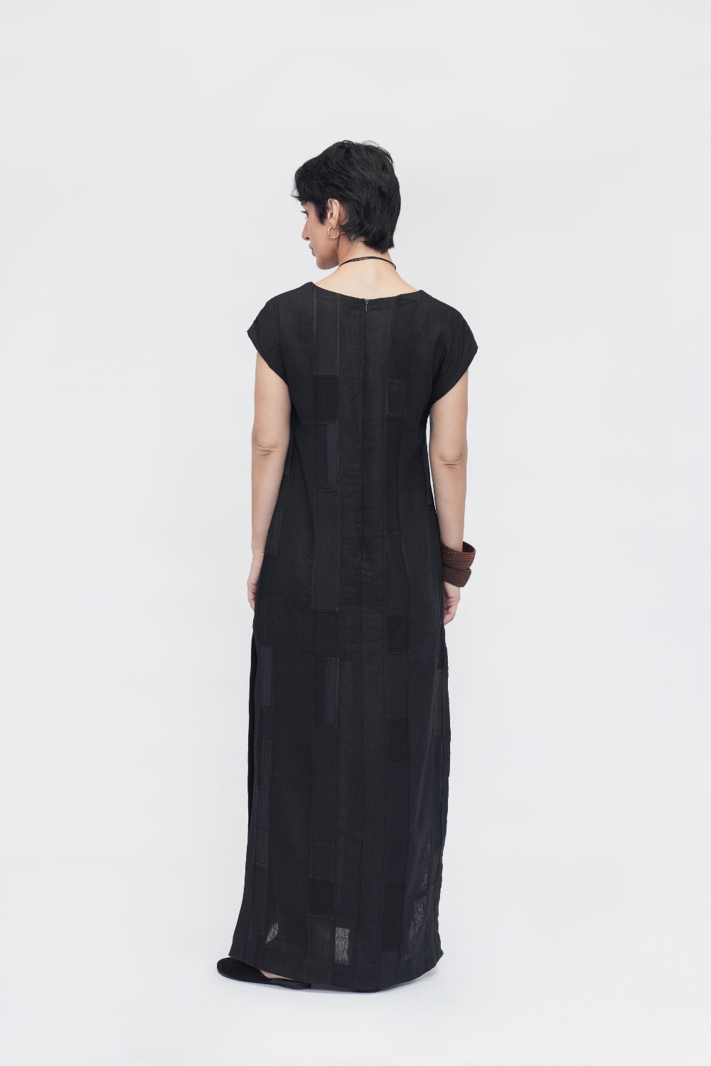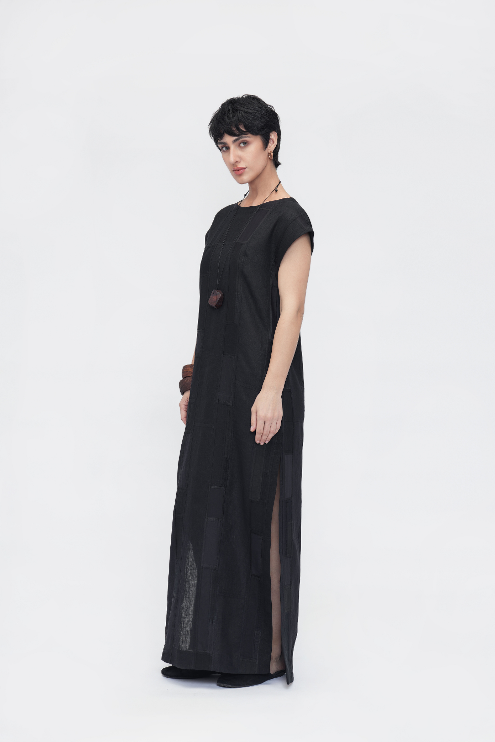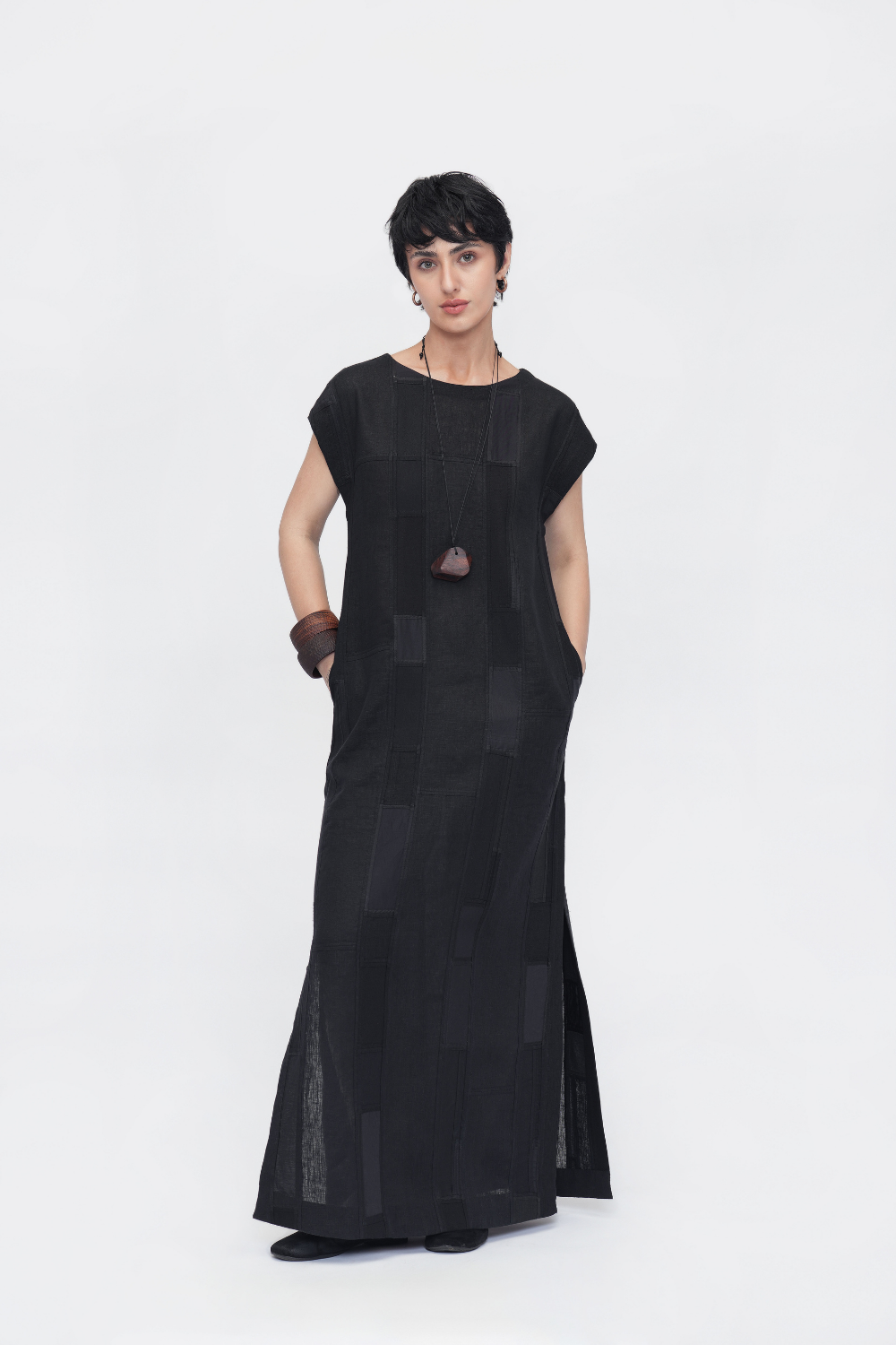 A relaxed-fit dress crafted from patchwork fabric made of leftover linens, cottons, and handwoven materials. Features a round neckline, extended drop shoulders, handy side seam pockets, and side slits for ease of movement. The back has a concealed zipper for a smooth silhouette. An elegant, breathable dress for effortless everyday wear.