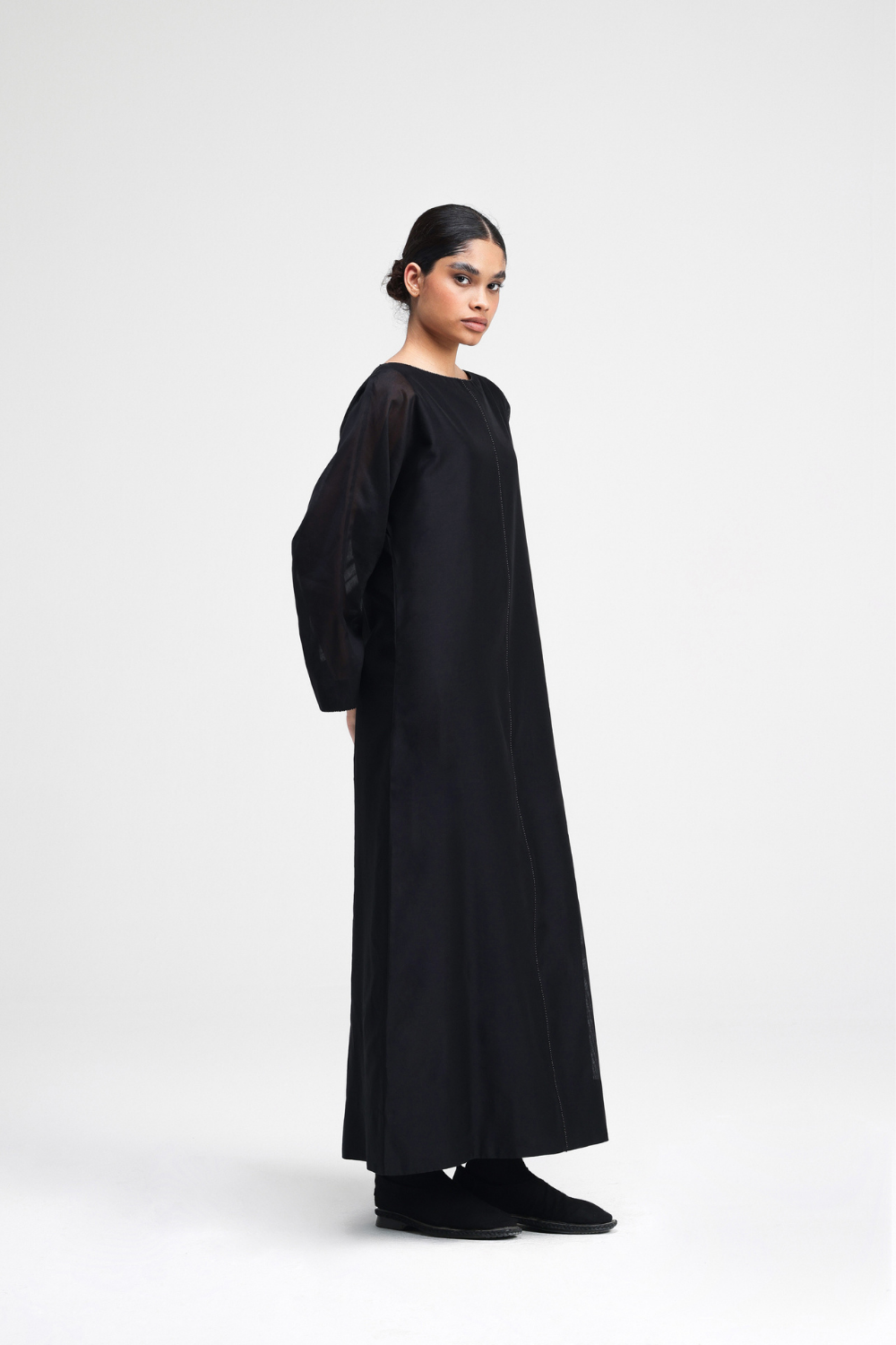 A relaxed, full-length Chanderi silk dress featuring a boat neck and delicate French Knot embroidery along the centre, neckline, and sleeves. Complete with a cotton slip, this elegant piece is perfect for special occasions.