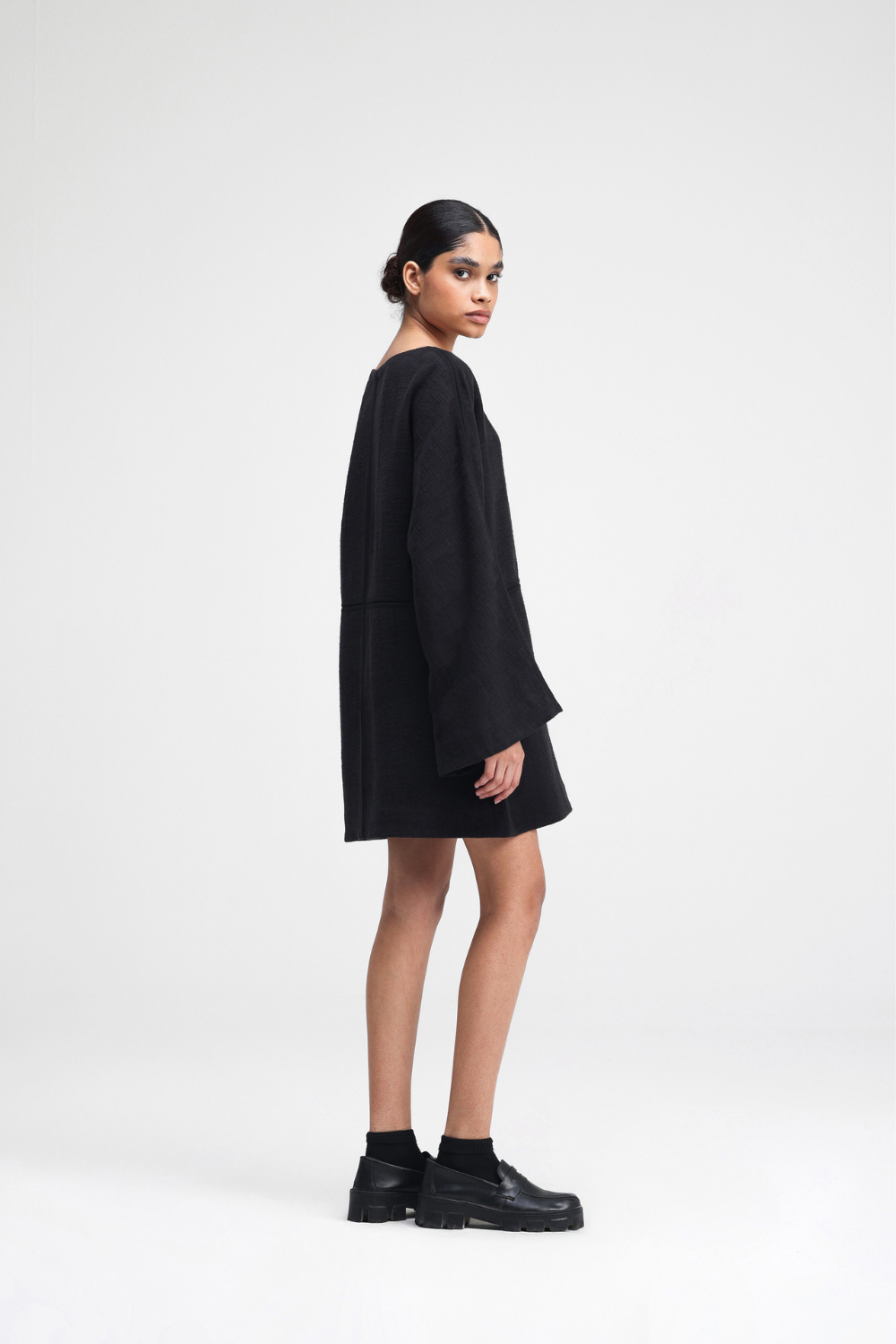 A relaxed-fit short dress with a boat neck and full sleeves, elegantly panelled with fagoting and finished with side seam pockets. This versatile piece combines comfort and style, perfect for any special occasion.