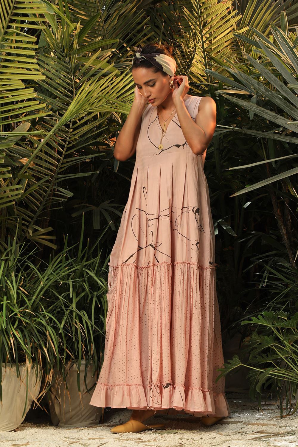 Nature sings for those who listen. A sleeveless pink floral tiered dress with frill details at the bottom, box pleats above the waist and side pockets. Now you know her secret. Partially lined.
