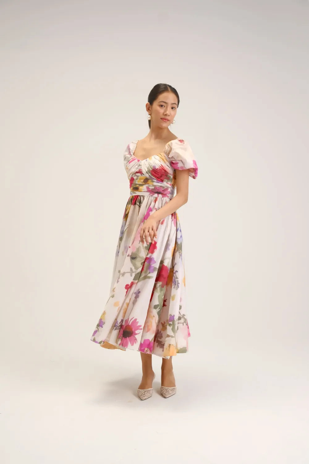 An artistic bouquet of florals in soft pinks, yellows, purples, and greens dances across a white canvas in this dreamy watercolor-inspired print. The blend of delicate brush strokes and bold floral placements evokes the charm of an impressionist garden painting, bringing the perfect blend of elegance and whimsy.