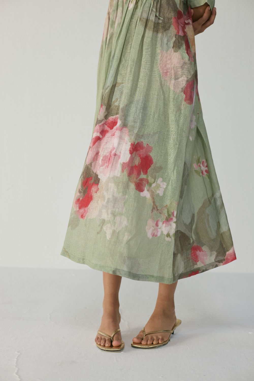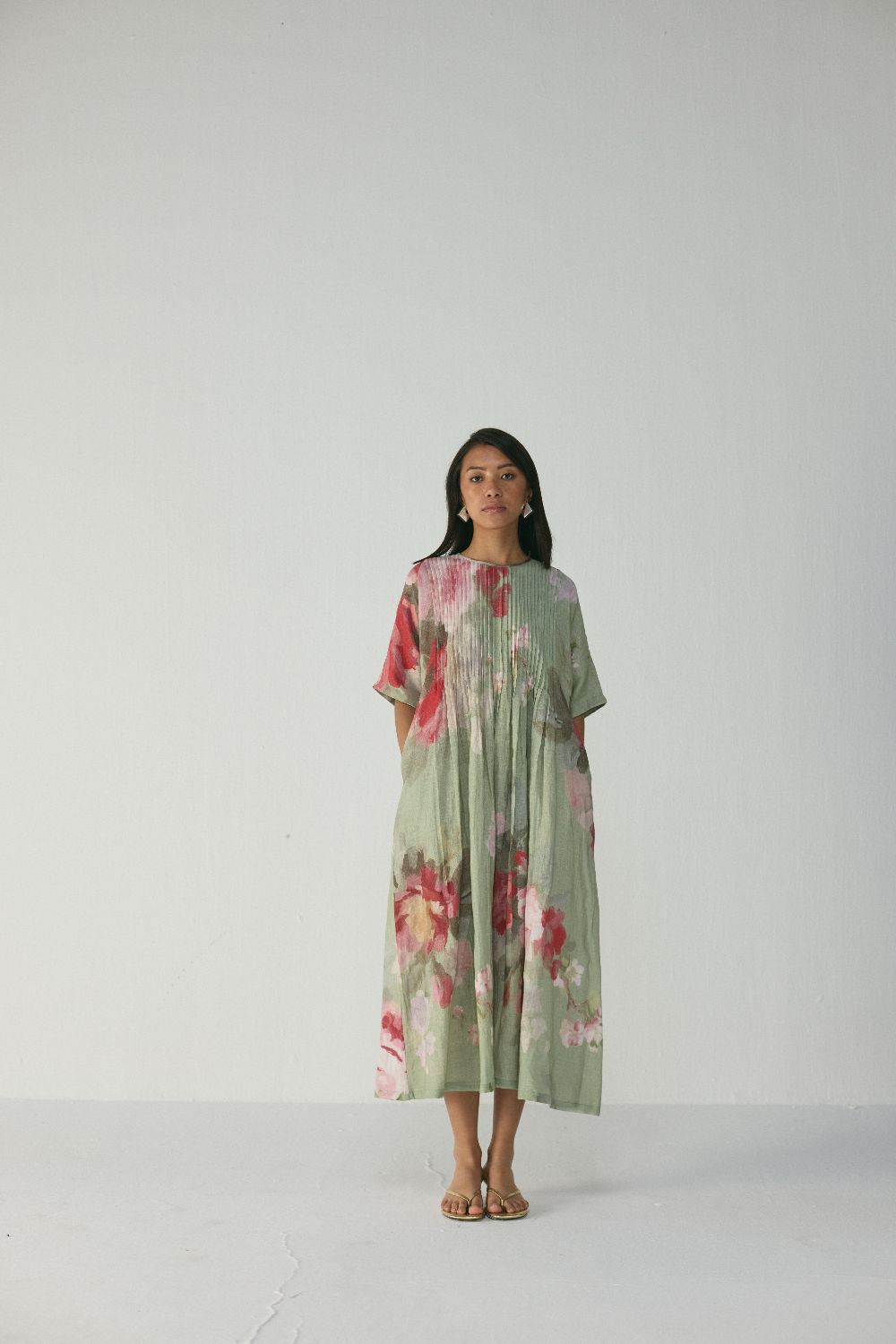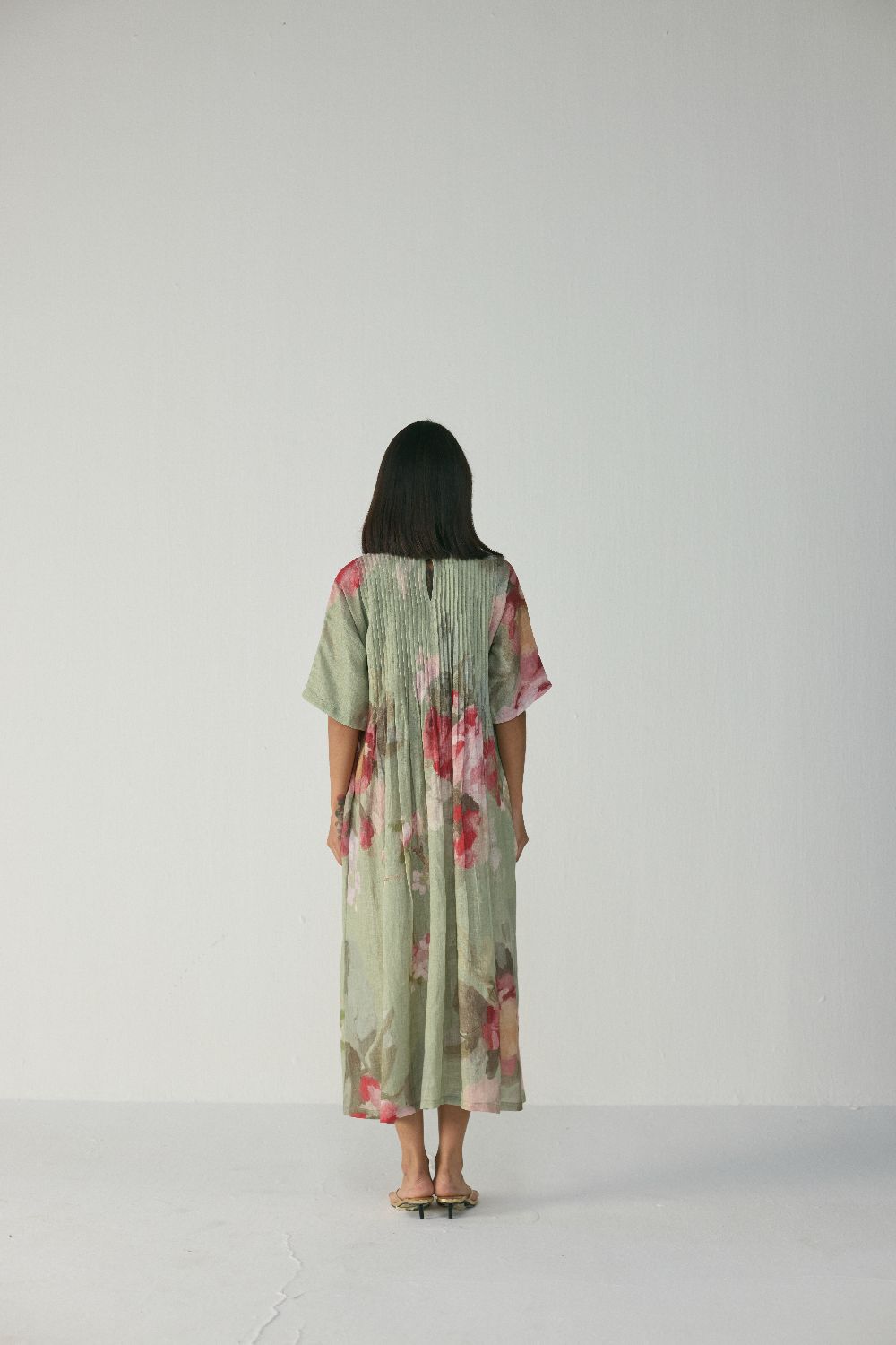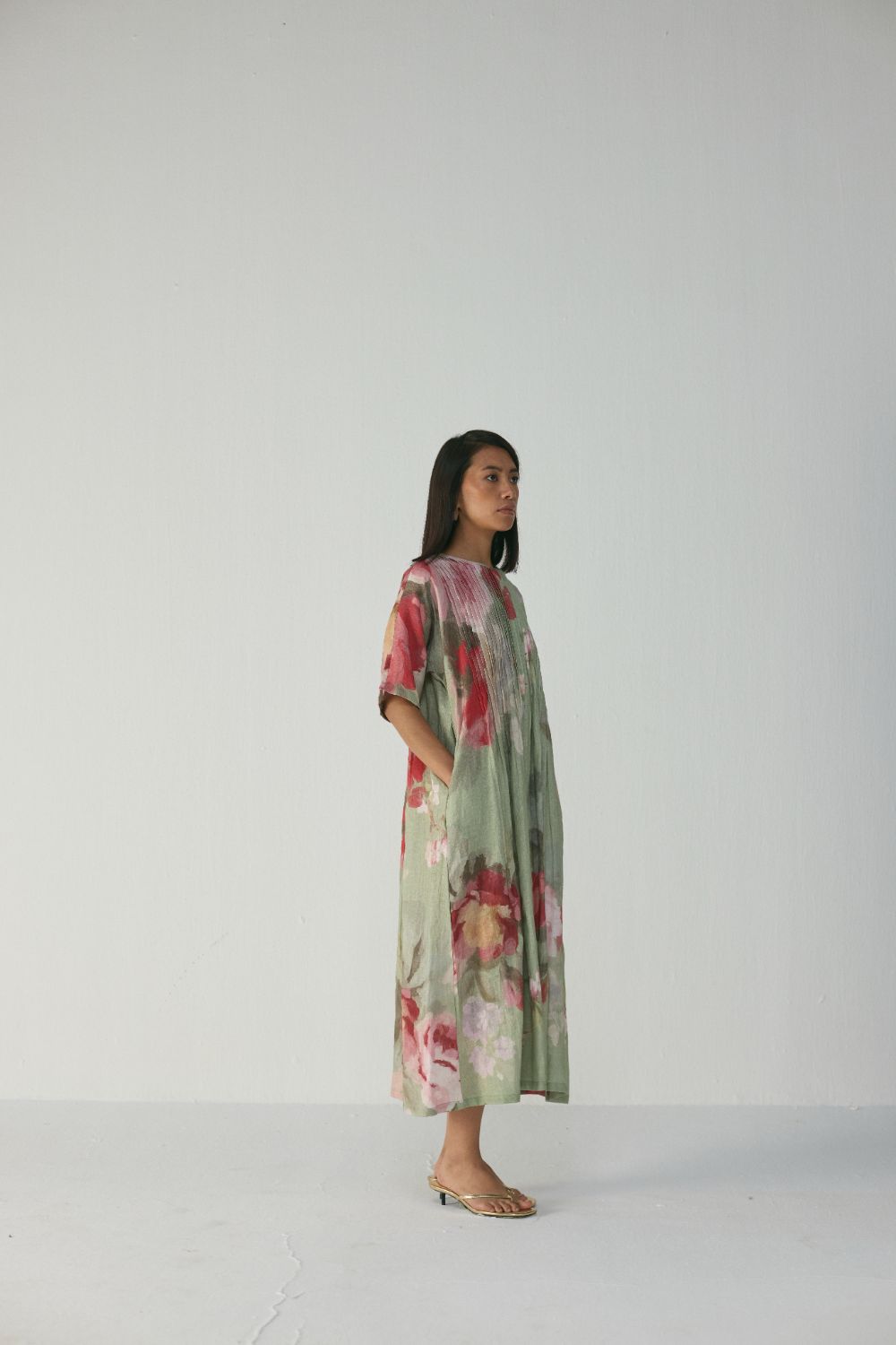 This elegant dress offers an effortless blend of comfort, artistry, and understated luxury. Crafted in a soft linen sage-green base, the dress features a relaxed A-line silhouette with a front yoke enhanced by fine pintuck detailing that adds structure and fluidity to the garment. The elbow-length sleeves and mid-calf length make it a versatile piece suitable for daytime ease or understated evening dressing.