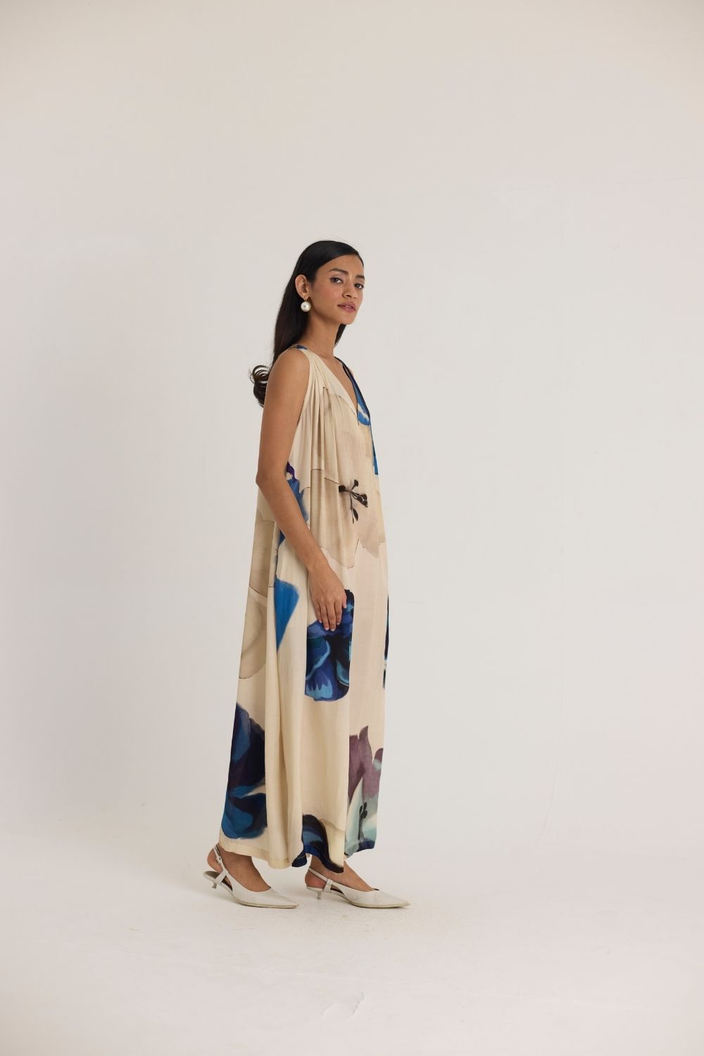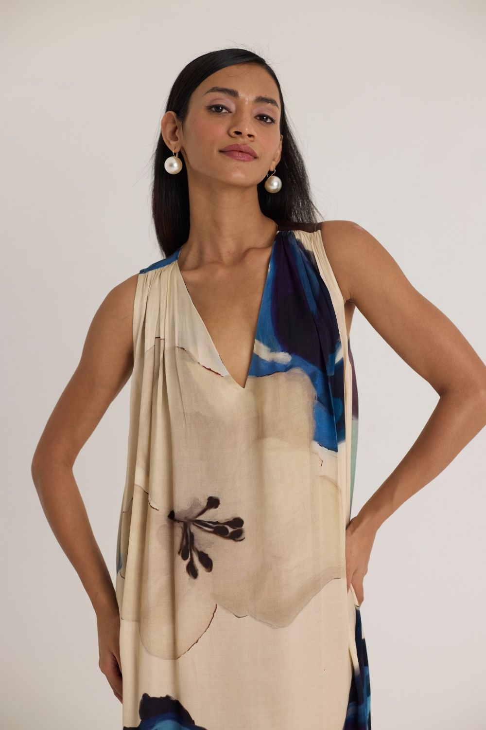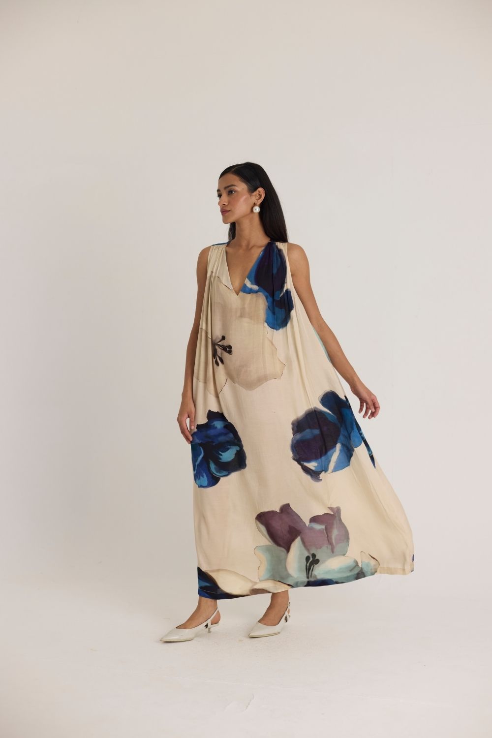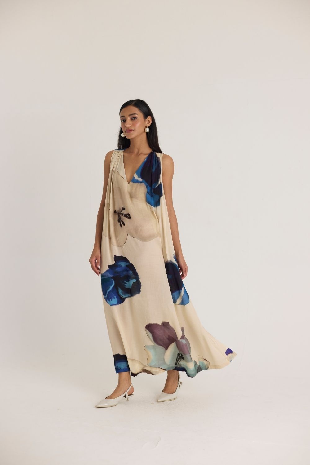 A fluid and graceful maxi dress designed for effortless elegance. Set against a soft, neutral base, the dress features an oversized watercolor floral poppy print in rich shades of cobalt blue, deep indigo, and soft lilac. The draped silhouette, deep V-neckline, and subtle shoulder gathers add to its breezy charm, making it a perfect statement piece for both casual and dressy occasions.
