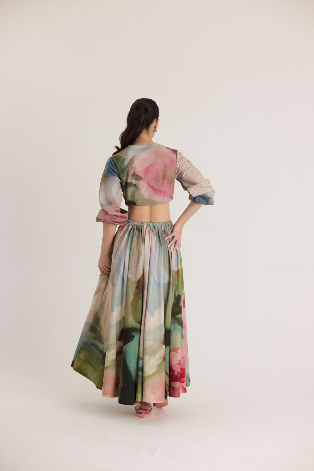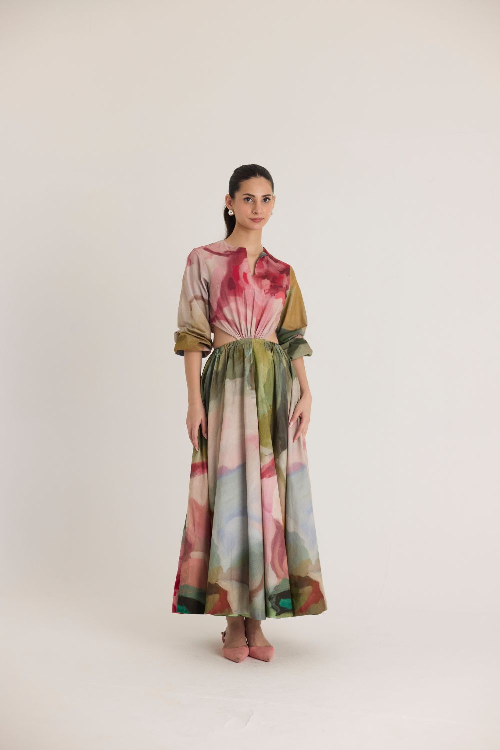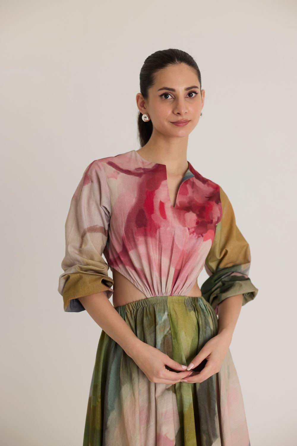 This captivating maxi dress features an artistic abstract floral print, resembling hand-painted brushstrokes in lush greens, deep reds, and muted neutrals. The dress is designed with a flowy silhouette and an elegant side cutout, adding a modern, playful touch while enhancing the waistline. Crafted from a Lightweight, breathable fabric, it ensures effortless movement and comfort.