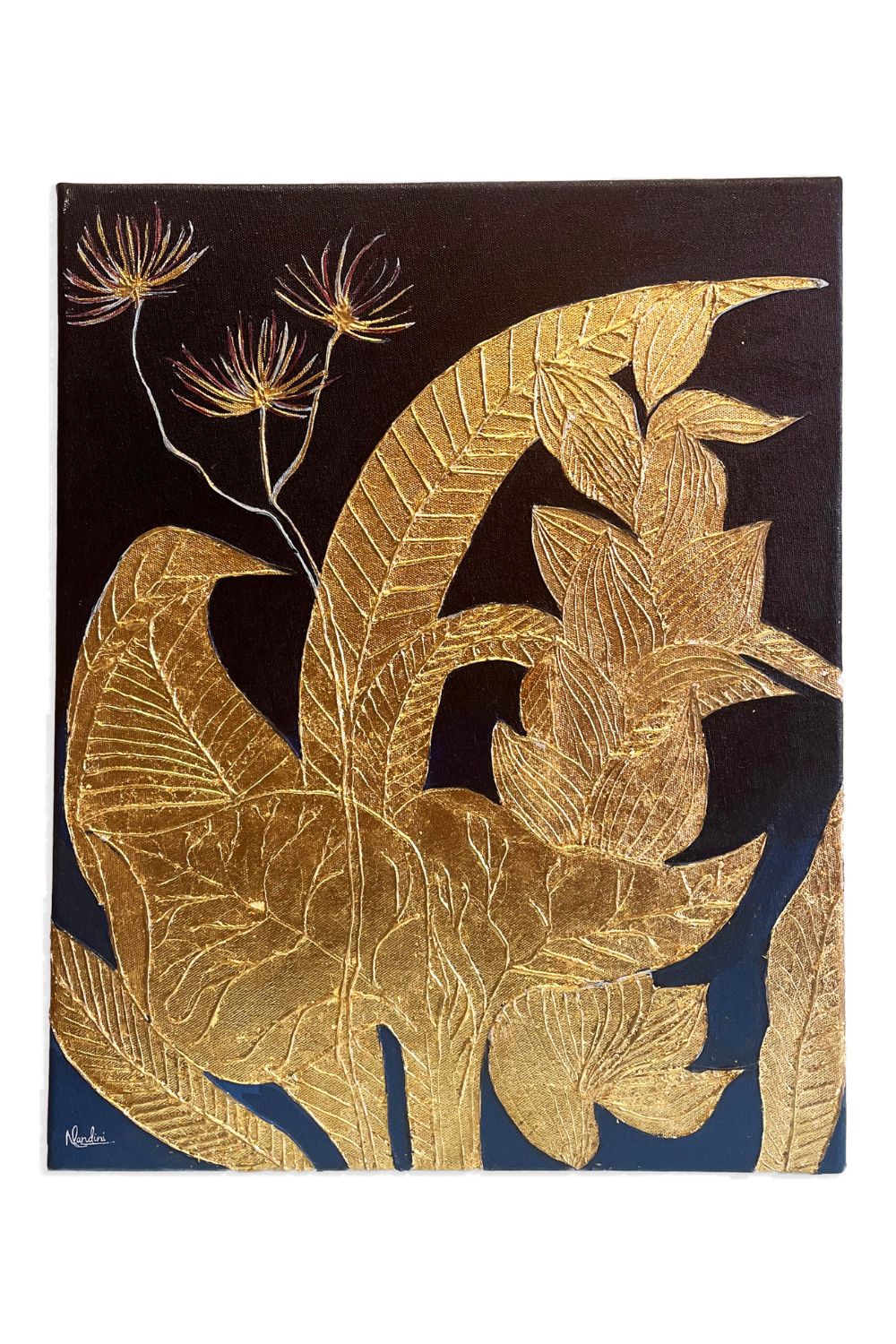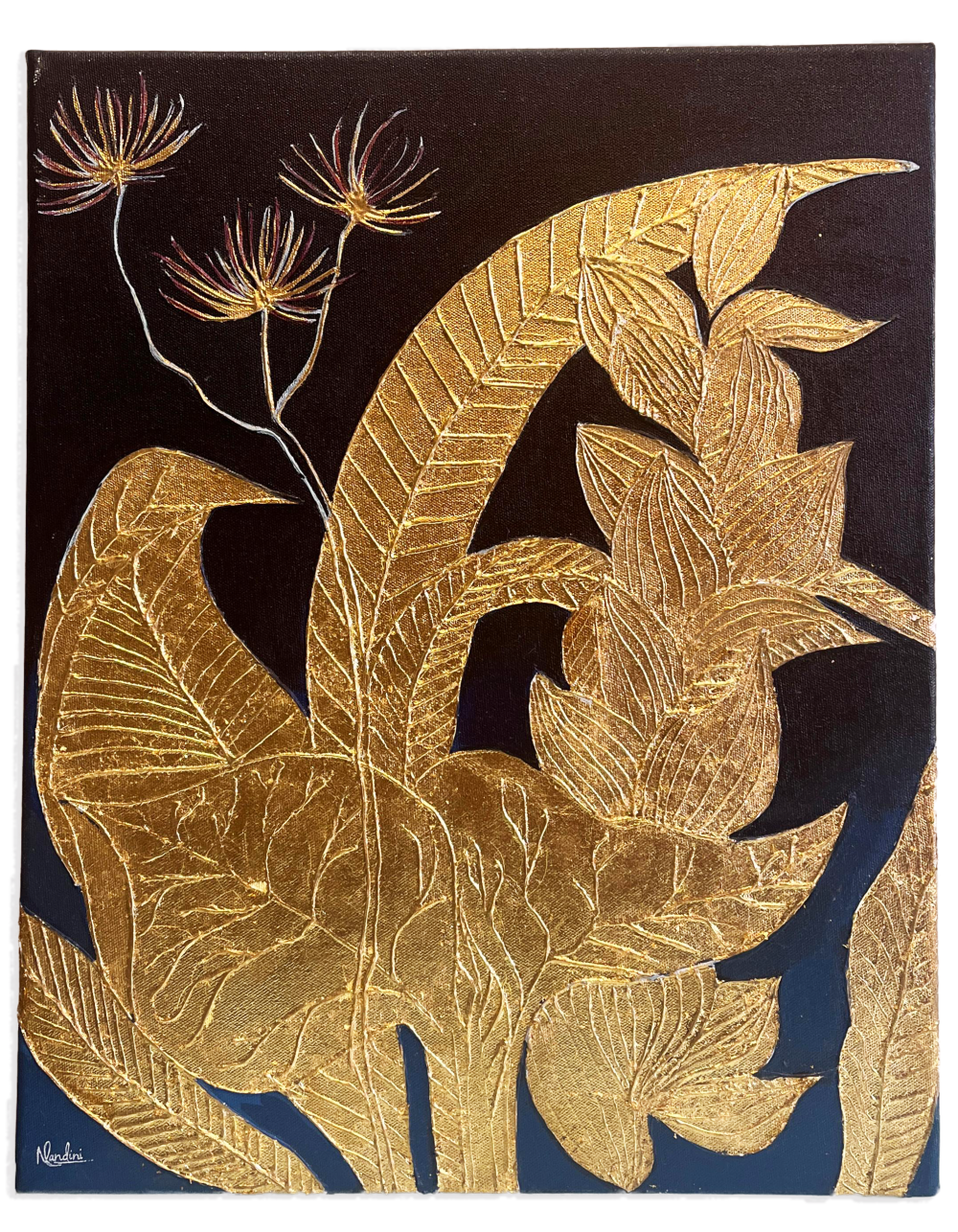 Nandini Choudhary, born in Udaipur, Rajasthan, is a contemporary artist known for her vibrant, textural works that seamlessly blend the luminosity of gold foil with the versatility of acrylics. Early in her artistic journey, Nandini encountered Kintsugi, the ancient Japanese art form that repairs broken objects with liquid gold, embracing imperfections and transforming them into something more unique and beautiful than the original. This philosophy deeply resonated with her, illuminating the idea that brokenness can be reimagined as beauty—that what has been shattered can be restored and made whole again.