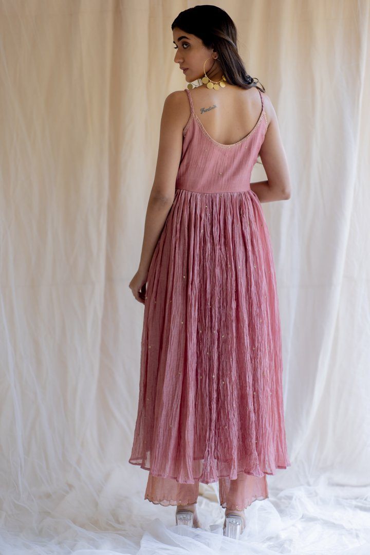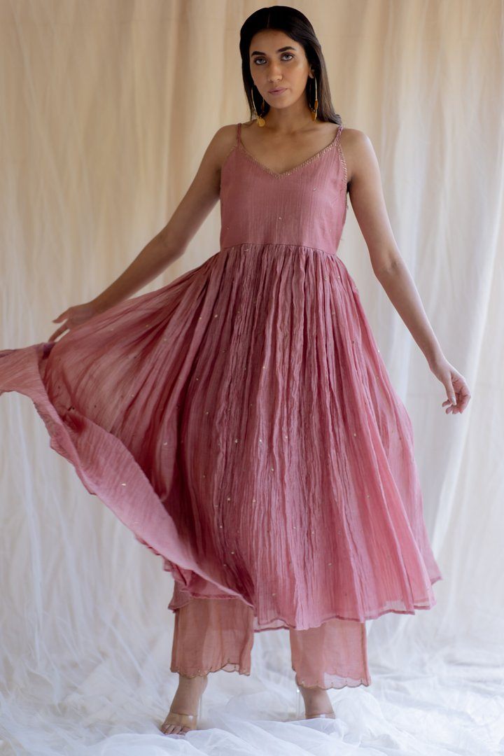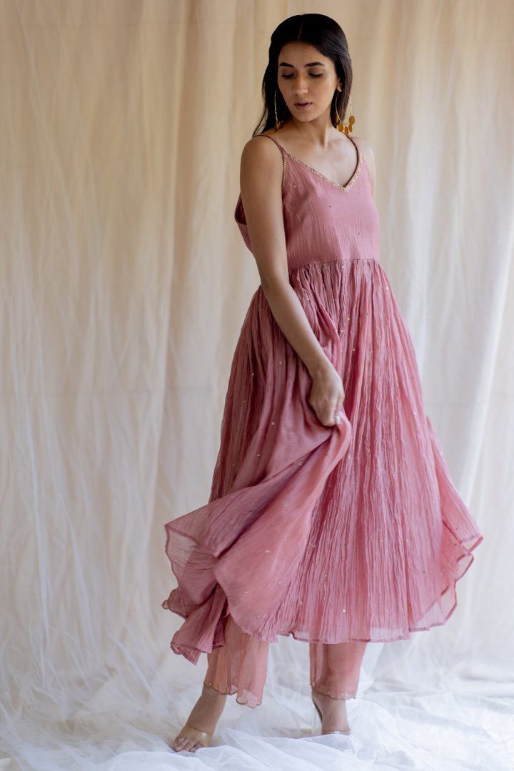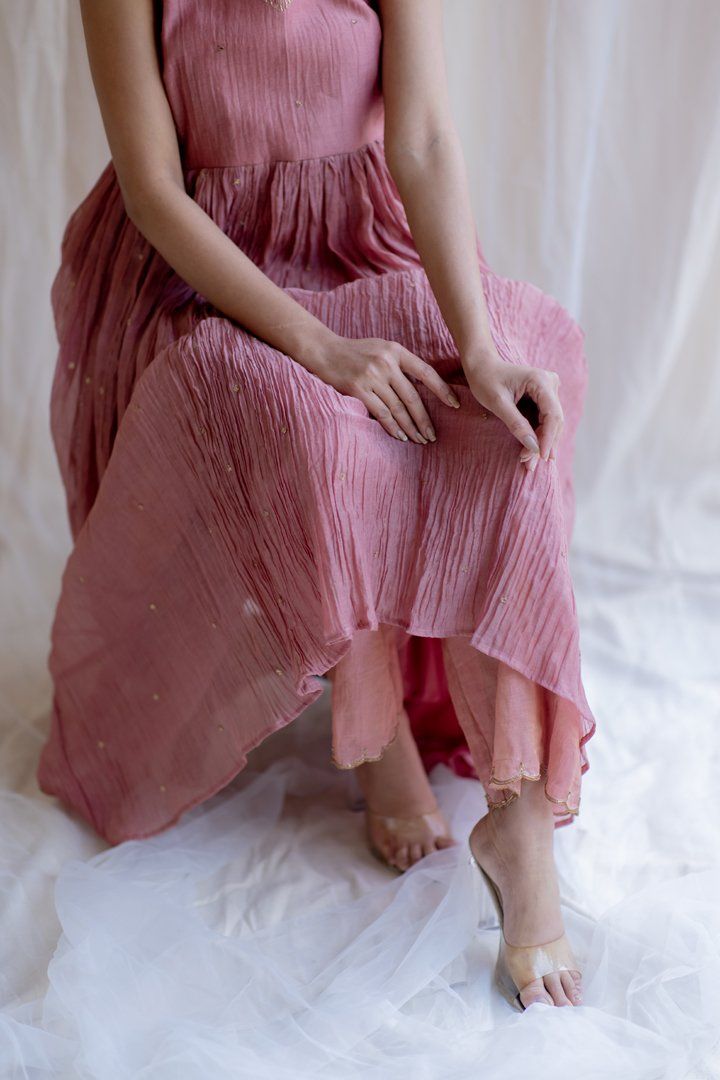 Sleeveless fitted upper bodice attached to a flared bottom, paired with embrodiered tissue izaars . This silhouette speaks of the fluid organic femininity.