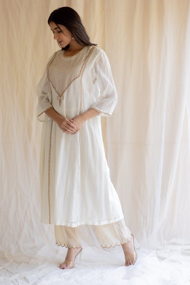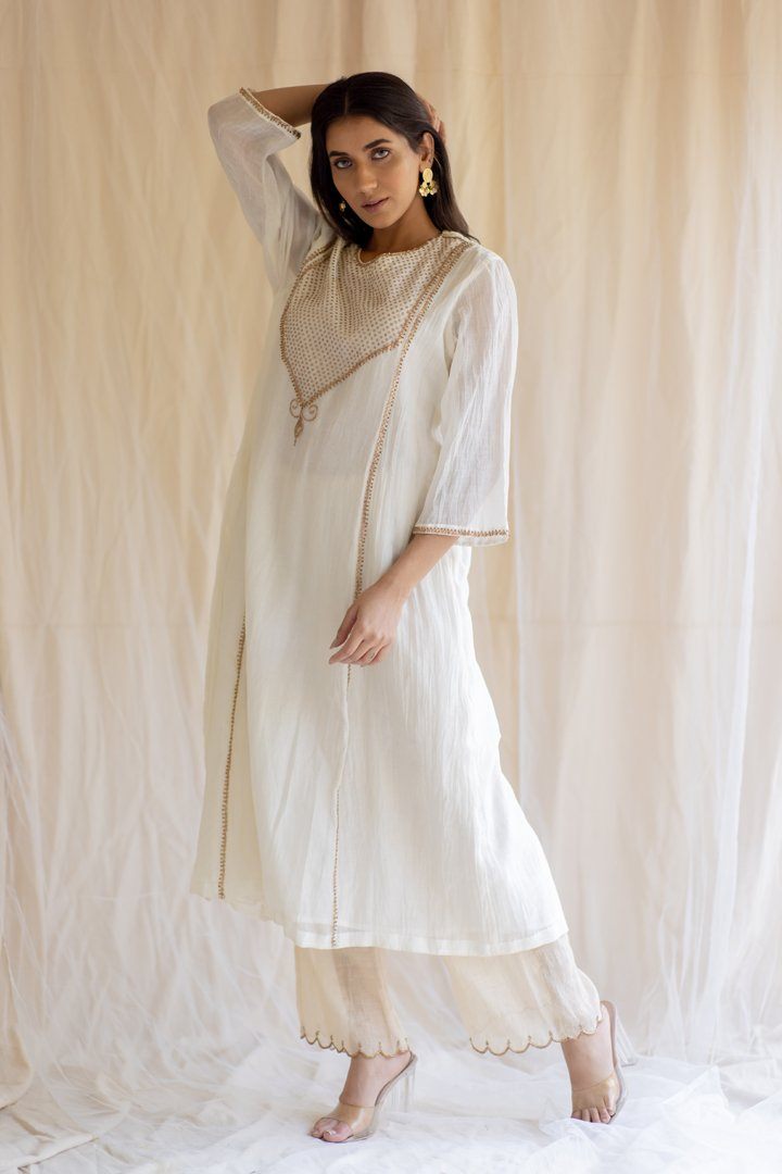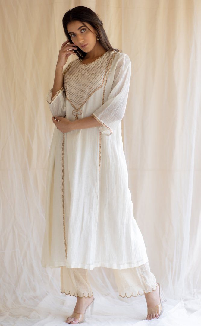 V neck kurta with bias flare and signature Ruya embroidery, this kurta pronounces femininity and softness in its draughtsmanship.