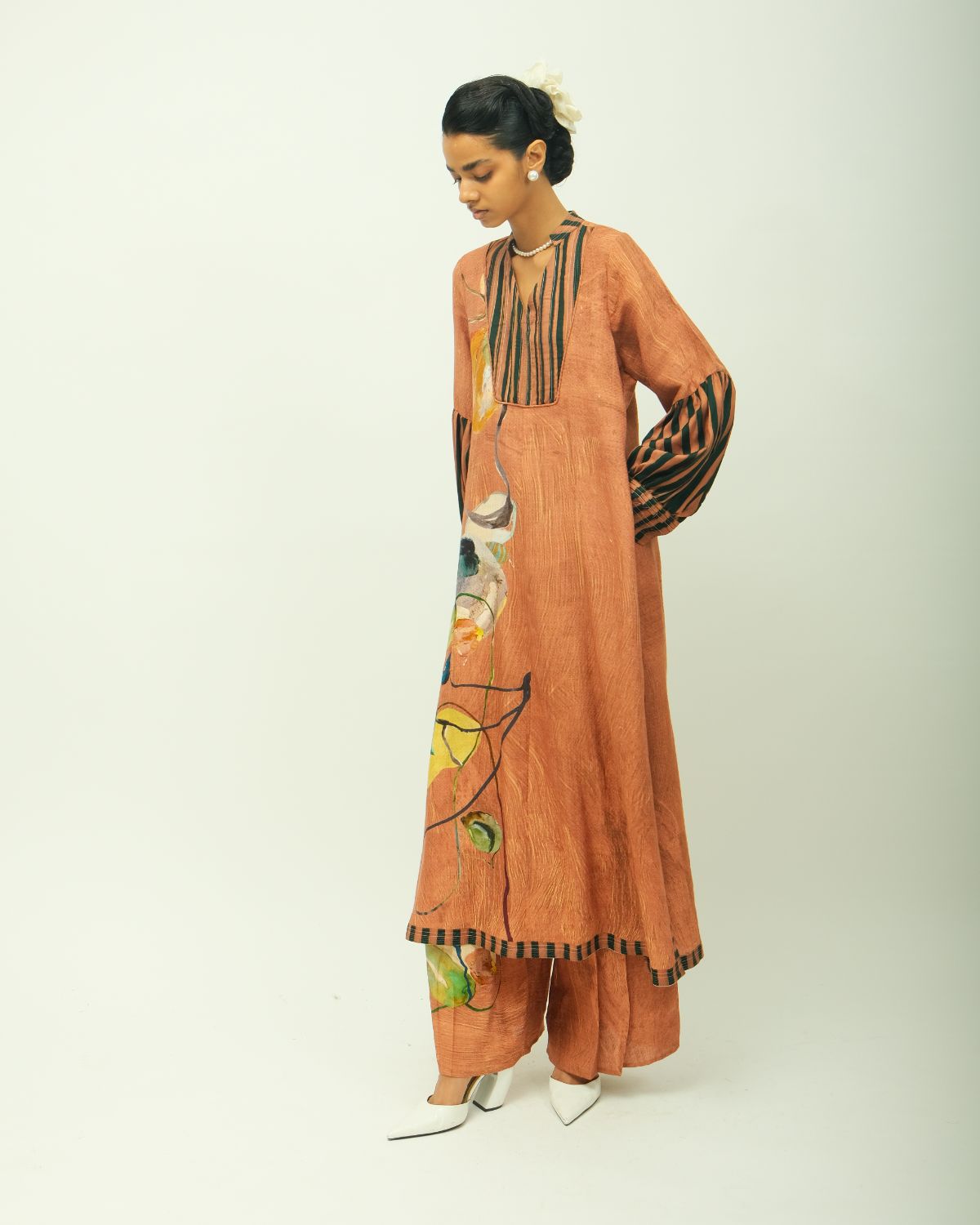 Anti fit, band collar, relaxed fit, flared long-sleeves, hand-painted abstract expressionist digitally transferred print, pin tucks on yoke, top stitch detailing, cording, striped pattern on sleeves and border, side slit. Print placement may vary - single piece. Garment Length - 48"