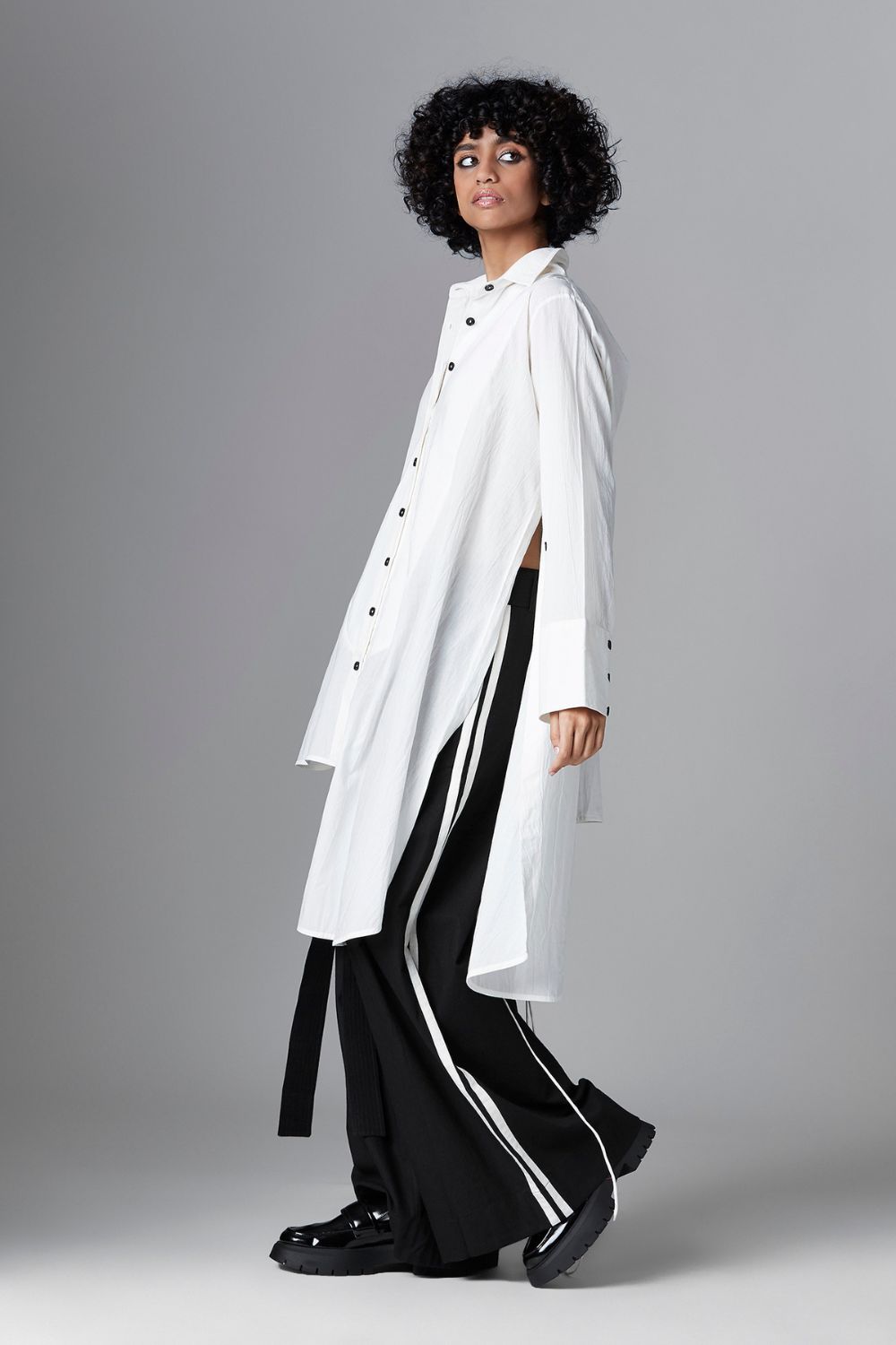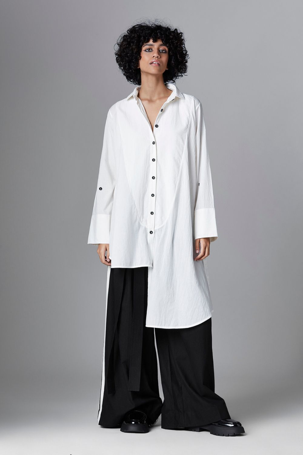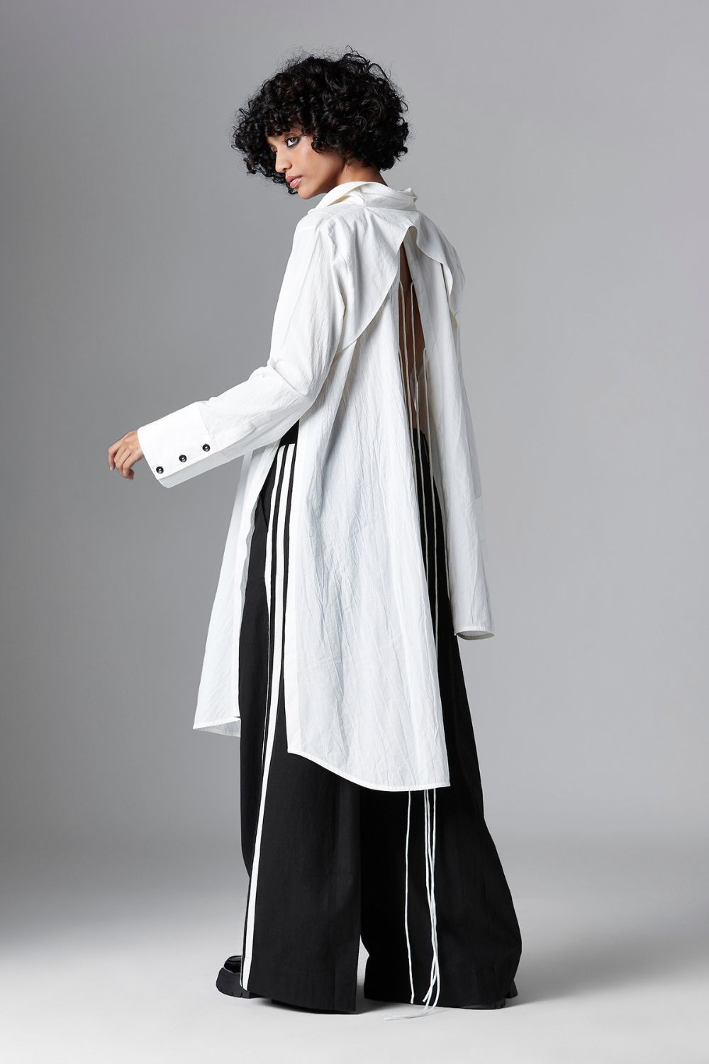 Theia follows an uneven length style and features a shirt collar with straight sleeves. Additional details include a curved yoke flap and tie-up detail at the back.