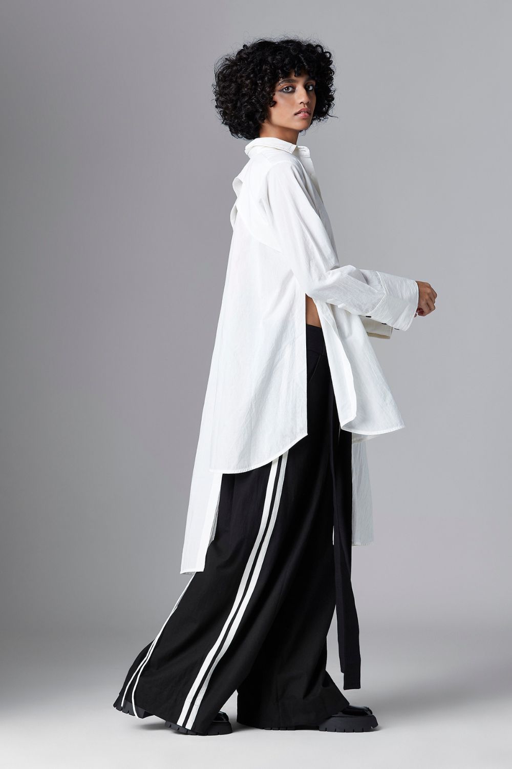 Chola’s universe begins with thoughtful materials. Recycled cottons, post-consumer fabrics, and free-cutting techniques come together in a kind of mindful choreography—one that honours form without creating waste, and prioritises movement over rigidity. This is clothing that feels lived-in yet architectural; pared-back yet quietly avant-garde.