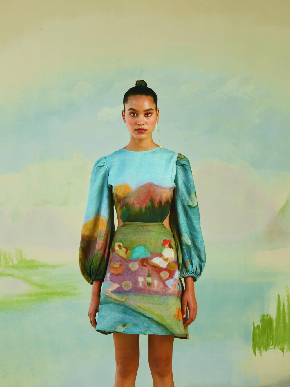 Where style meets comfort, the Euro dress is light on the body and picturesque on the outside. Fabricated in ethically sourced pure linen, the dress has a backless pattern with a flared skirt. It has voluminous sleeves that taper in the form of gathers along with the elasticated cuffs. The relaxed fit, mid-thigh length summer dress accentuates the body silhouette with cuts along the wais