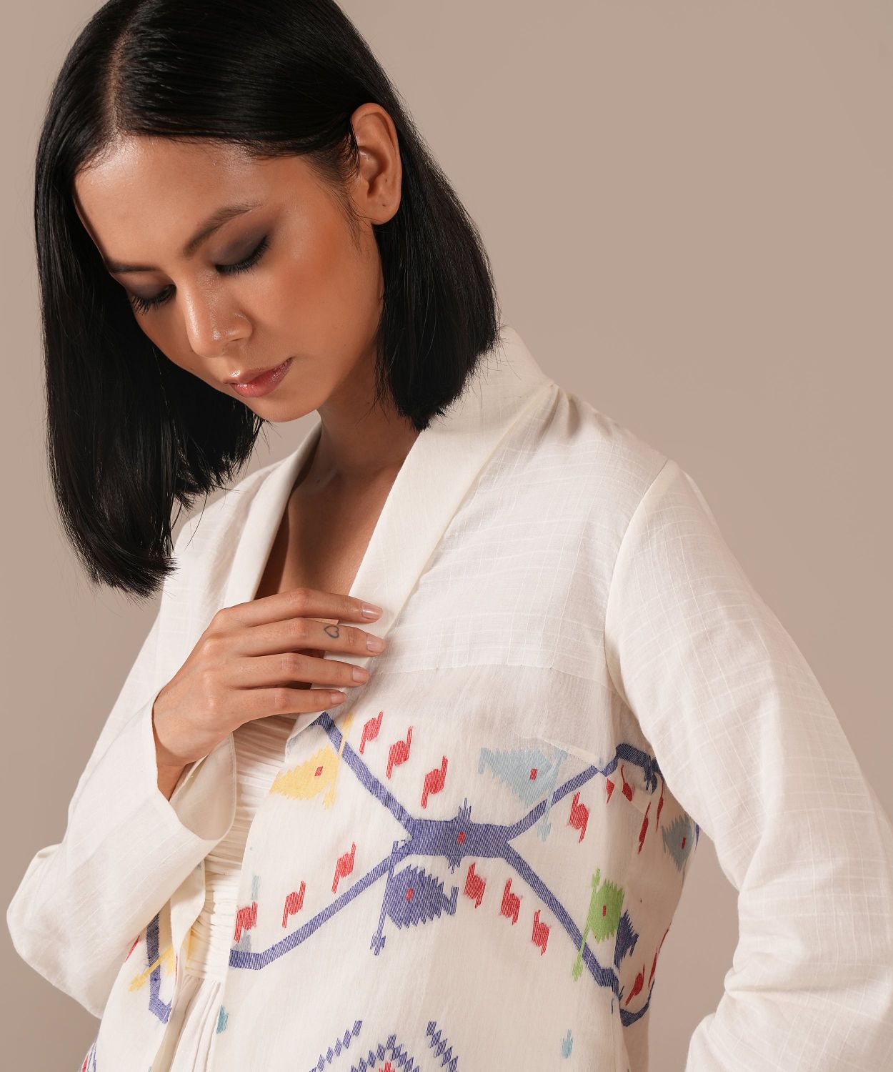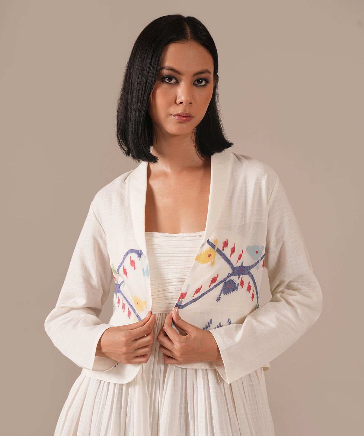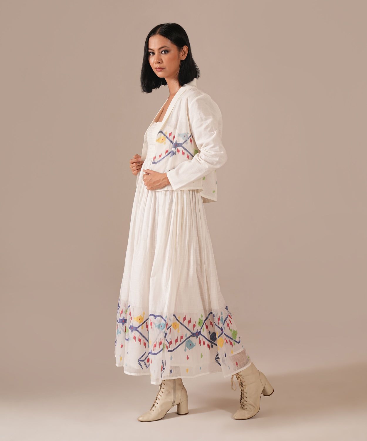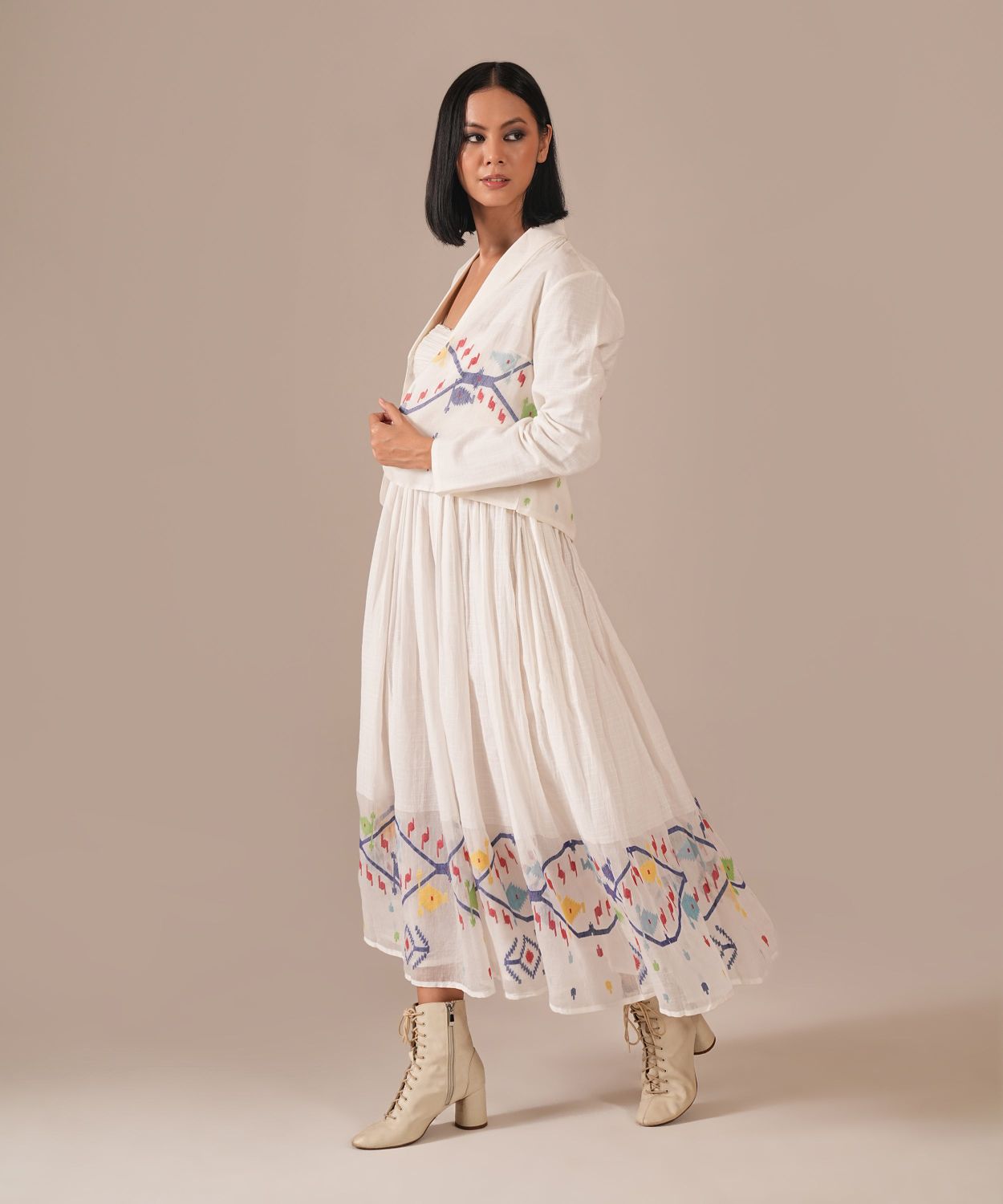 A romantic silhouette featuring a ruched bodice, gentle gathers at the empire waistline, noodle straps, back zipper fastening, and side pockets — a style that celebrates timeless femininity. Paired with its co-ord jacket, the ensemble blends grace with effortless versatility.