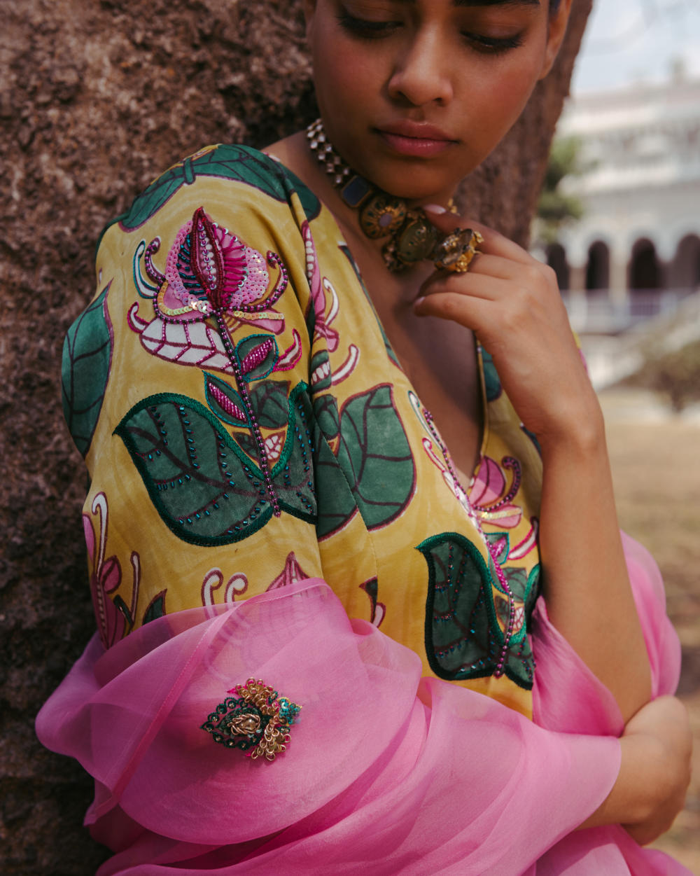 This dreamy, delicate, rosy pink organza dupatta has very inticate hand embroidered motifs featuring zari work and beading. Pair it up with anything to look a little extra dressy when you wish to, looks best with our YELLOW KURTA SET