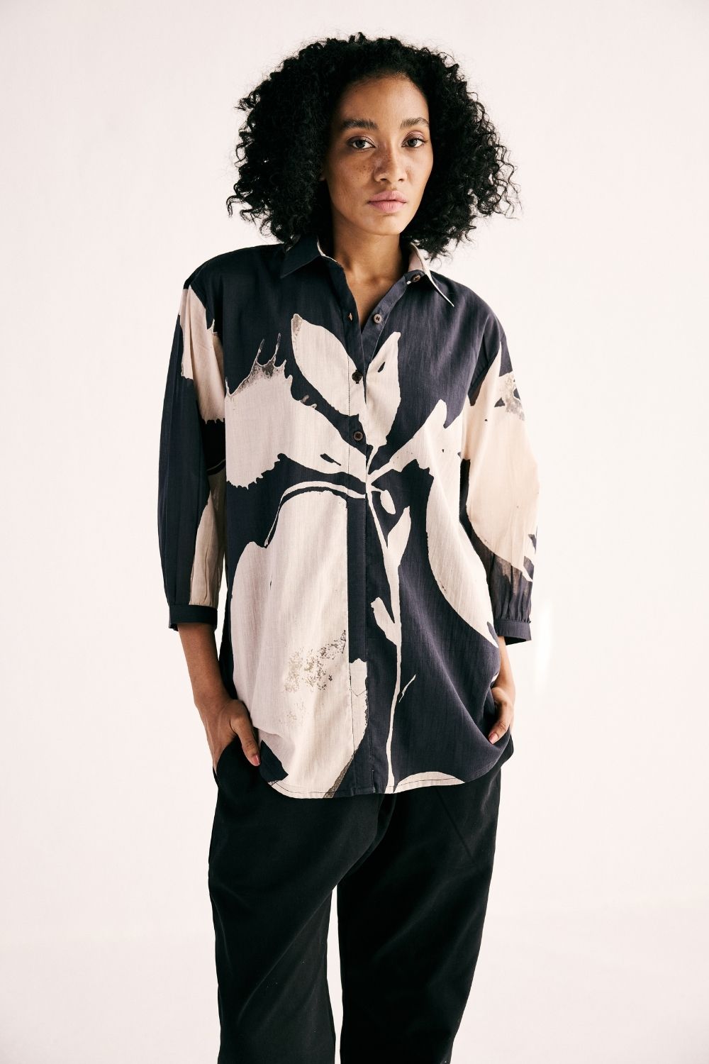 A monochromatic floral printed button down shirt crafted in breathable cotton mul.