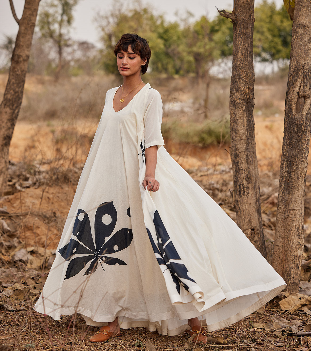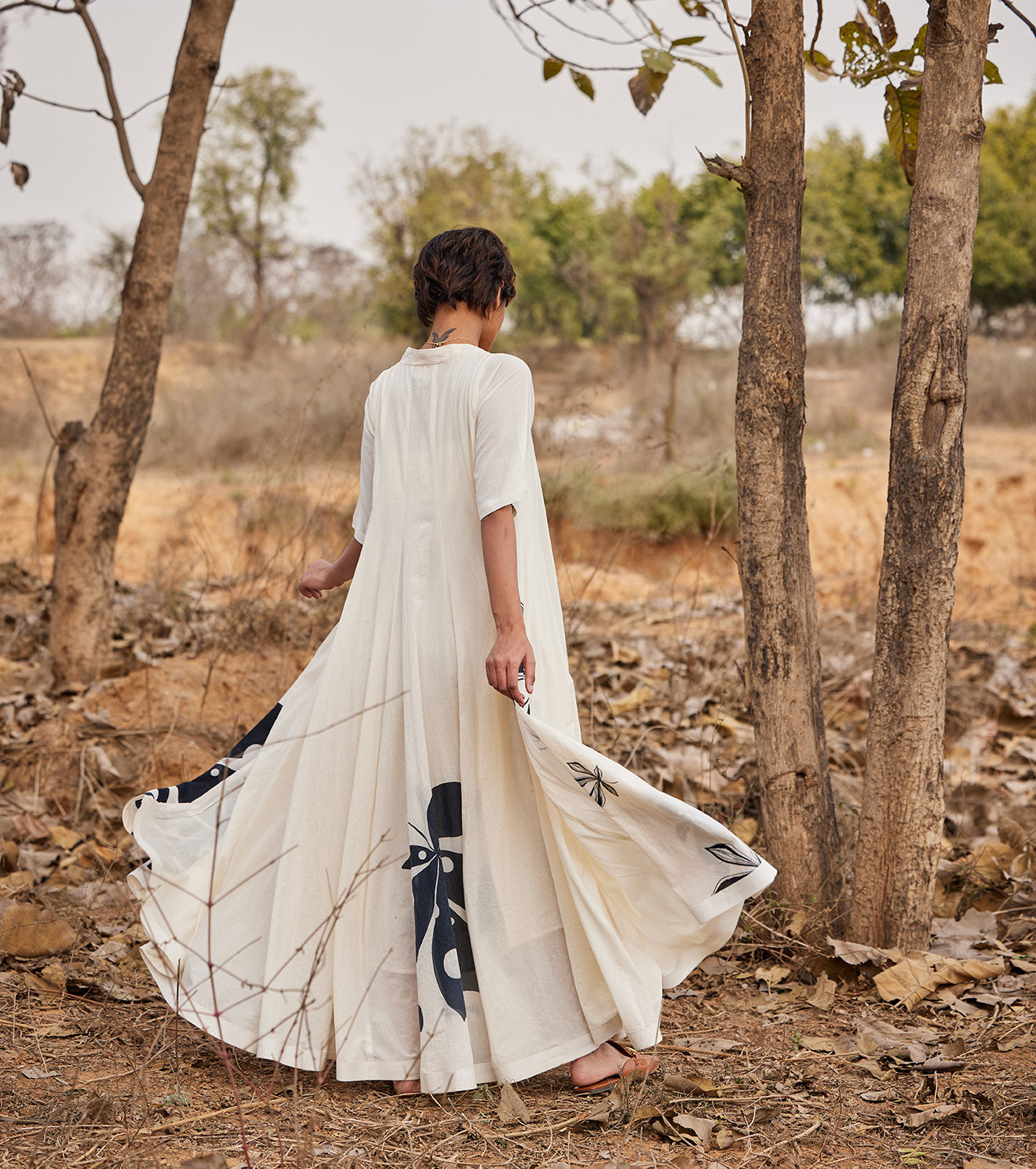 A voluminous off white maxi dress, crafted from breathable soft cotton mul fabric. adorned with a statement print. - Handcrafted in India. - Side seam pockets