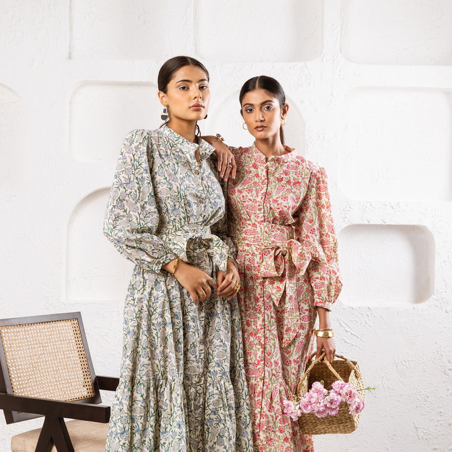Delilah - Bright like the summer sun and beautiful like the first dawn of spring. Purple florals inspired by the famous abbey gardens. Single-tier button-up shirt dress with waist accentuating belt. This is what our summer dreams are made of.
