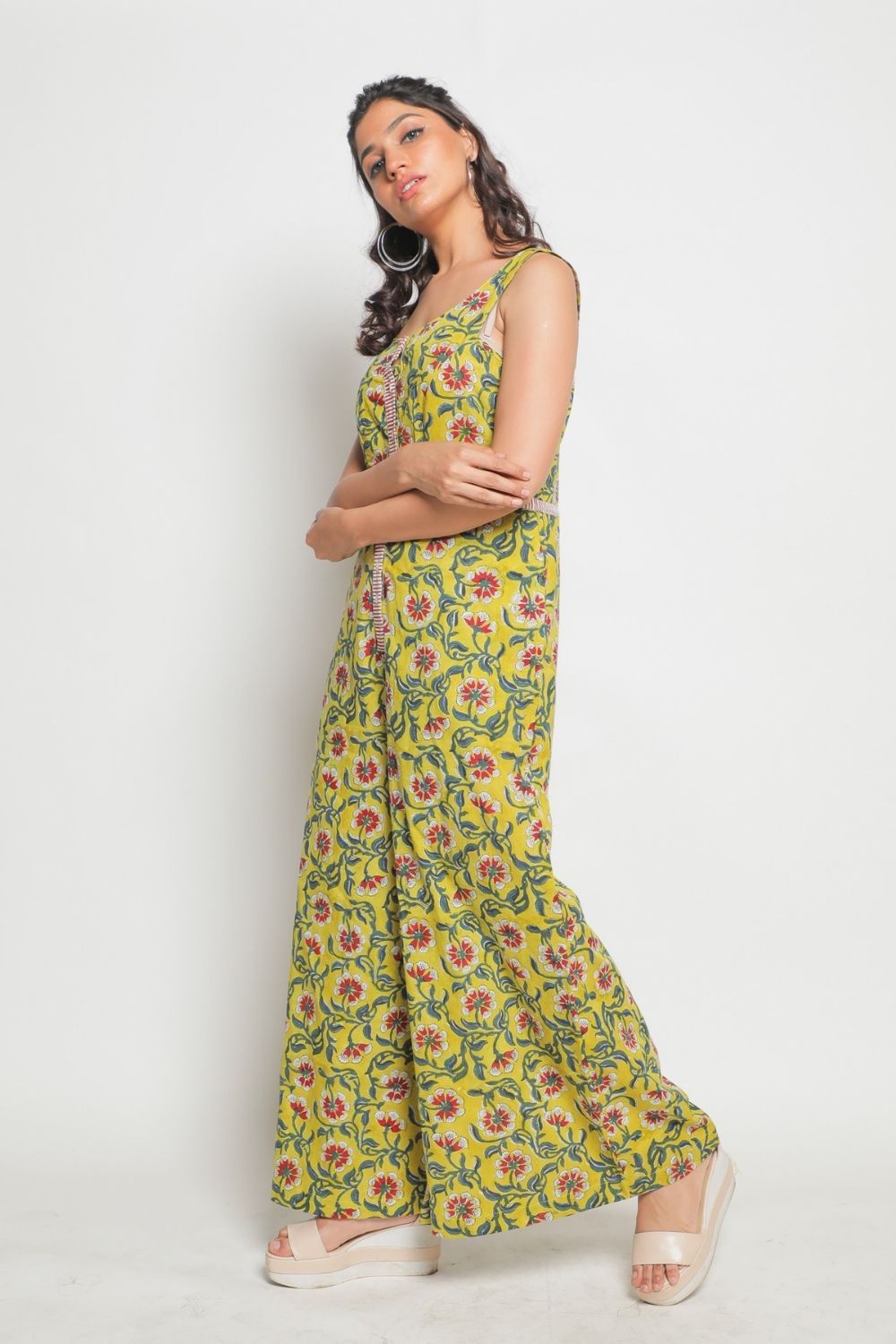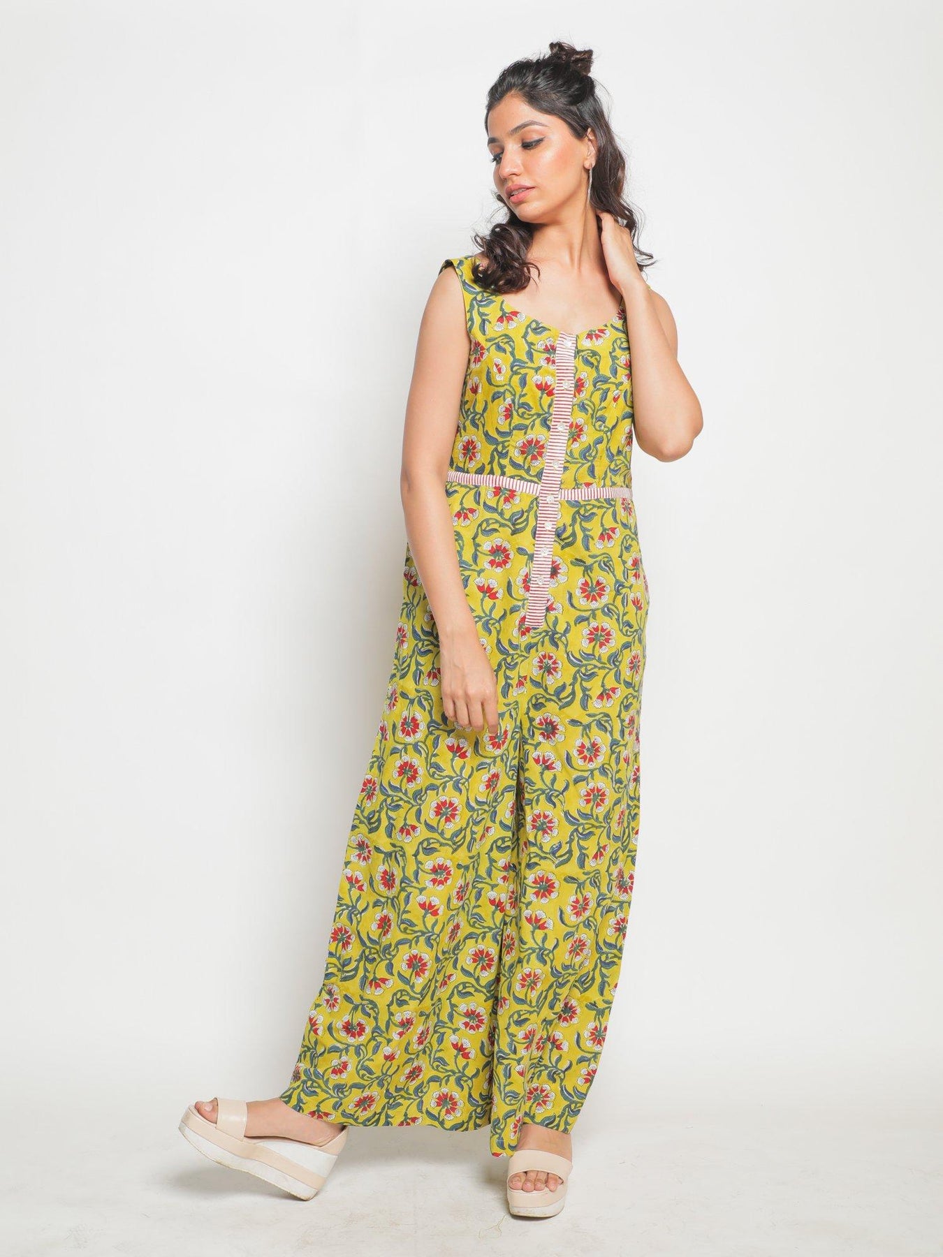 | The flattering jumpsuit is a great choice for the comfy dresser. Fitted at the bust and flared at the bottom, made from cotton block printed flower motifs in a square neck line with adjustable, button up straps. Mother of pearl button and contrast stripe detailing and comes with pockets too. |