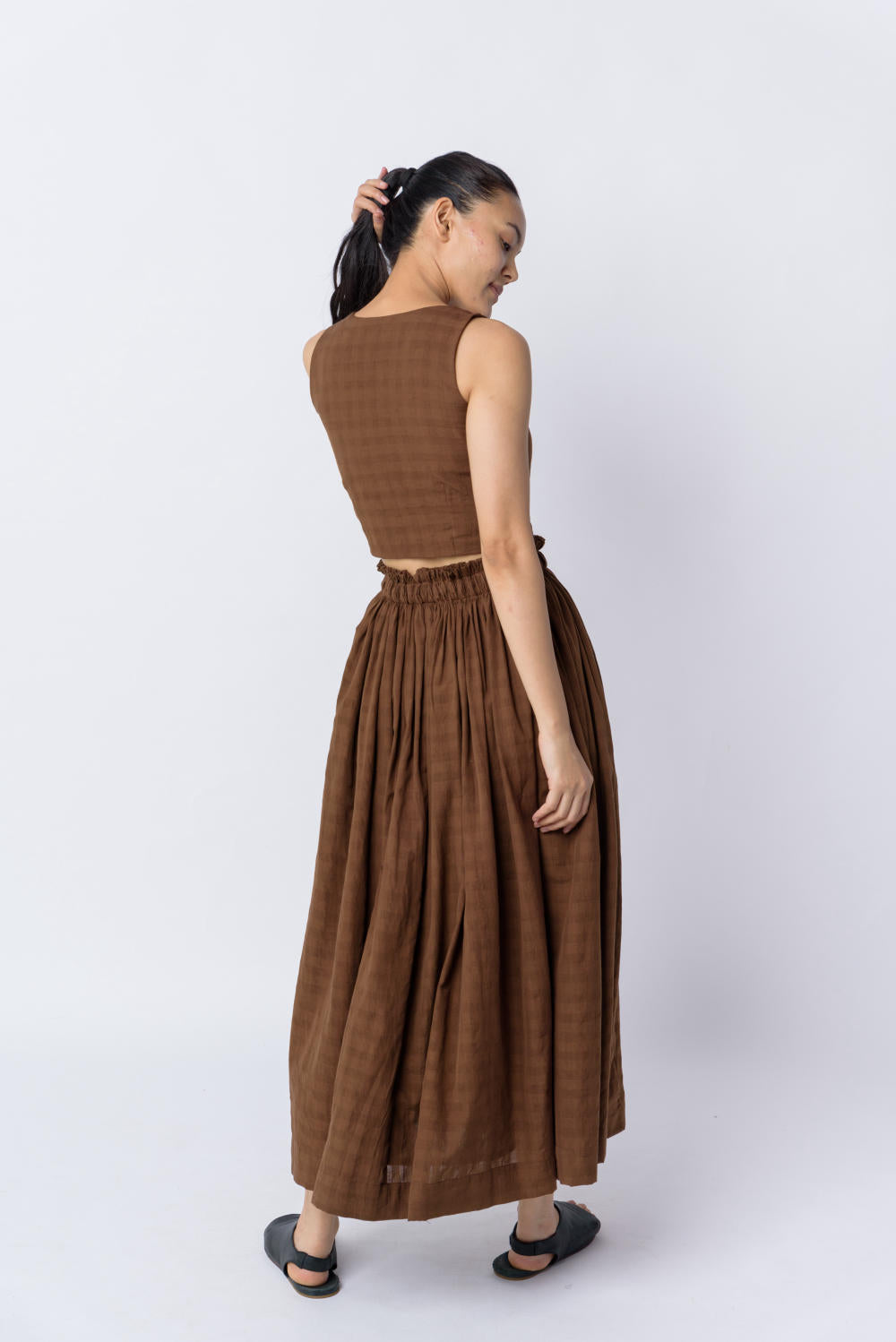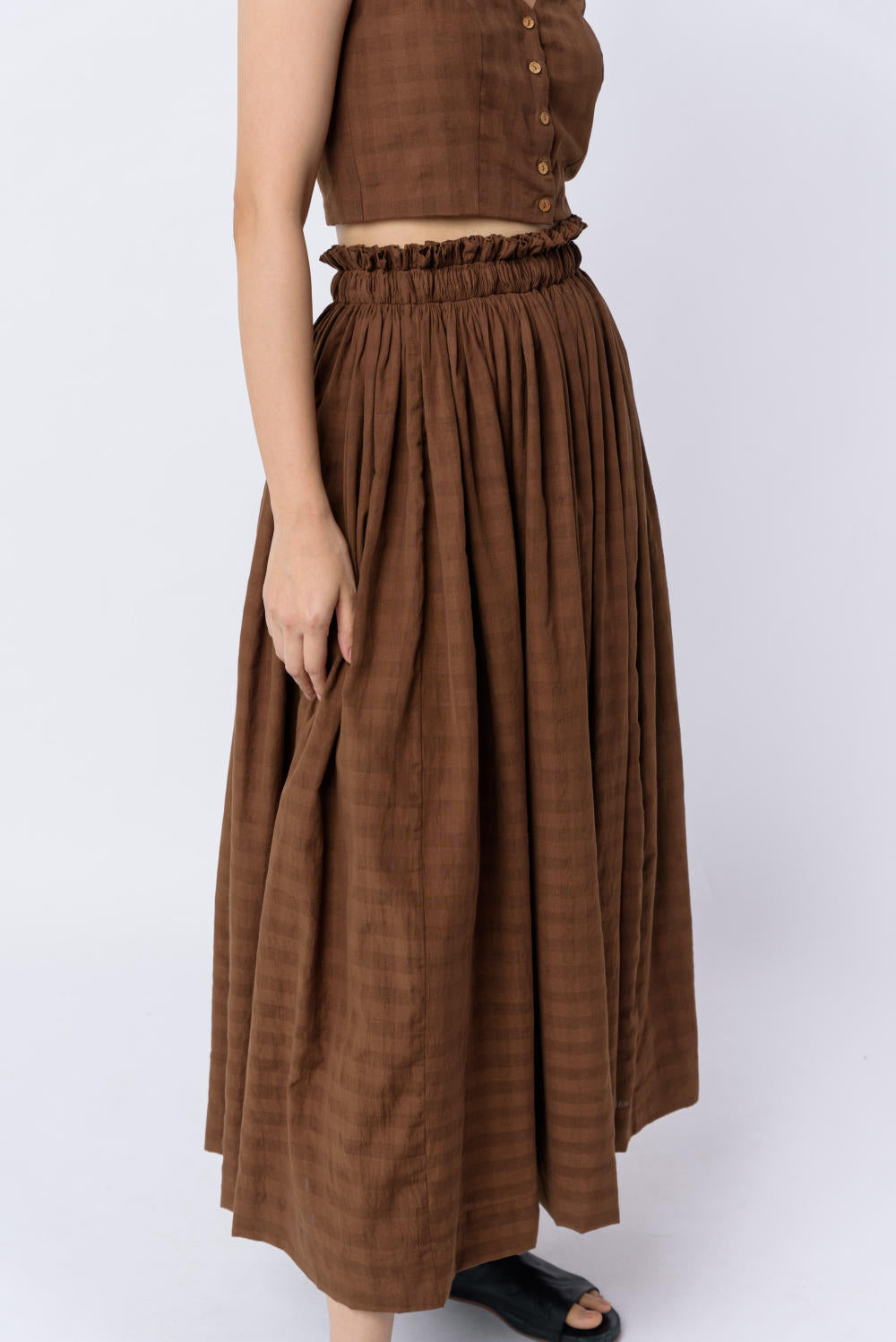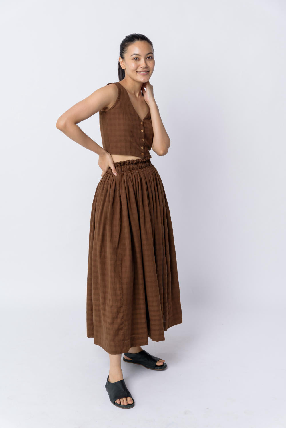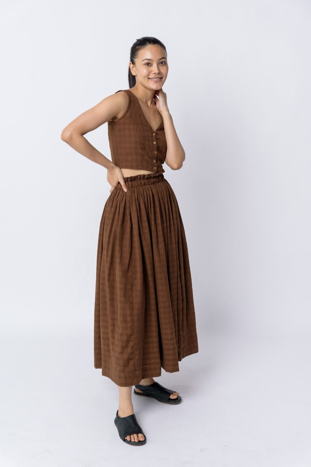 Toasted brown midi skirt is made from naturally textured organic cotton that adds a rustic element to this chic piece. It has an elasticated waist for maximum comfort, smocking details, and minimal ruffles at the waistline. Its flowy hem falls at the mid-calf line. Style it with basic t-shirts or strappy tops for ease and enhancement.