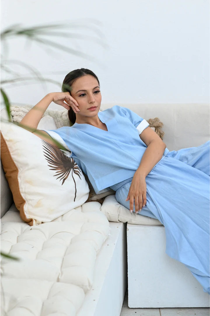 A casual coord featuring an oversized top with drop sleeves striped with solid white paired with wrap around linen pants that cinch and flare. Embroidered across the back with Zanzibar’s signature giraffe motif. Perfect for a day of travel and adventure across the Aegean coast.