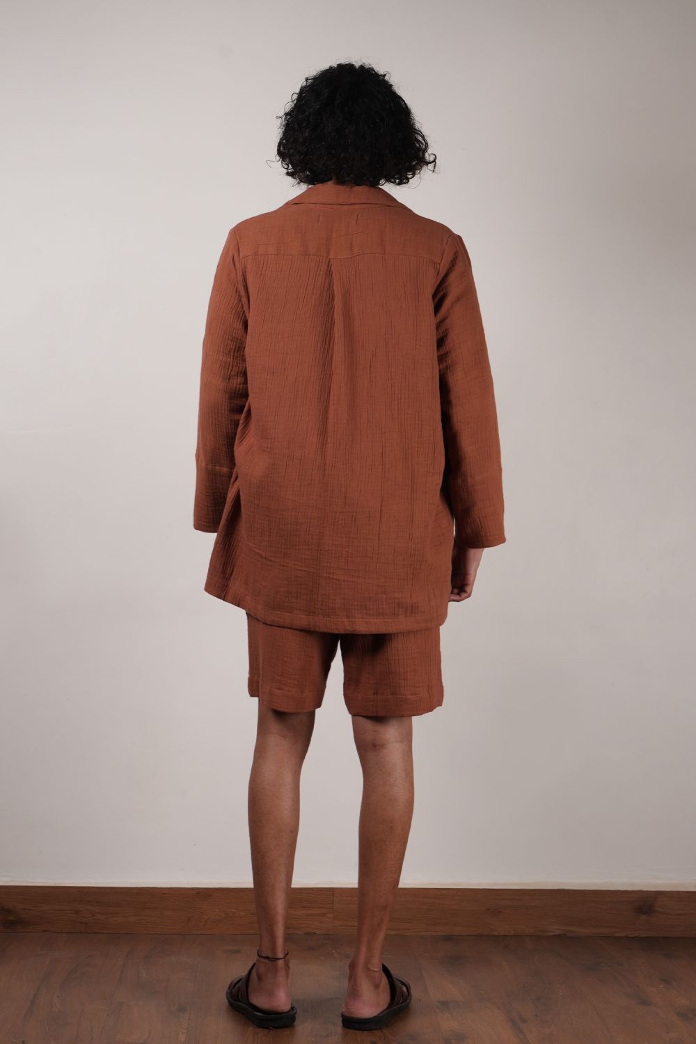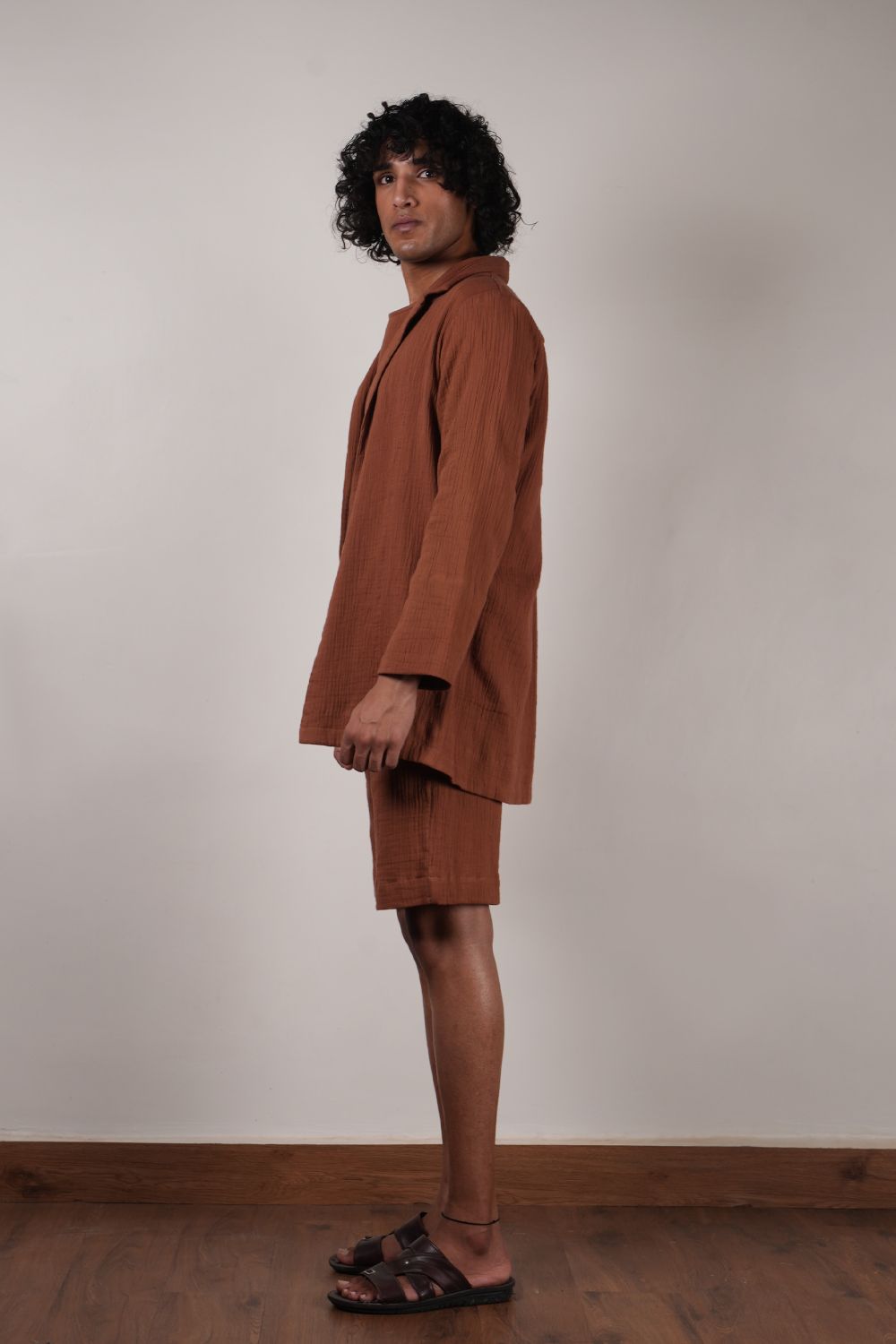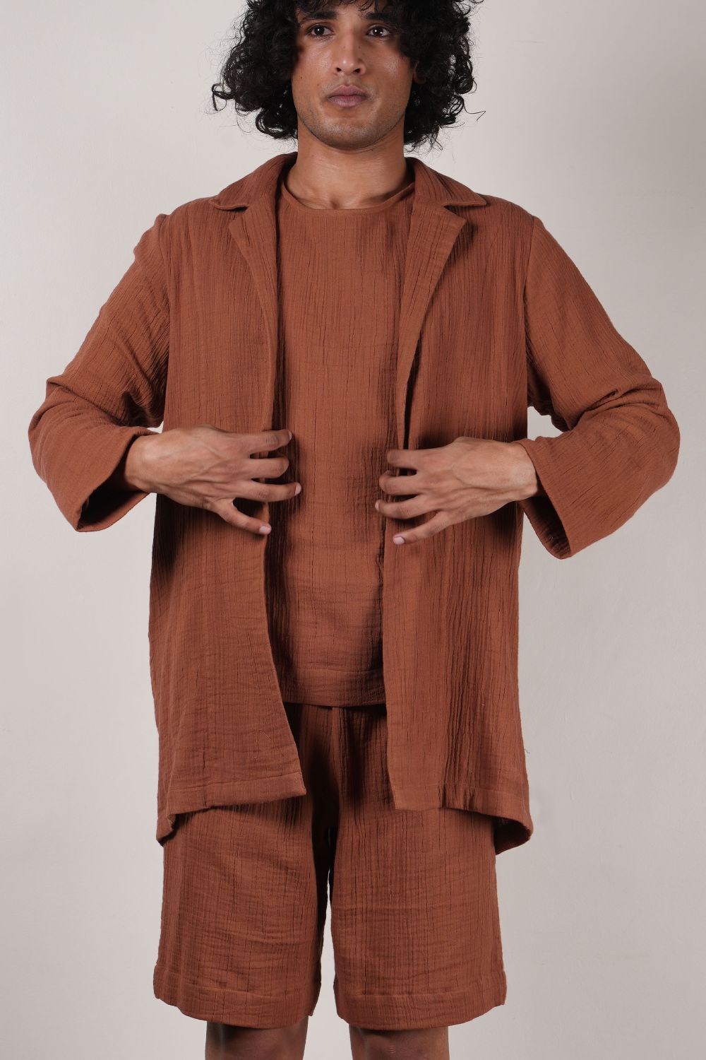 A comfort fit t-shirt with side shoulder zipper opening and extended sleeves comes with crush cotton shorts with fully elasticated waist and crush jacket all made in 100% natural cotton. Total 3 pcs.
