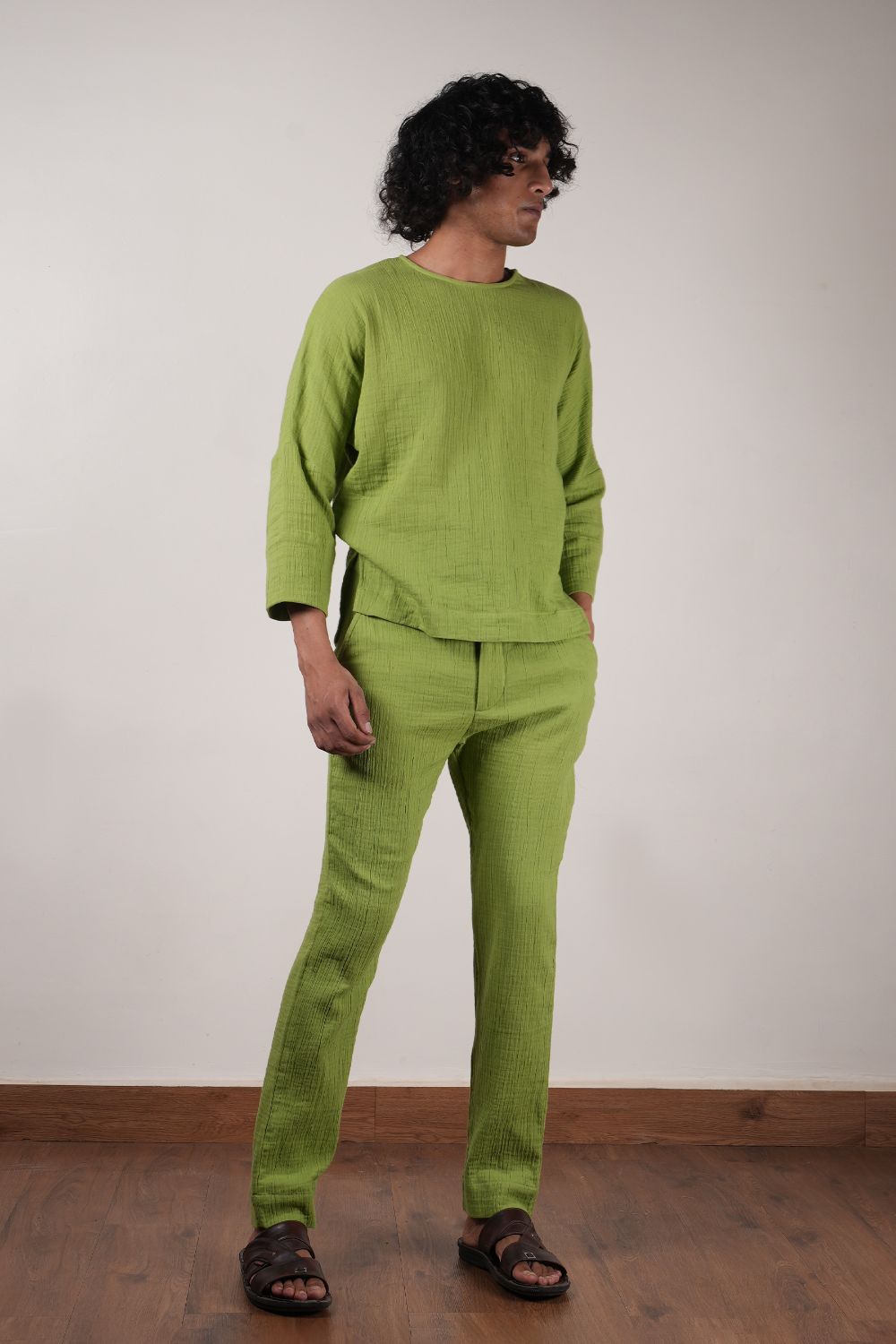 A comfort fit t-shirt with side shoulder zipper opening and extended sleeves comes with crush cotton pants both made in 100% natural cotton. Total 2 pcs.