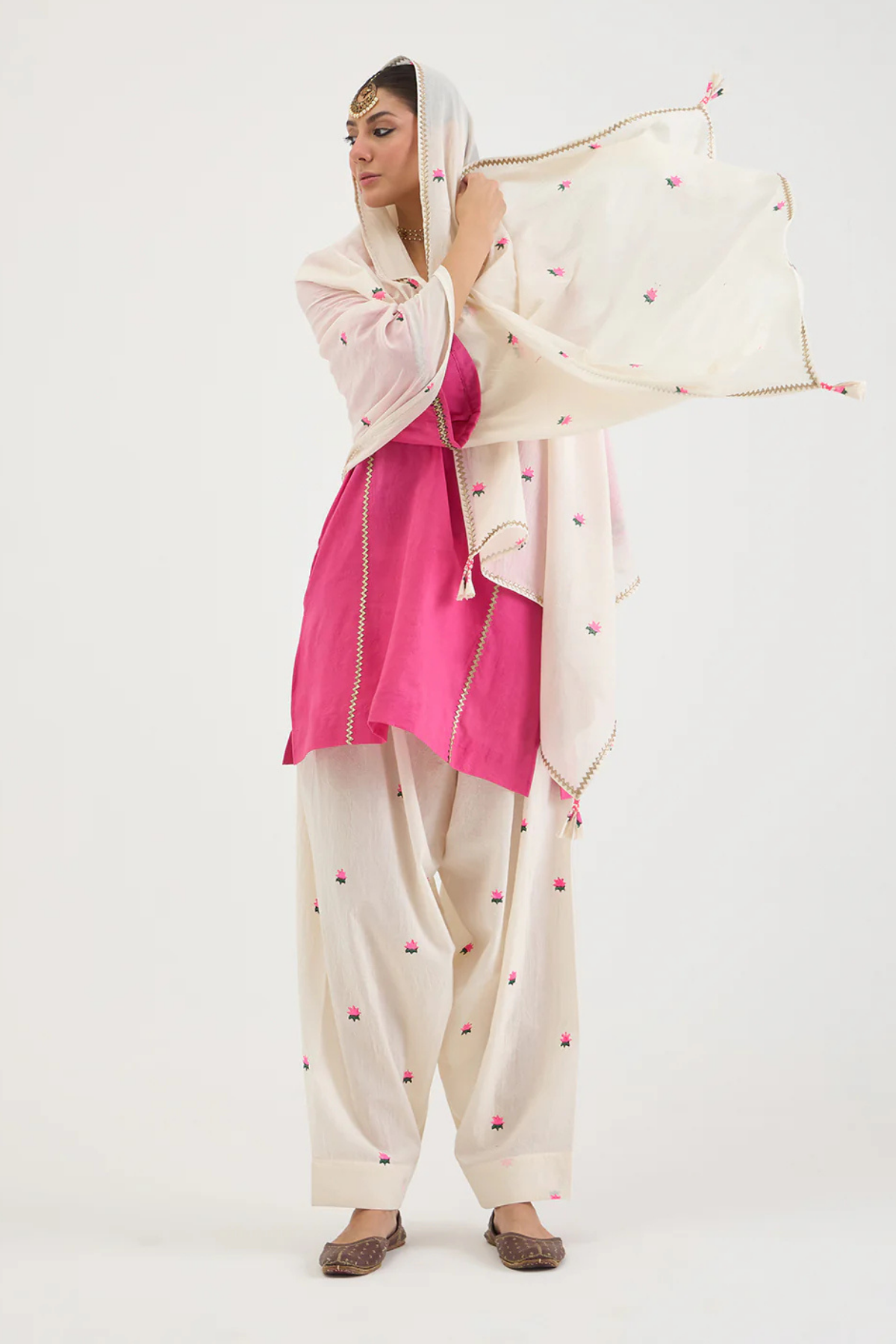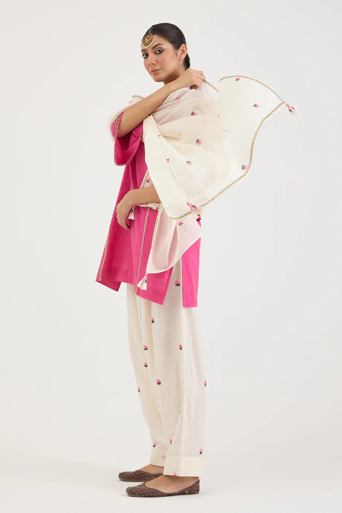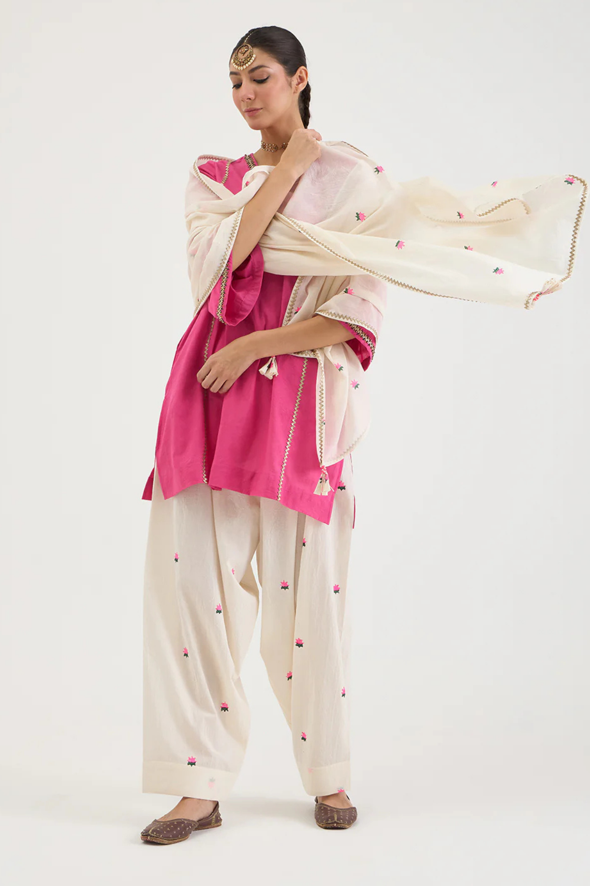 At Canvas & Weaves, we see Aavidi as part of a larger conversation about what it means to dress with intention. These are pieces for women who desire ease without erasing elegance — garments that serve, move, and accompany rather than dictate. Aavidi’s kalidaar kurtas, finished with delicate sacha gota work, exemplify this balance. Classic lines meet modern restraint, pairing effortlessly with salwars adorned in thoughtful gota motifs.