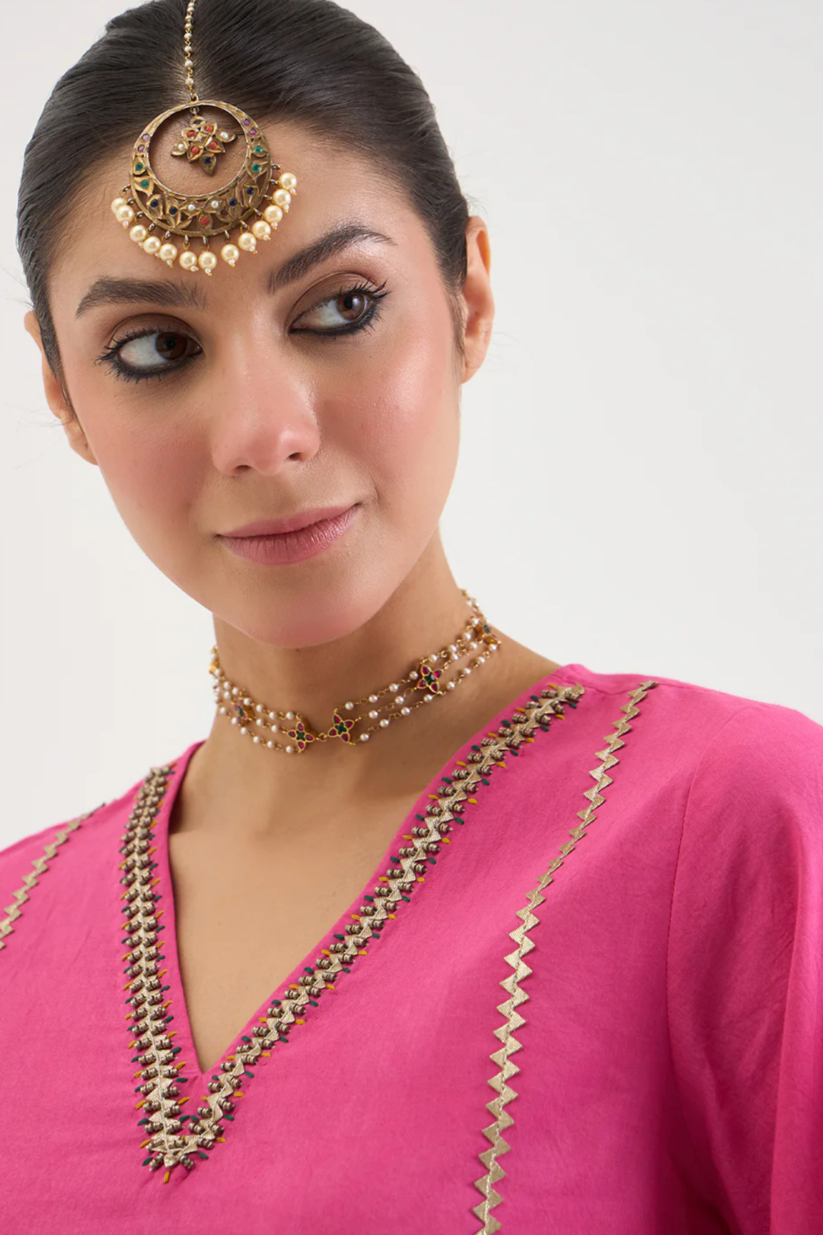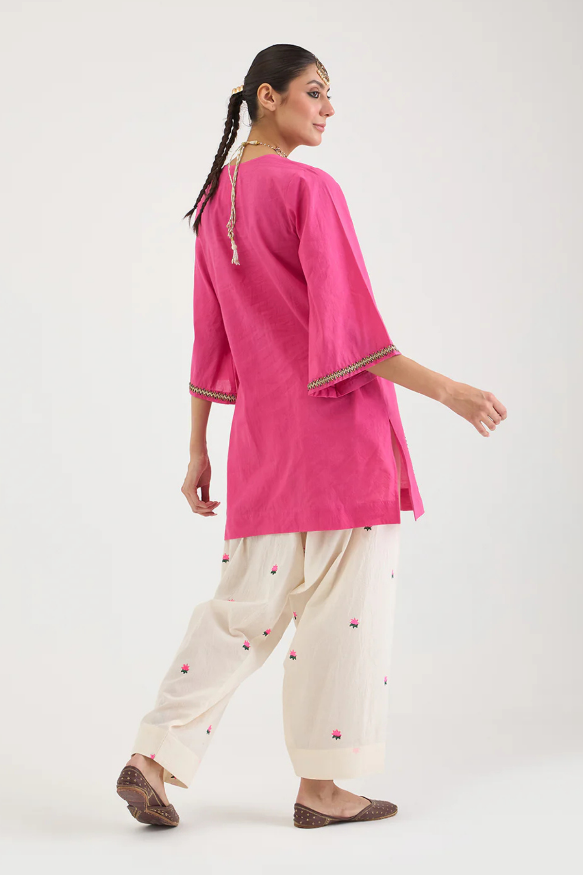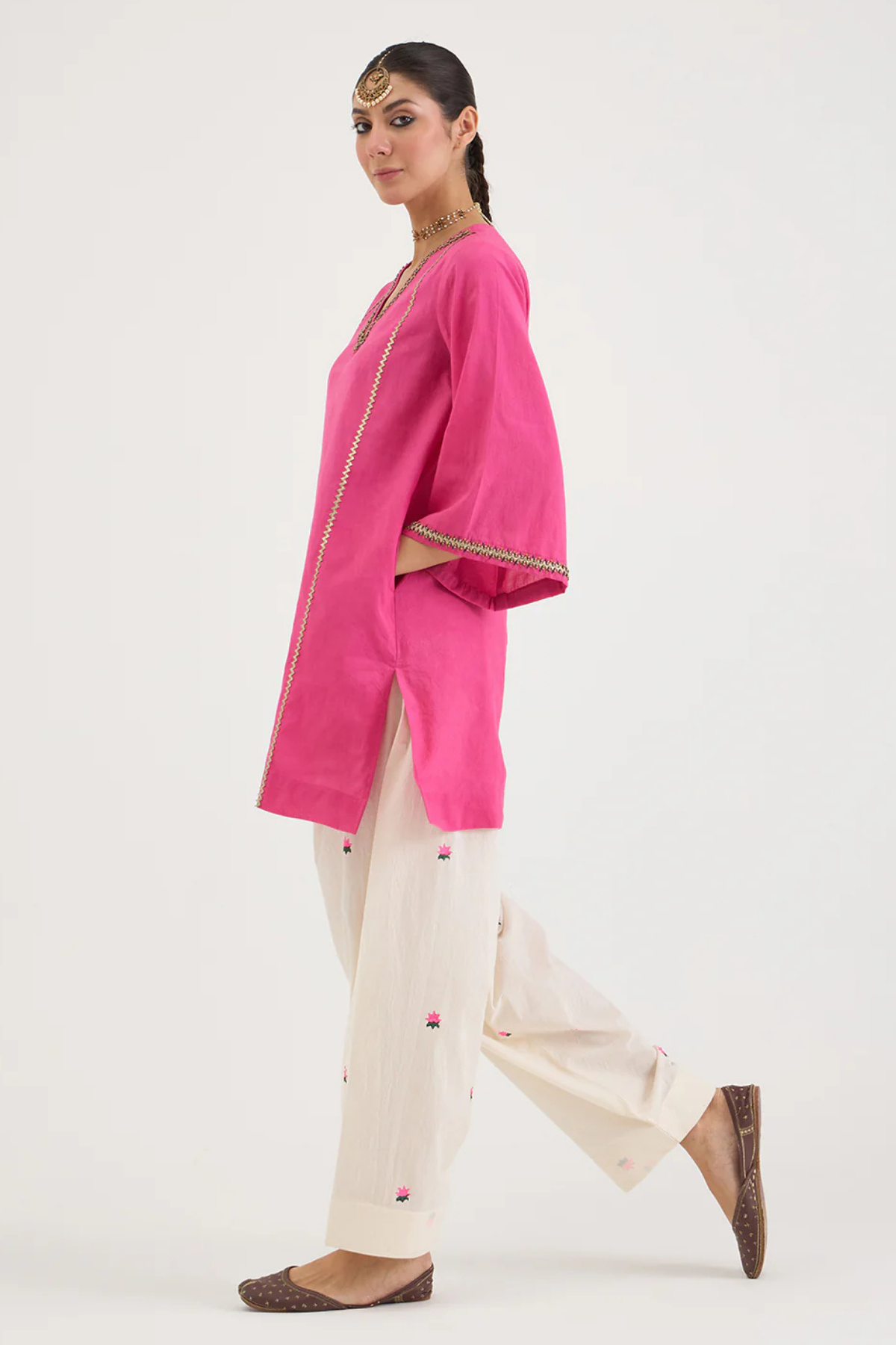 Kalidaar short pink kurta emblished with gota on the kali, intricate hand embroidery on the v-neck and sleeves, paired up with printed farsi pant.