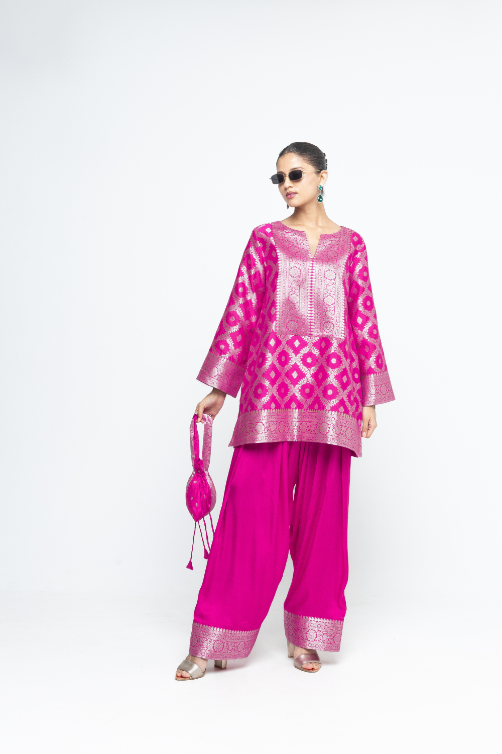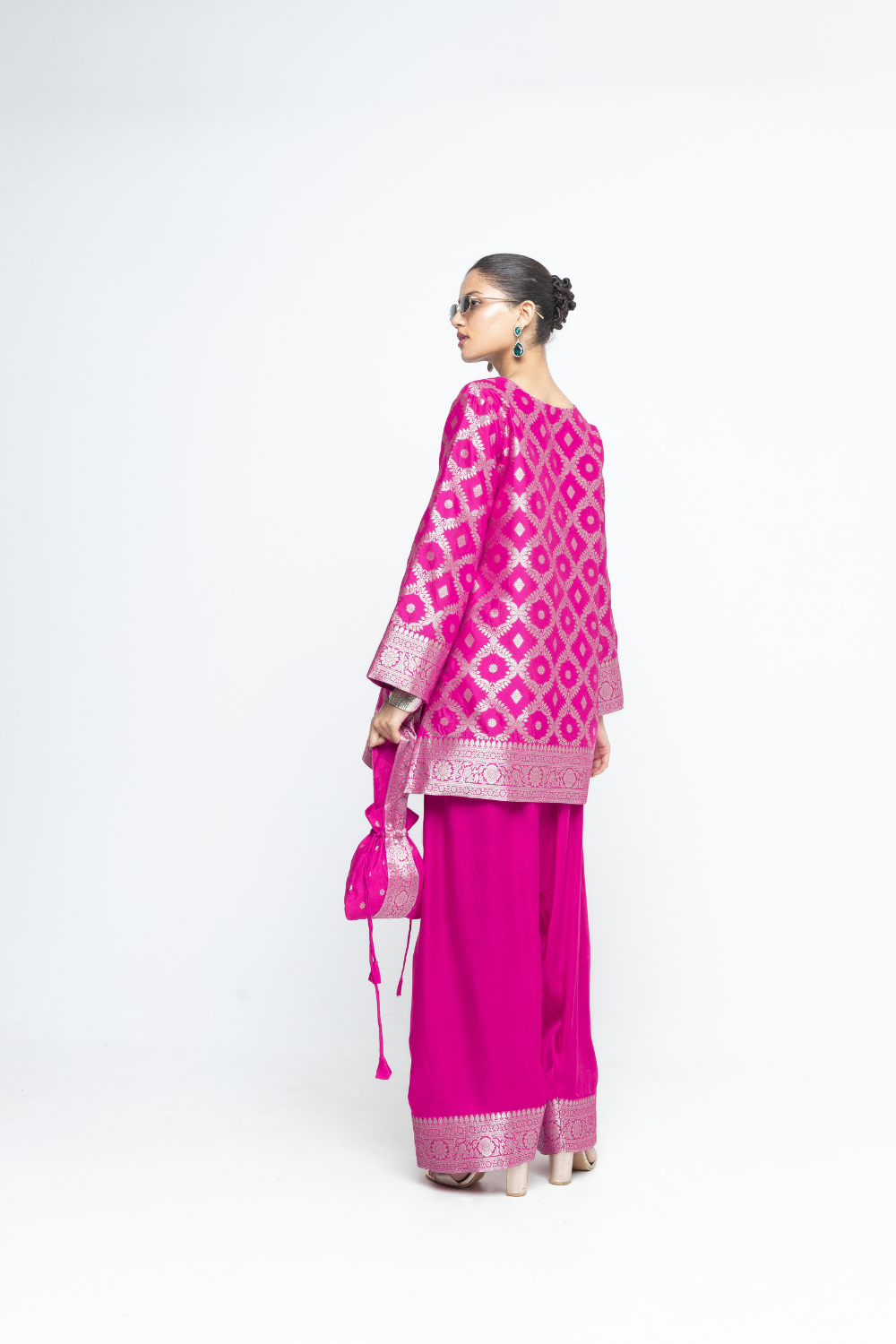 Pink Jaal Silk Kurta with woven brocade details on neck sleeves and bottom paired with matching Farshi salwar with brocade details at the hem.