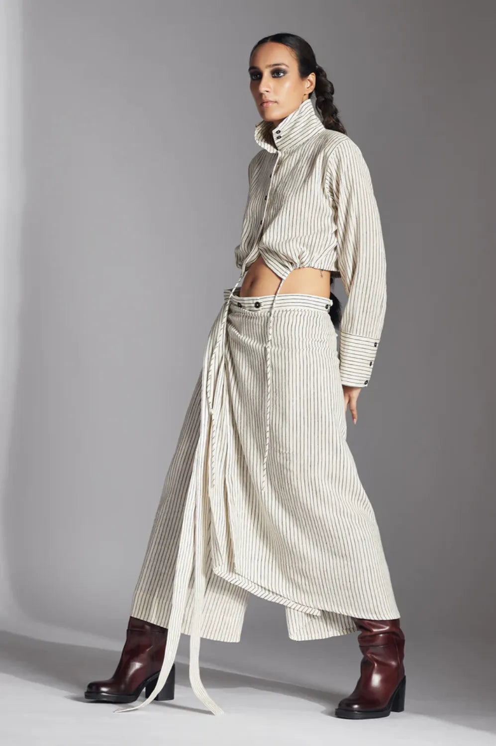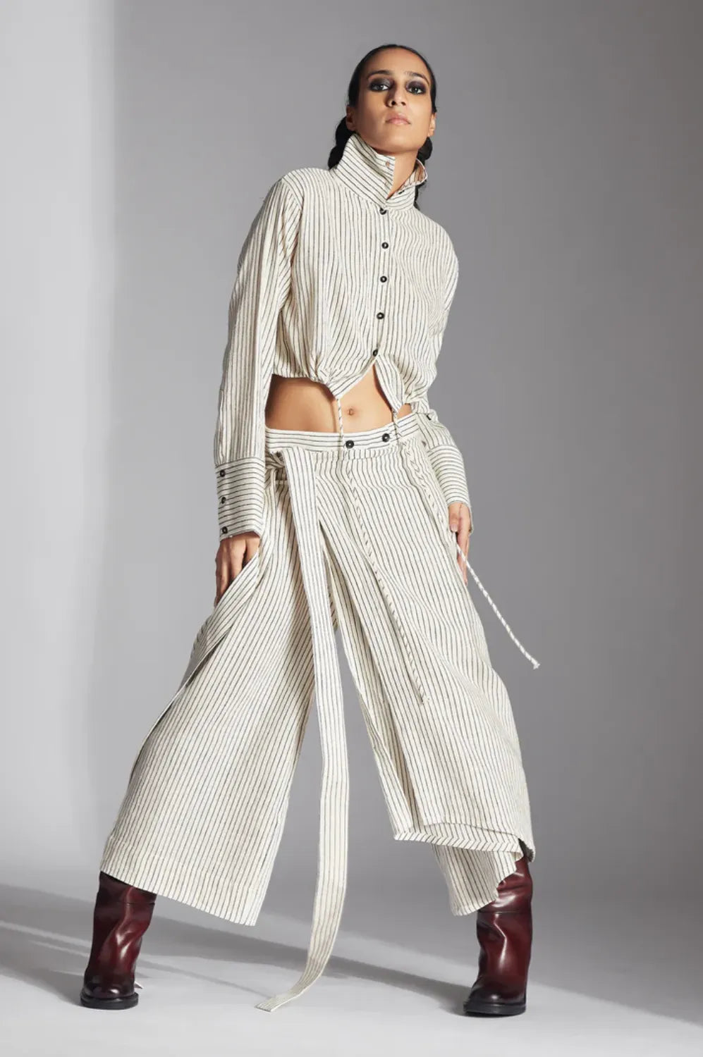 Chola’s universe begins with thoughtful materials. Recycled cottons, post-consumer fabrics, and free-cutting techniques come together in a kind of mindful choreography—one that honours form without creating waste, and prioritises movement over rigidity. This is clothing that feels lived-in yet architectural; pared-back yet quietly avant-garde.