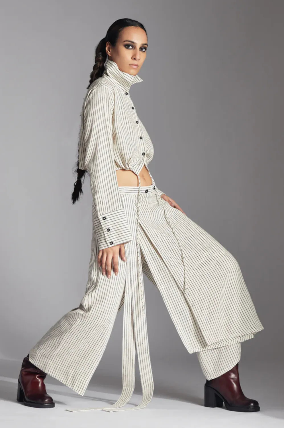 Edith is a pair of one-sided overlap trousers that features a button fastening and a zip. Additionally it has a tie up belt at the waist that can be styled in different ways and epaulettes with buttons for adjusting the waist.