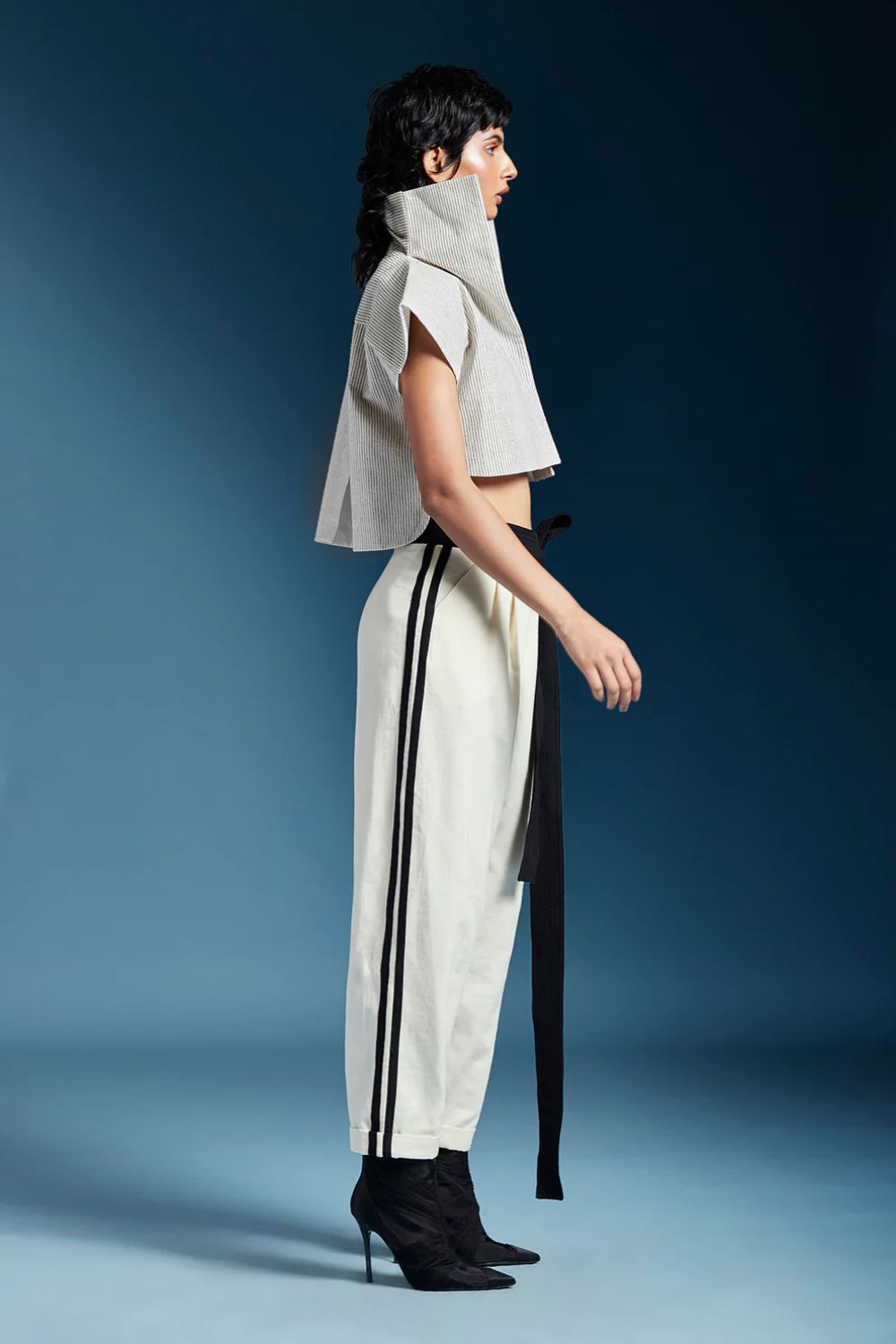 NARROW BOTTOM WITH FRONT PLEATS, DOUBLE STRIPE PANEL ON THE SIDE, BOTTOM FOLD AND CROSS POCKETS.