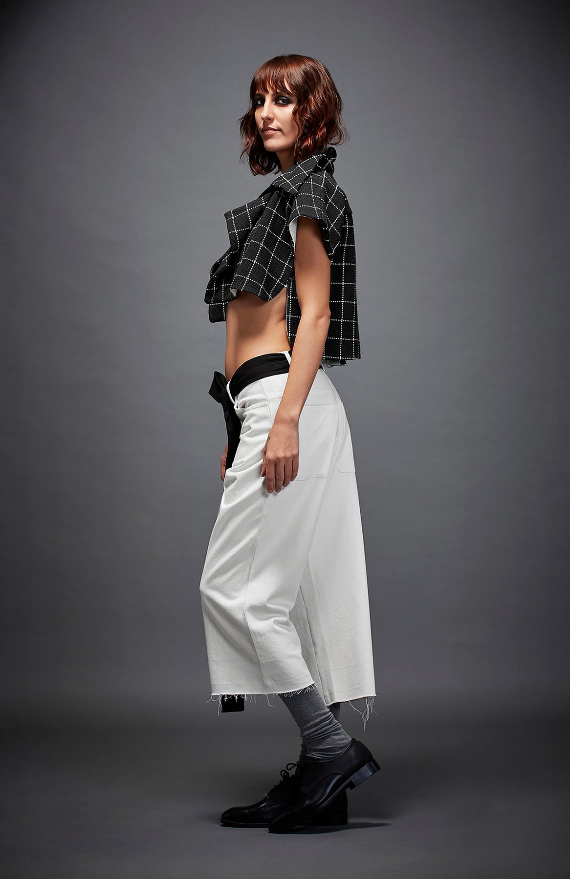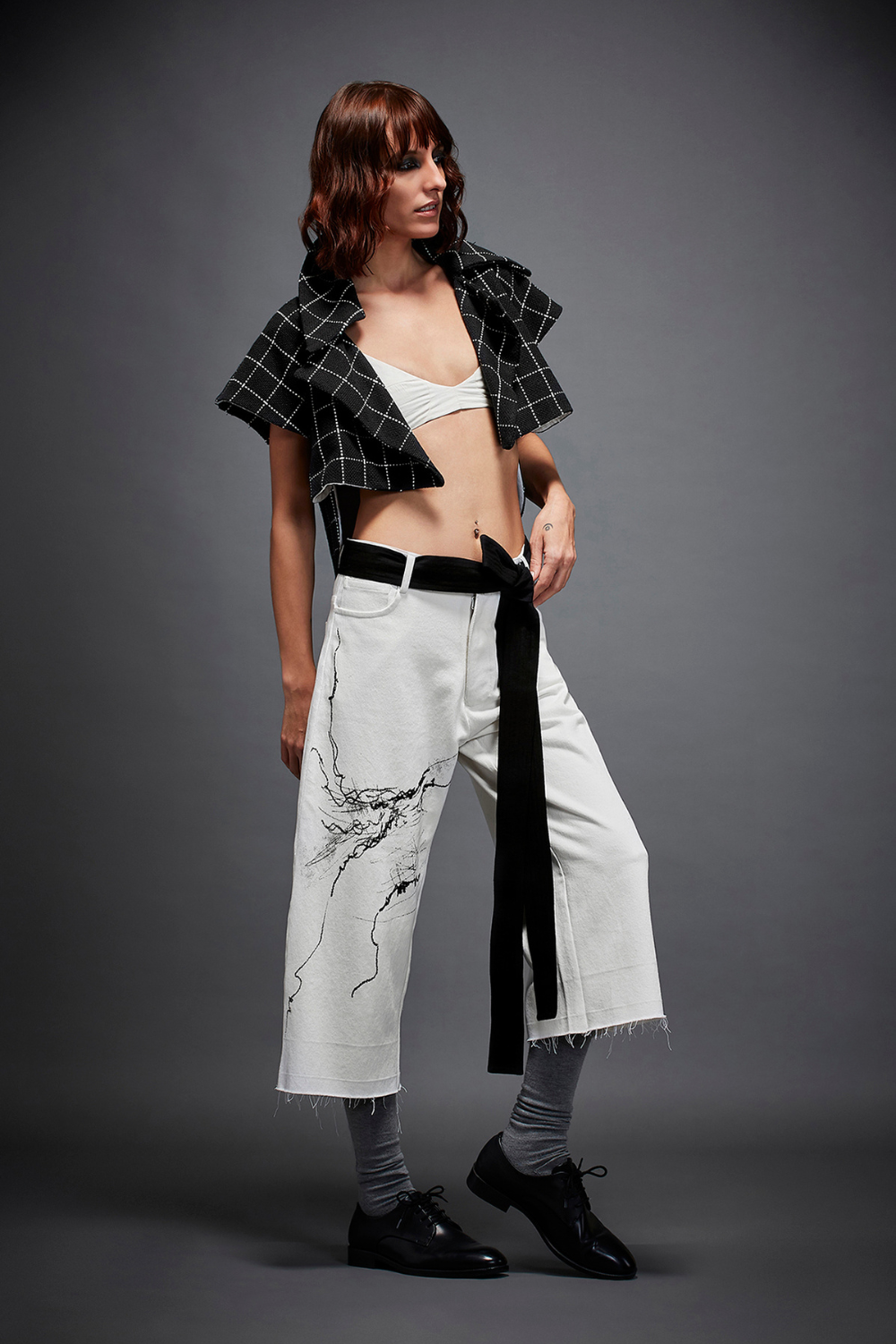 CROPPED PRINTED TROUSERS WITH NARROW BOTTOM ROUND, CROSS POCKETS, RAW HEMLINE AND A CONTRAST BELT