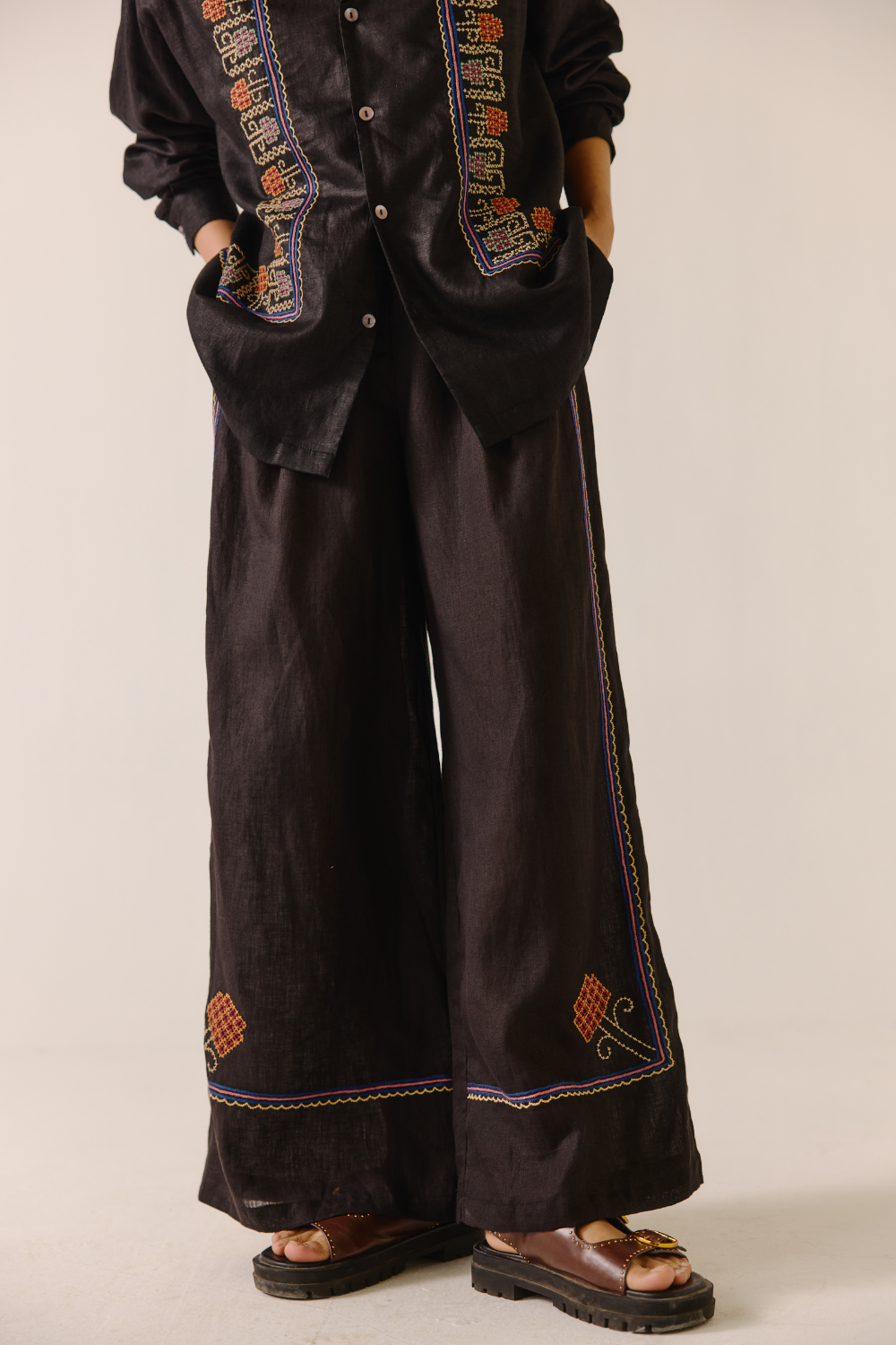 The Lounge Pants with Cross-Stitch Embroidery are a perfect fusion of comfort and craftsmanship. Made from 100% pure linen, these relaxed-fit pants feature delicate cross-stitch embroidery, adding an artisanal touch to their minimal silhouette. Designed for ease of movement and breathability, they offer a timeless, laid-back elegance ideal for effortless styling.