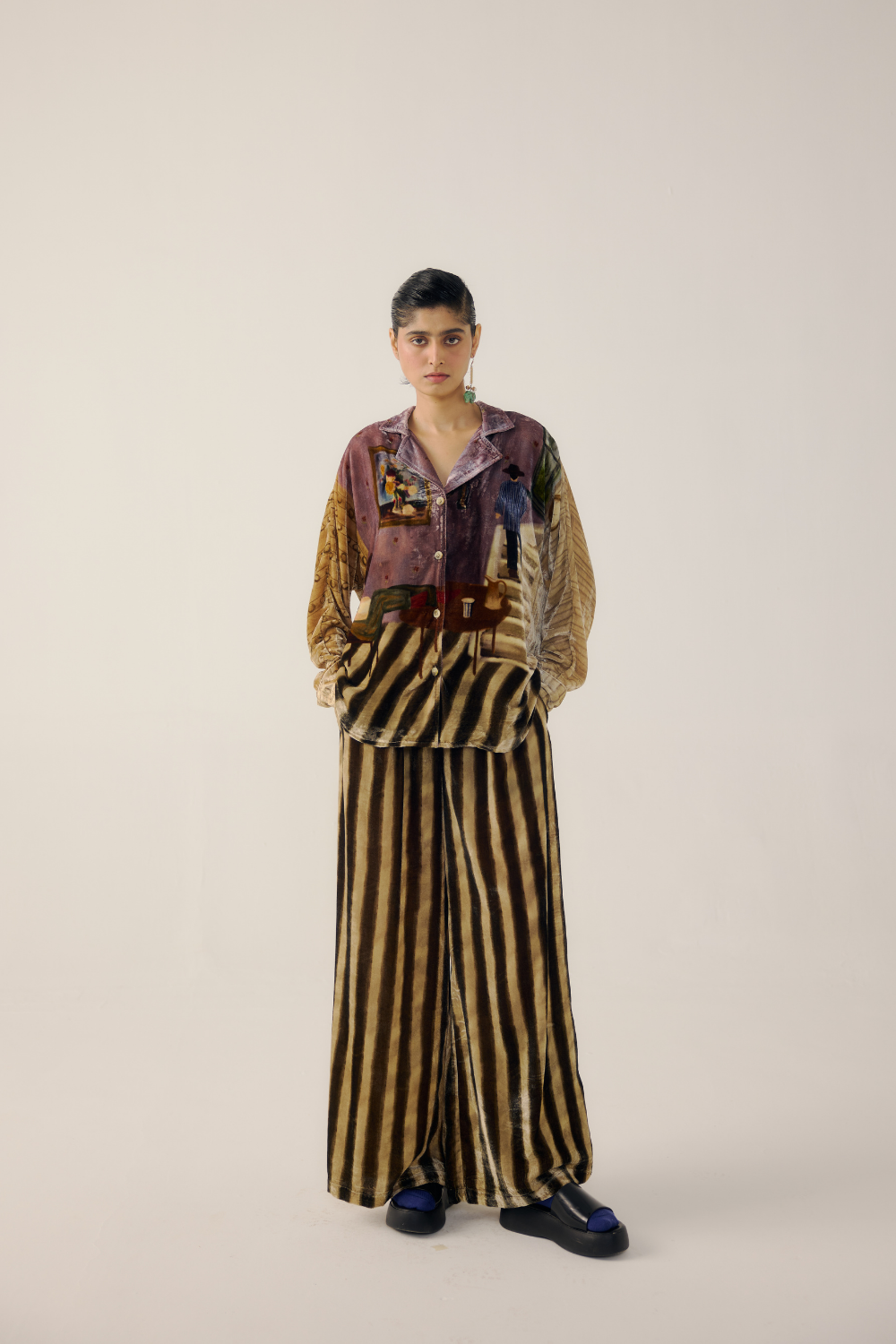 CORD blurs the line between art and attire in a way few labels dare to. Here, fabrics become canvases; illustrations—drawn by hand, steeped in imagination—flow across silhouettes that feel sculptural yet deeply wearable. Each piece has a texture of memory to it, as if it carries echoes of a past life, now reframed for a contemporary world.