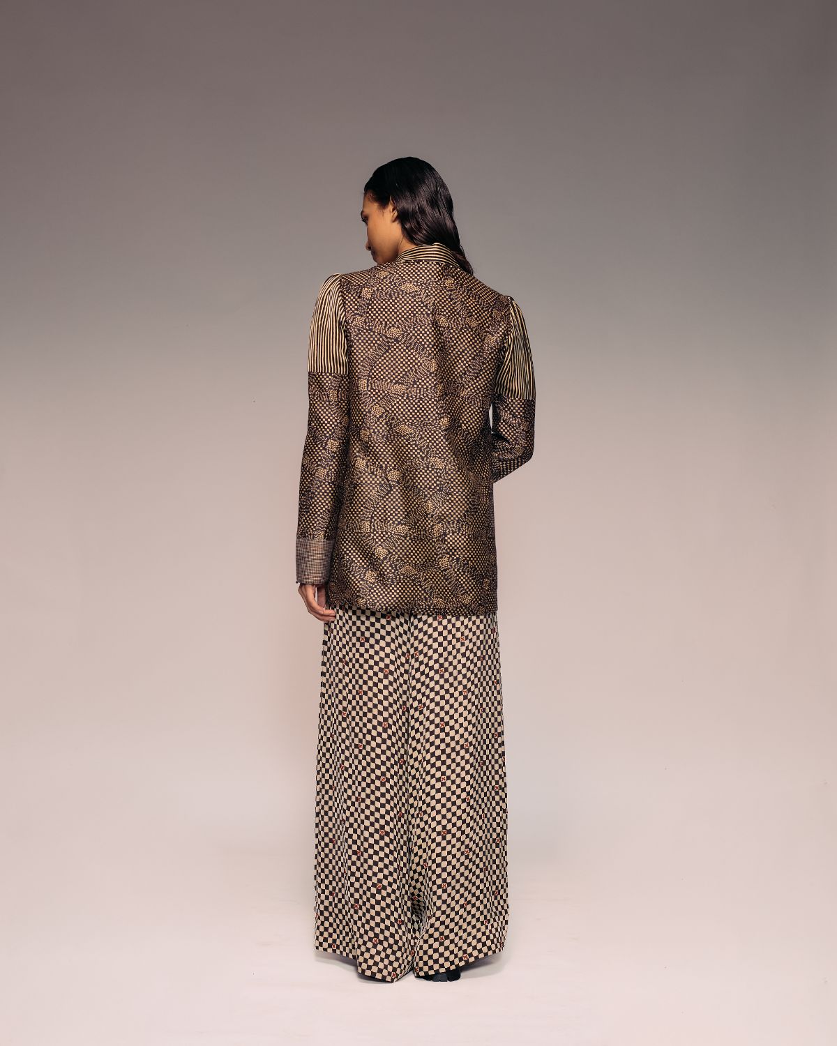 Crafted in luxurious silk satin, these Ajrakh Check Wide Trousers feature