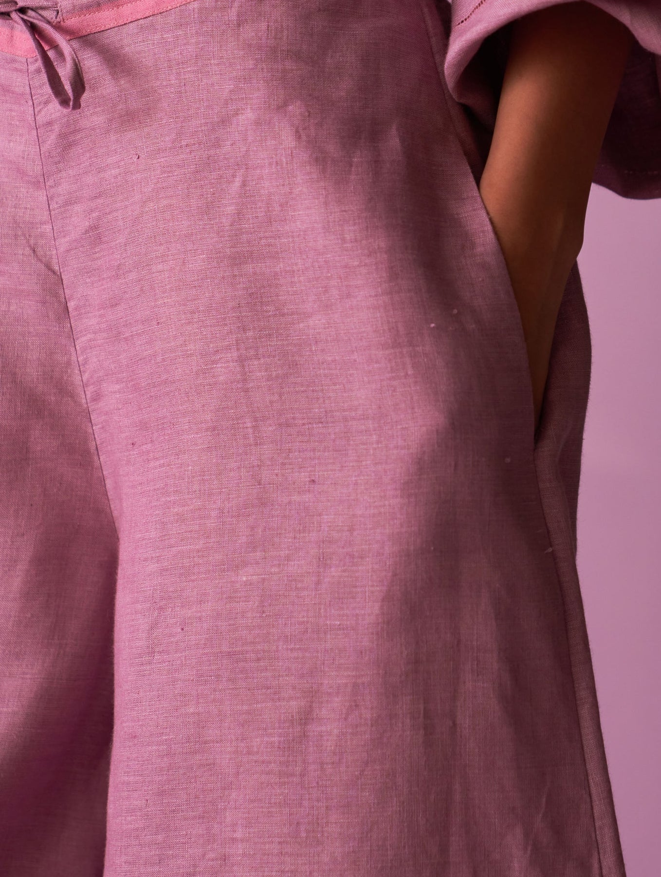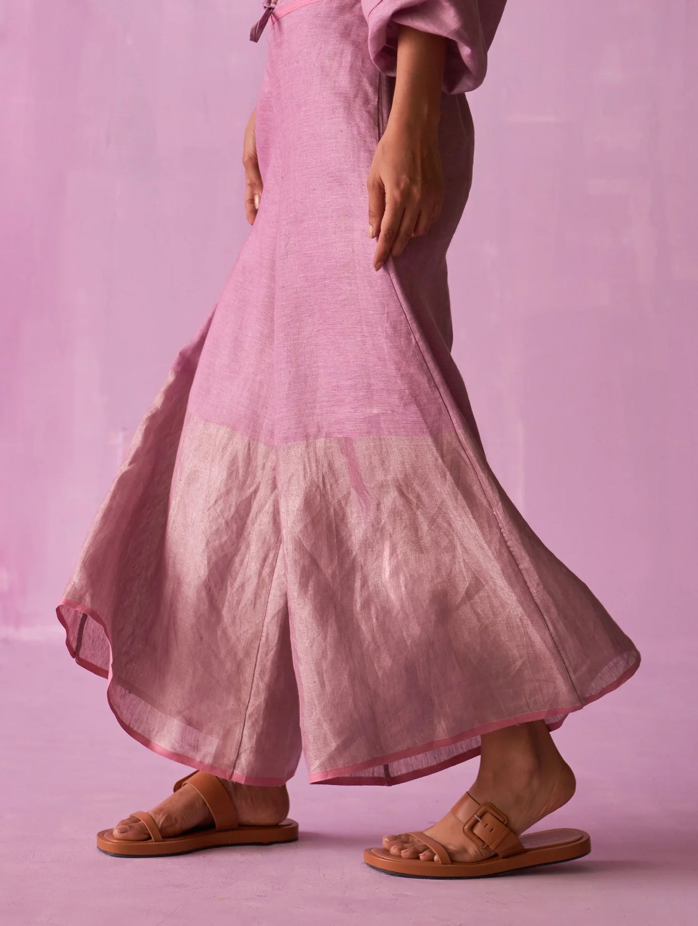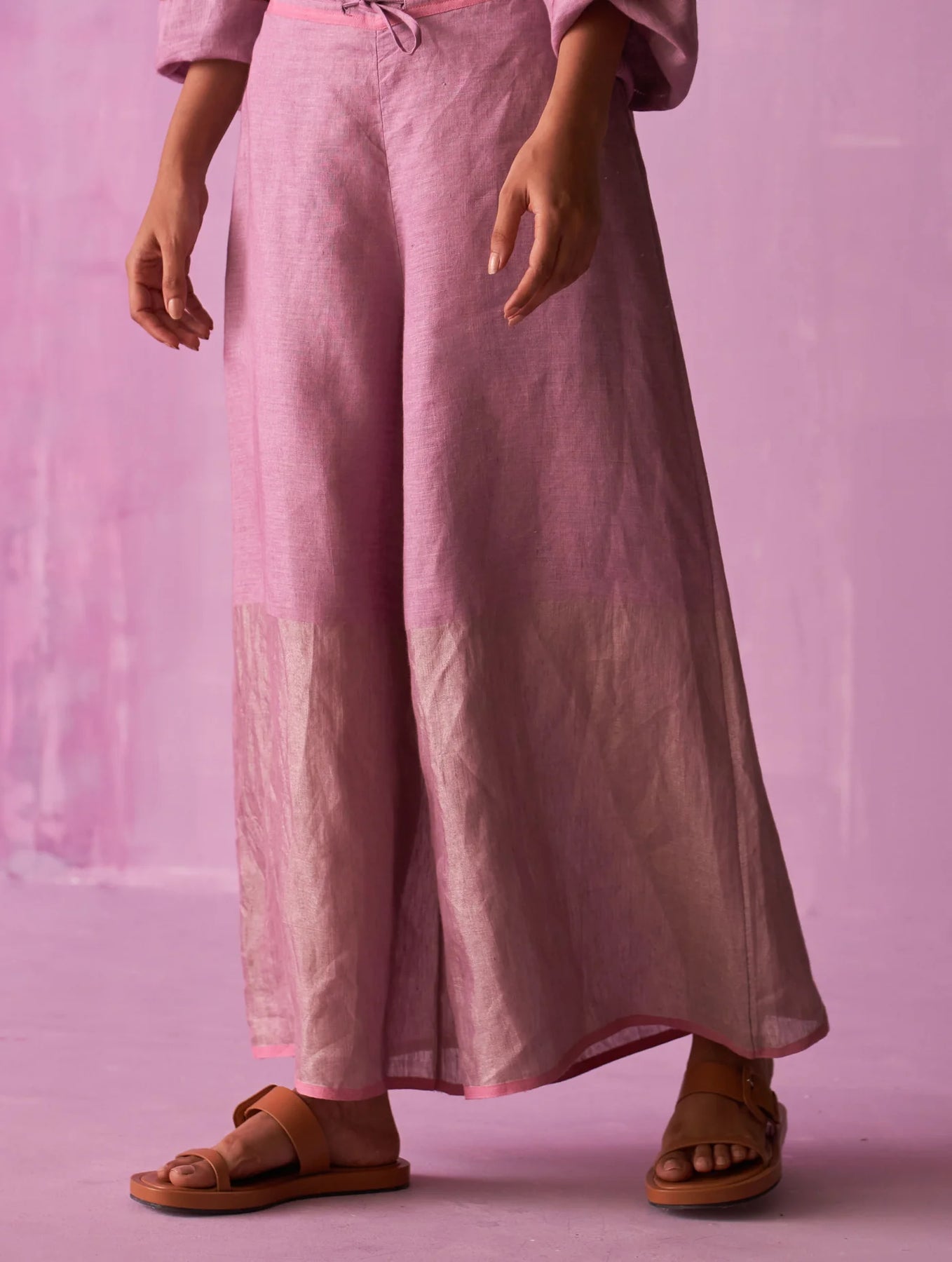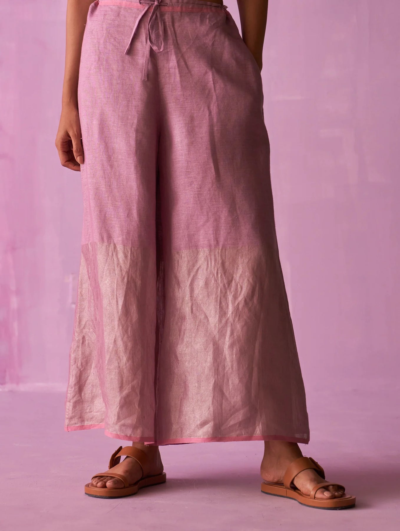 Handloom soft linen palazzo pants with woven metallic zari border at the hem and a pop-coloured selvedge. The pant has an elasticated waistband at the back with a drawstring and pockets.