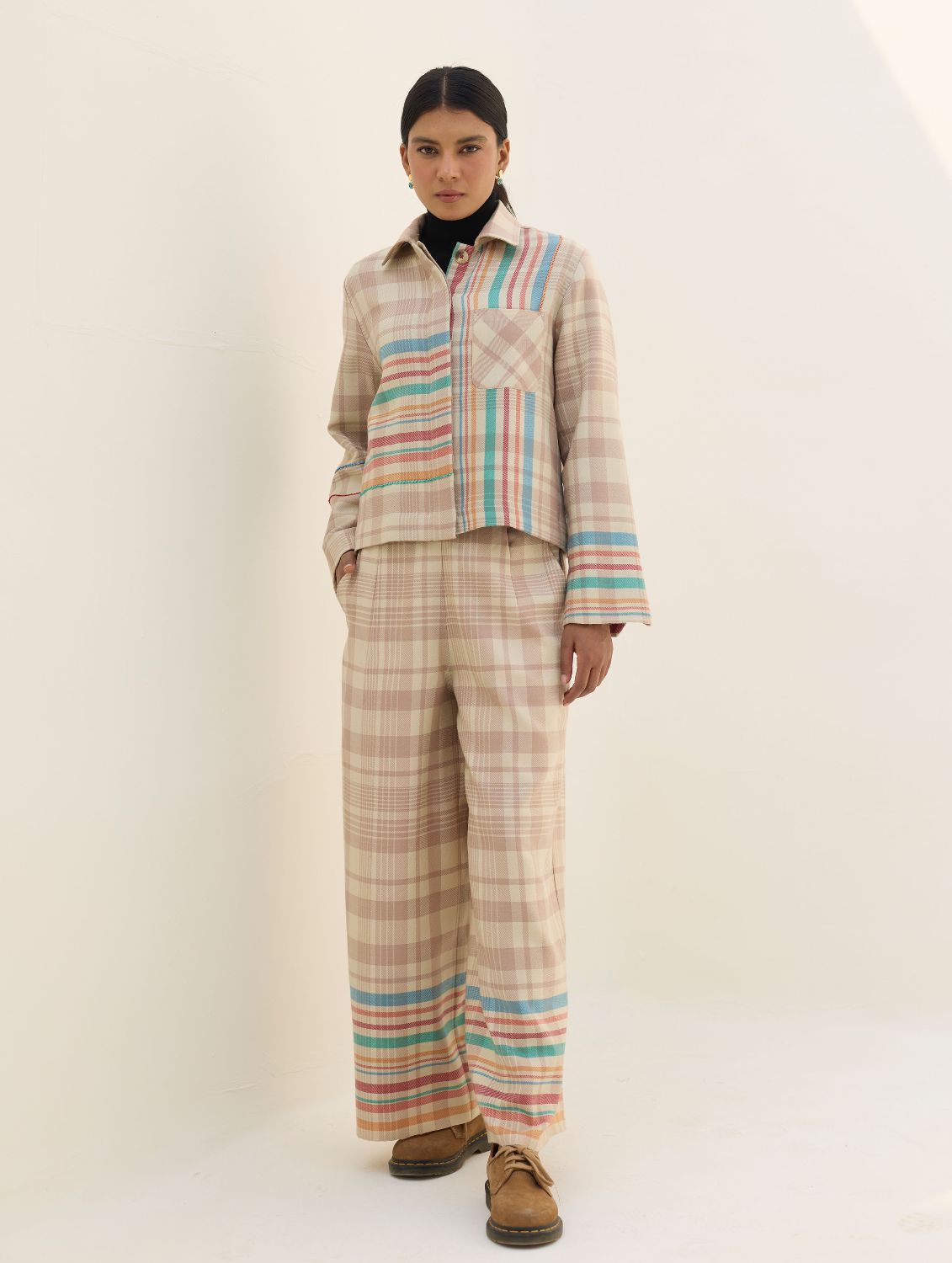 Today, Manan offers womenswear, menswear, dupattas, and jewellery — all shaped by the ethos of slow, contemplative design. Their palette is grounded in natural hues; their silhouettes are soft, balanced, and seasonless. Kurta sets and separates capture a modern Indian aesthetic that travels effortlessly anywhere in the world, while co-ord sets offer longevity and versatility in equal measure. Shirts, dresses, trousers, jackets, and dupattas form a modular wardrobe that encourages personal expression.