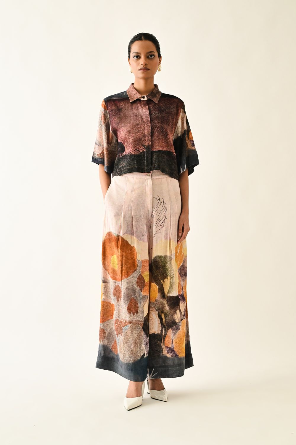 Lower: Anti fit, Pleated pants, Front zipper with button, hand-painted abstract expressionist digitally transferred print, side pockets. Print placement may vary—single Piece.