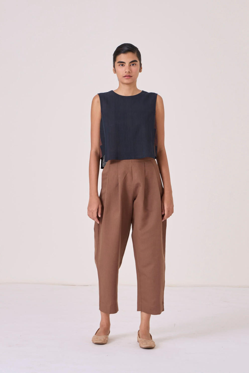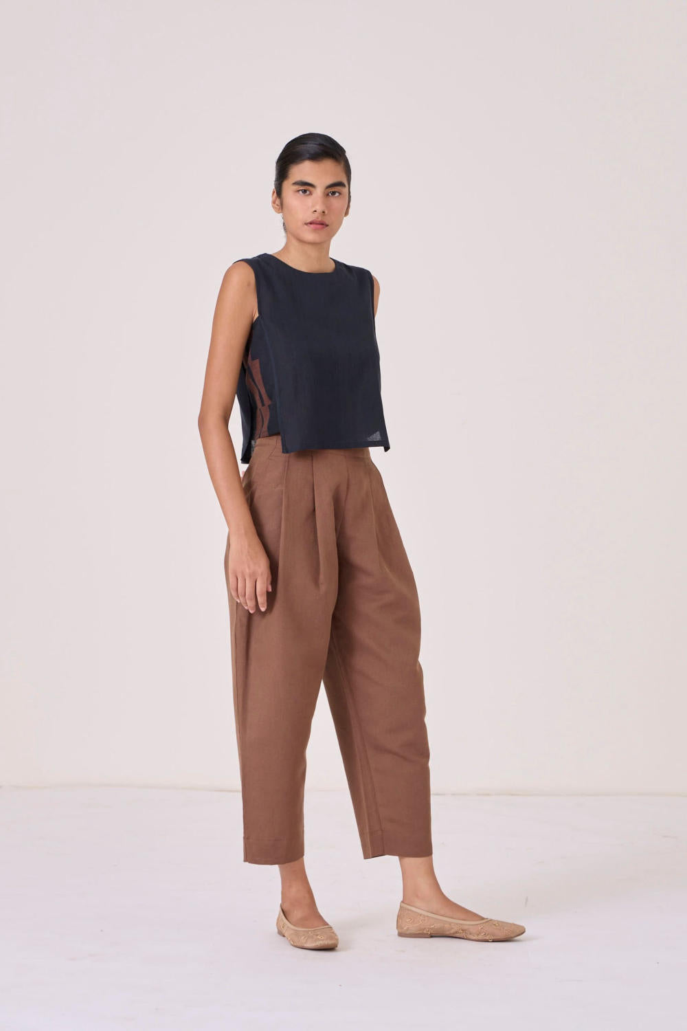 An in-house favourite. Sharply tailored pants. High-rise, crop-length pants. Four crisp front pleats contoured to a slimming waistline. Concealed hook and side zip fastening. Super comfort fit. In-seam pockets.