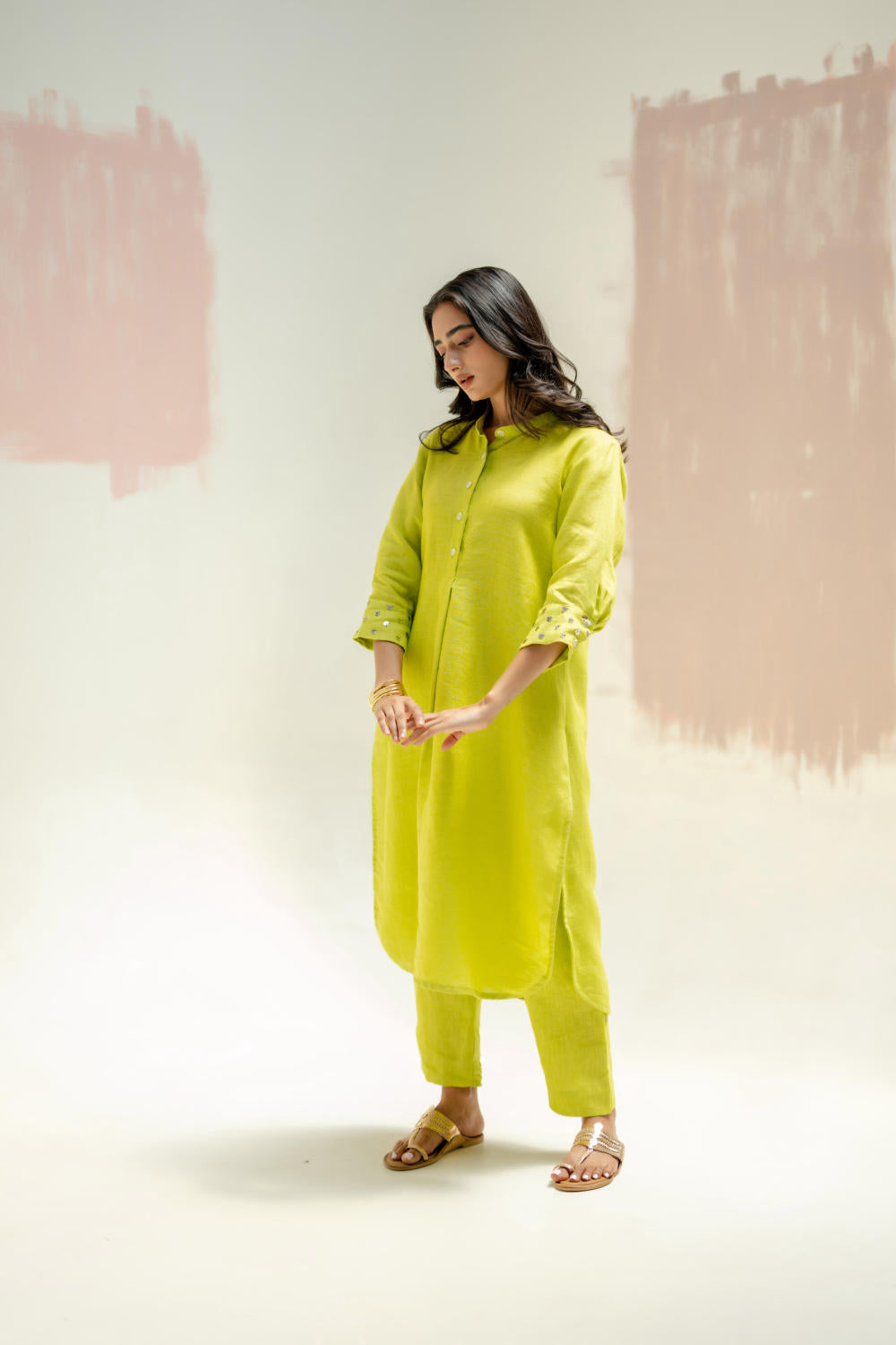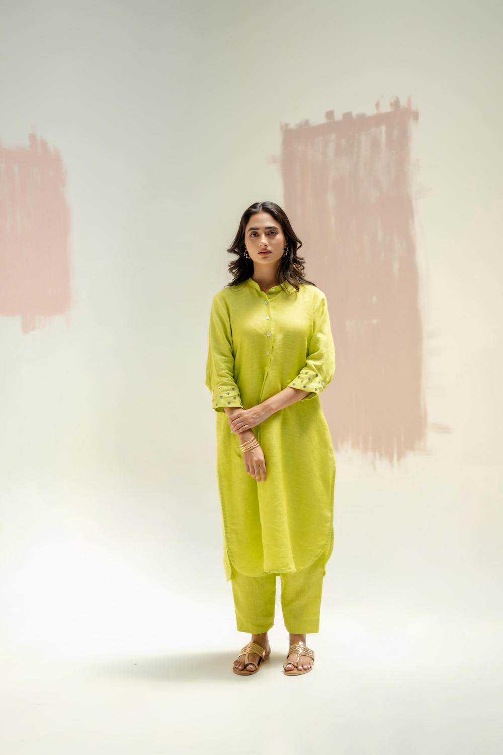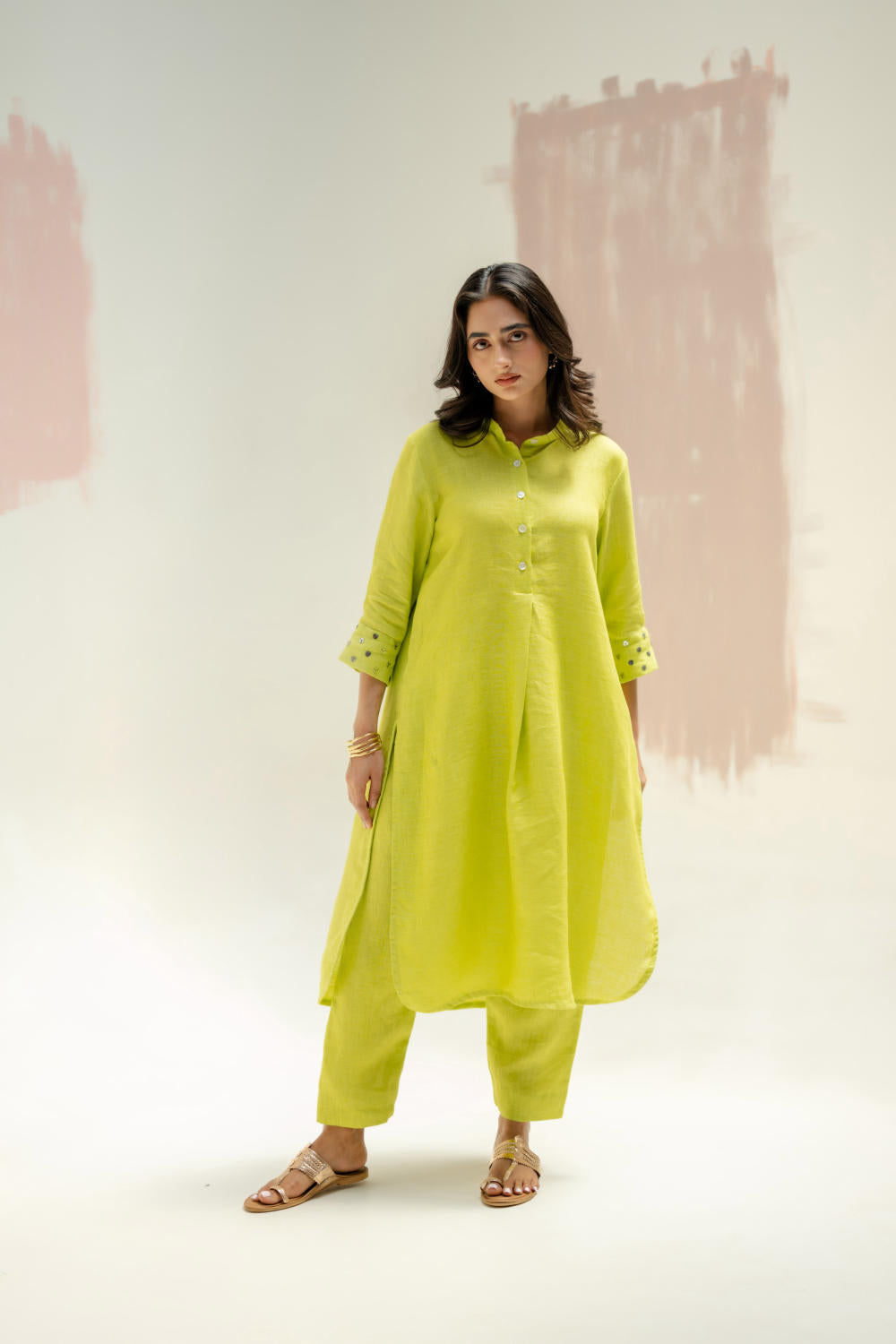 Crafted from pure linen, this kurta set features a structured yet effortless fit with a mandarin collar, making it a summer essential. The hand-embroidered cuffs, adorned with sequins and threadwork, add a subtle shimmer. Paired with comfortable slim fit linen pants.