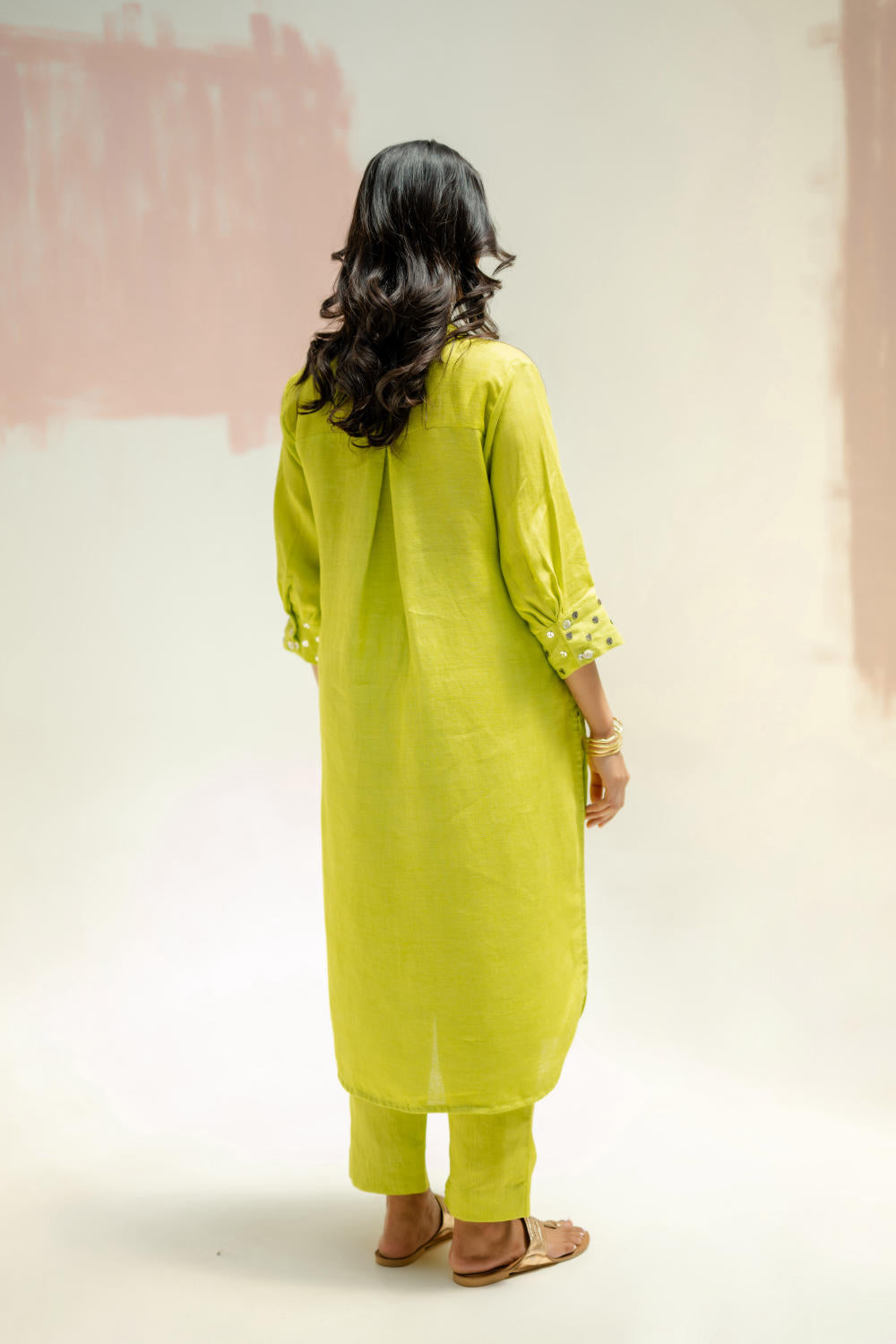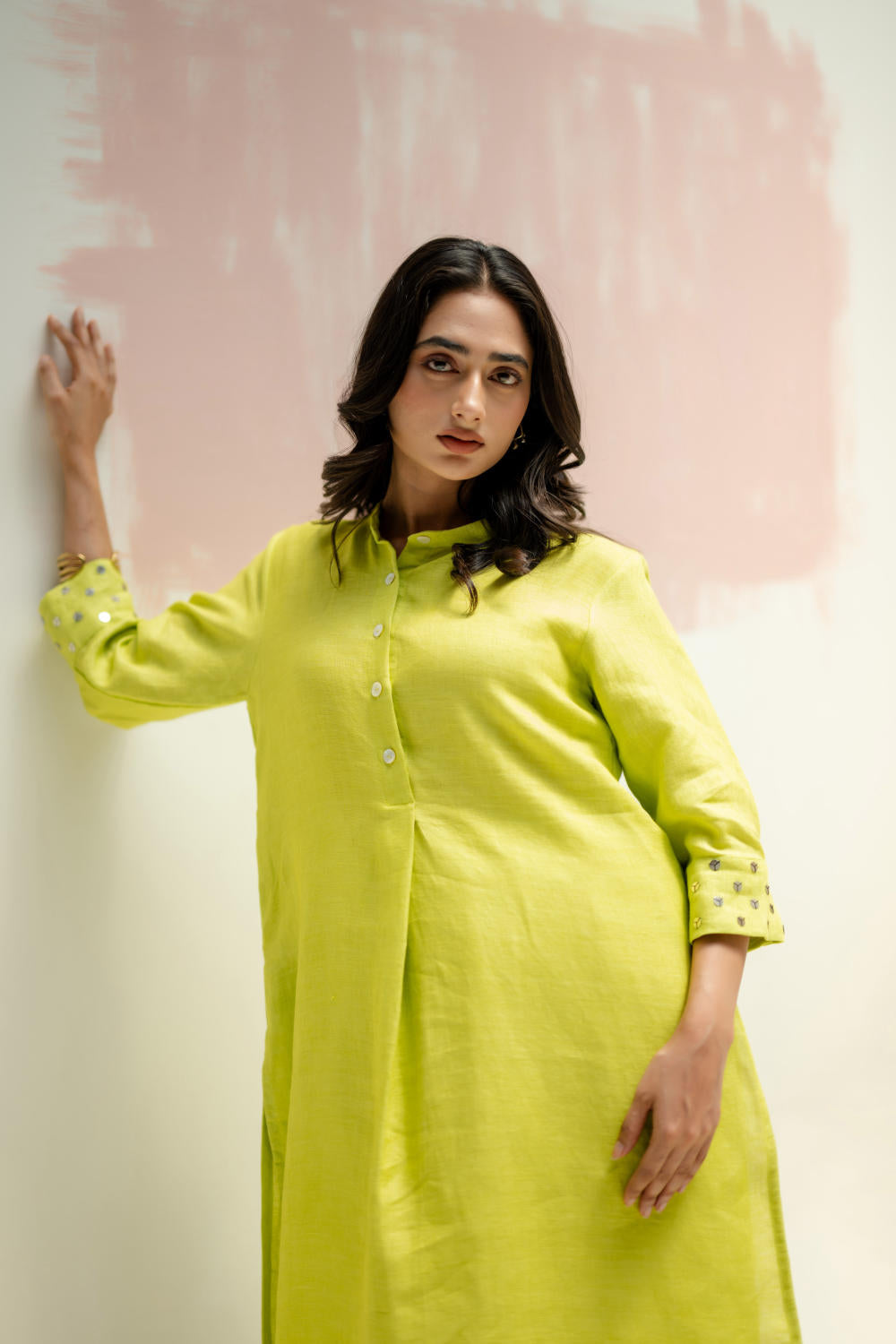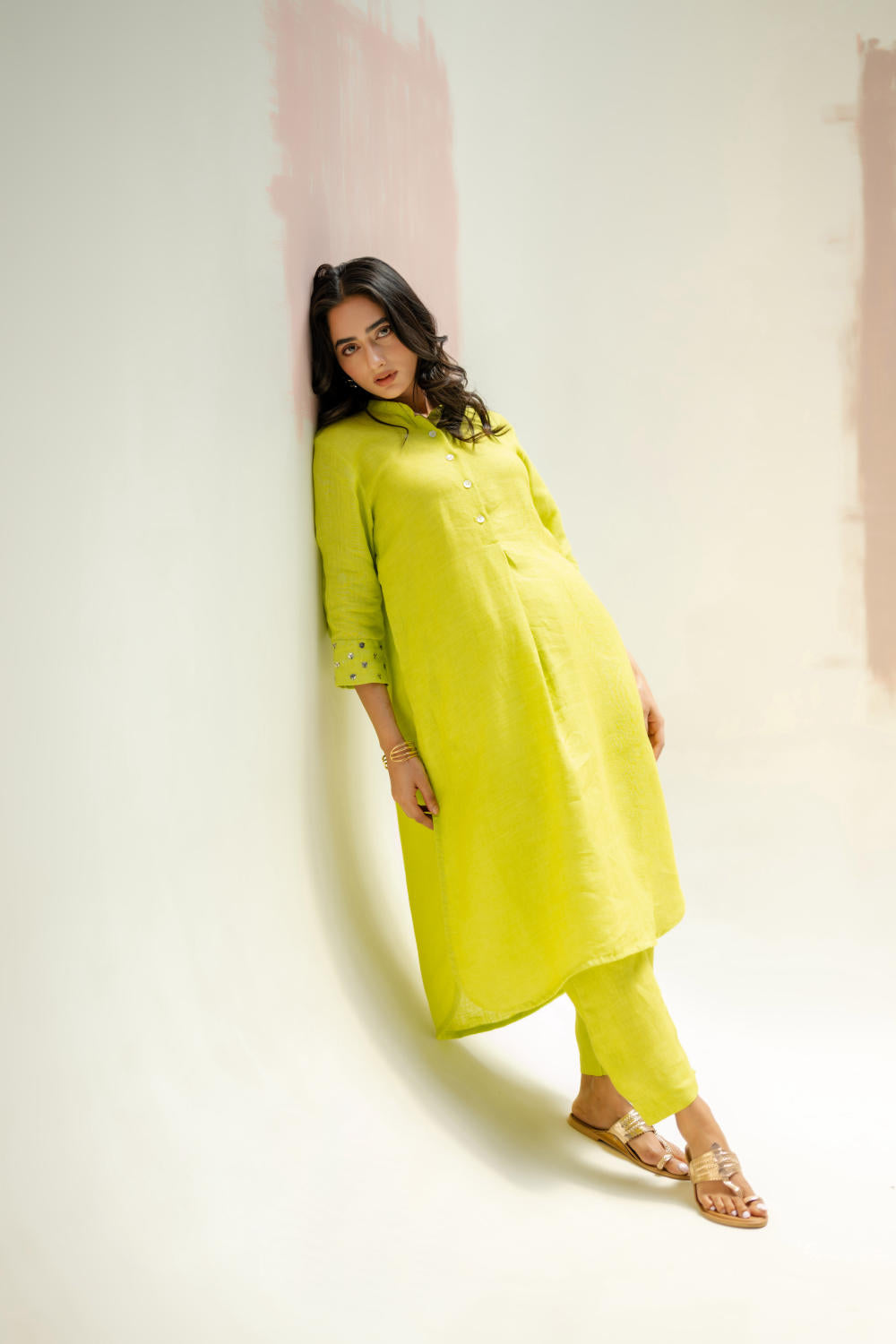 Crafted from pure linen, this kurta set features a structured yet effortless fit with a mandarin collar, making it a summer essential. The hand-embroidered cuffs, adorned with sequins and threadwork, add a subtle shimmer. Paired with comfortable slim fit linen pants.