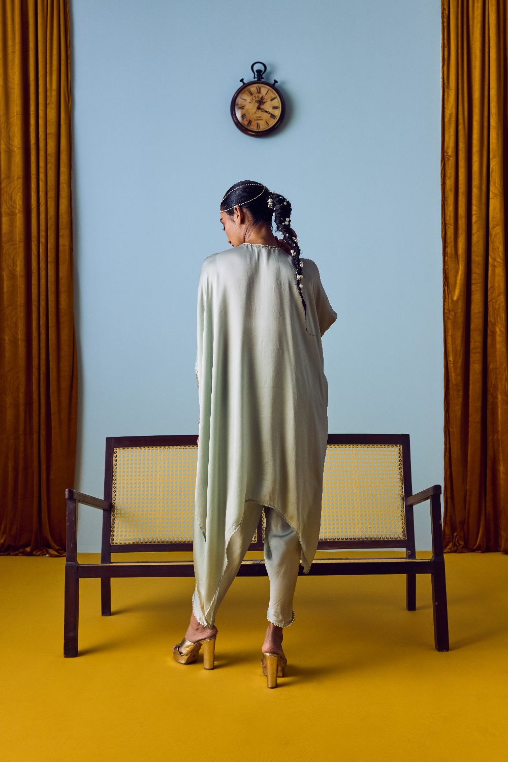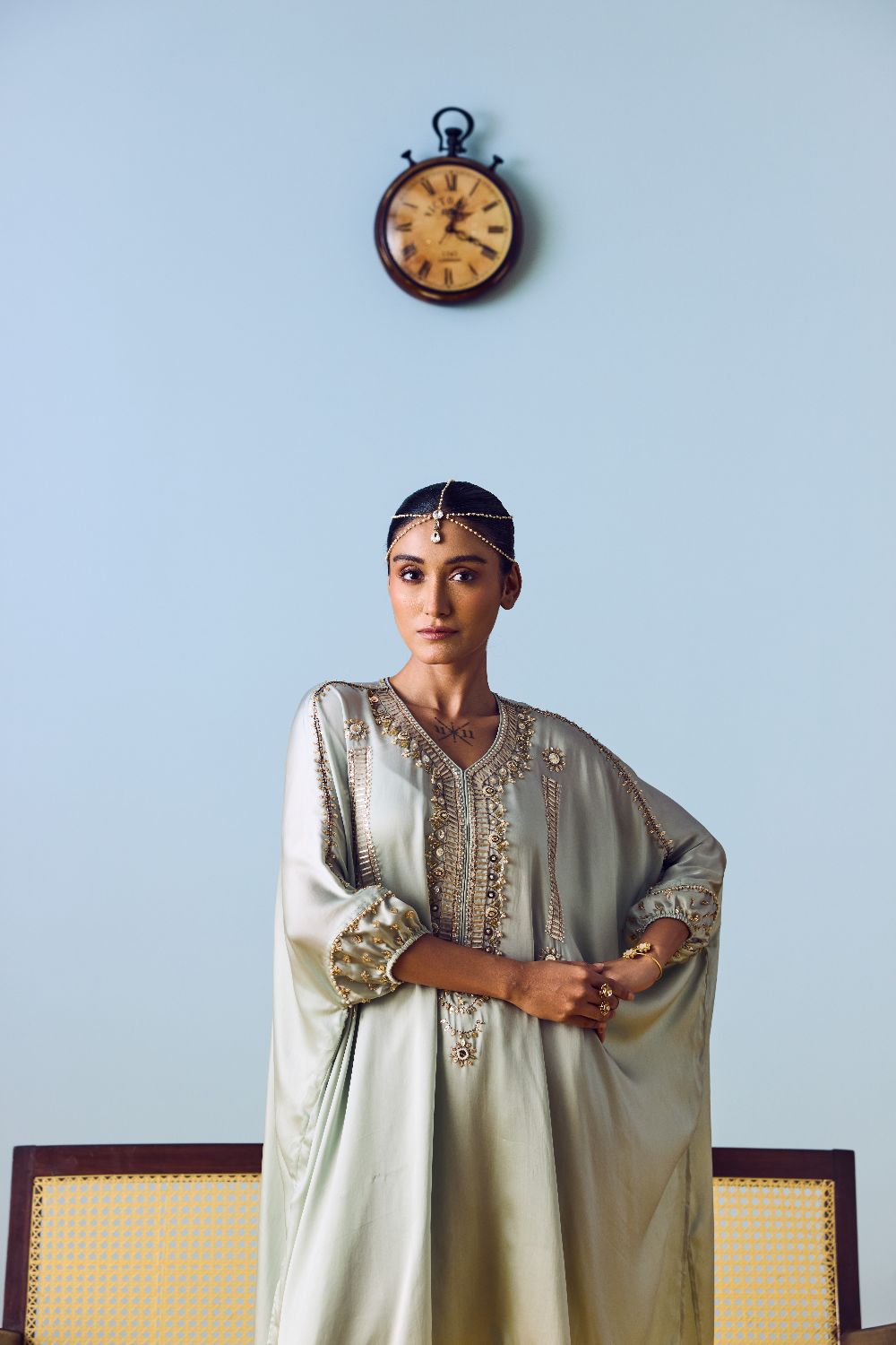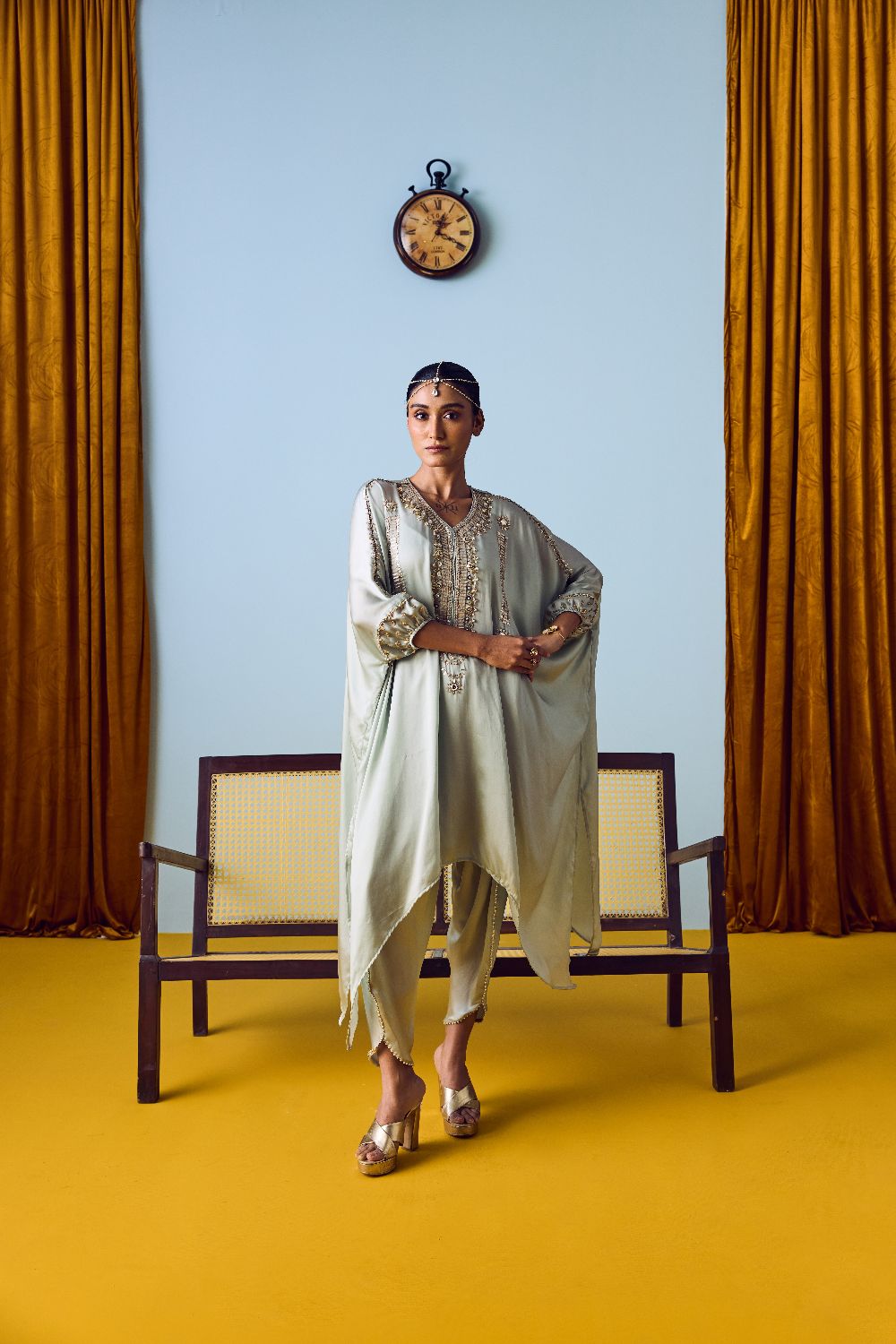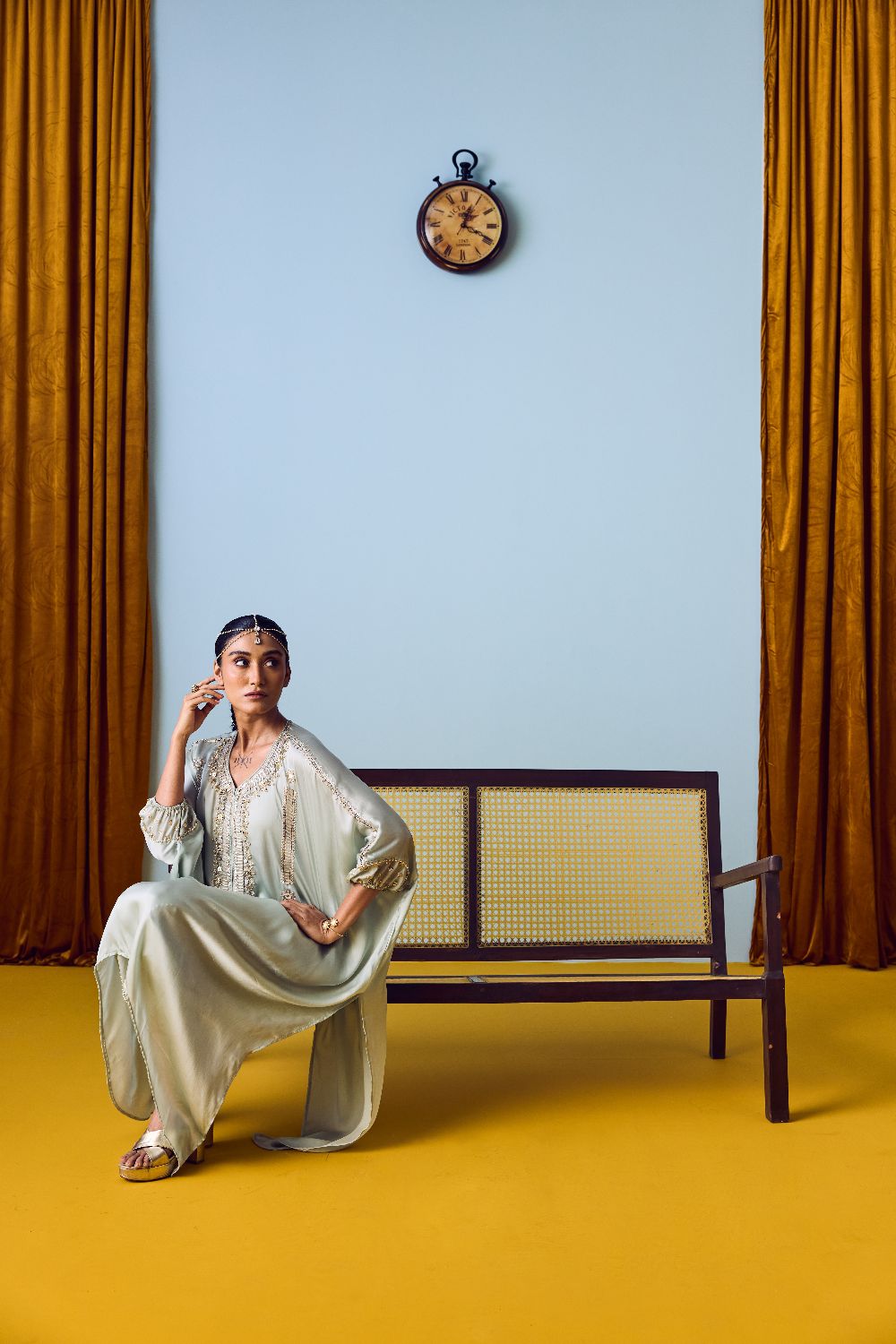 Featuring an antifit hand-embroidered kaftan tunic paired with tulip pants. The kaftan tunic has a relaxed, flowing fit with the model shown wearing size S. The bottom consists of tulip-style pants with reinforced seams and decorative handmade pearl gota lace trim along the edges. While the top offers a loose, comfortable fit, the tulip pants are designed to fit and are true to size.