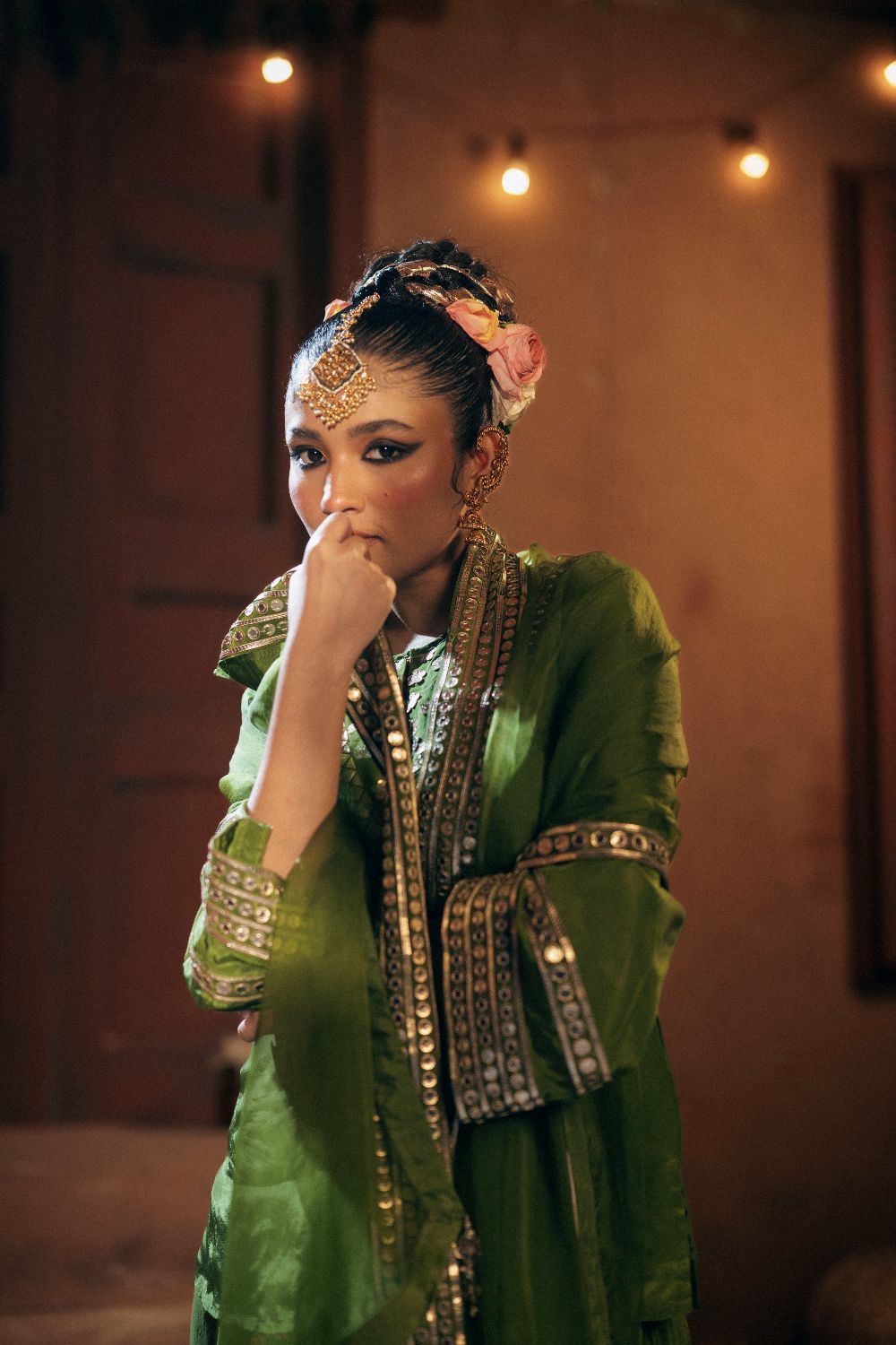 Kurti Top & Sharara Set featuring phool appliquéd panels, designed to combine traditional charm with contemporary elegance. The structured kurti top is adorned with light gold appliqué, while the flowy sharara adds movement and grace.The set is completed with organza silk dupatta in coordinated colour.Perfect for weddings, festive occasions, and pre-wedding celebrations. Model wears size S.