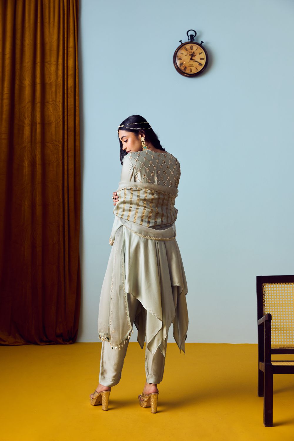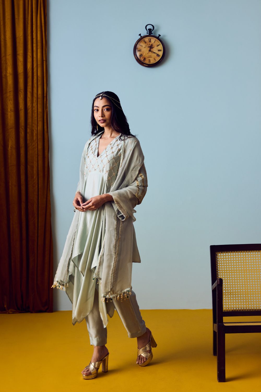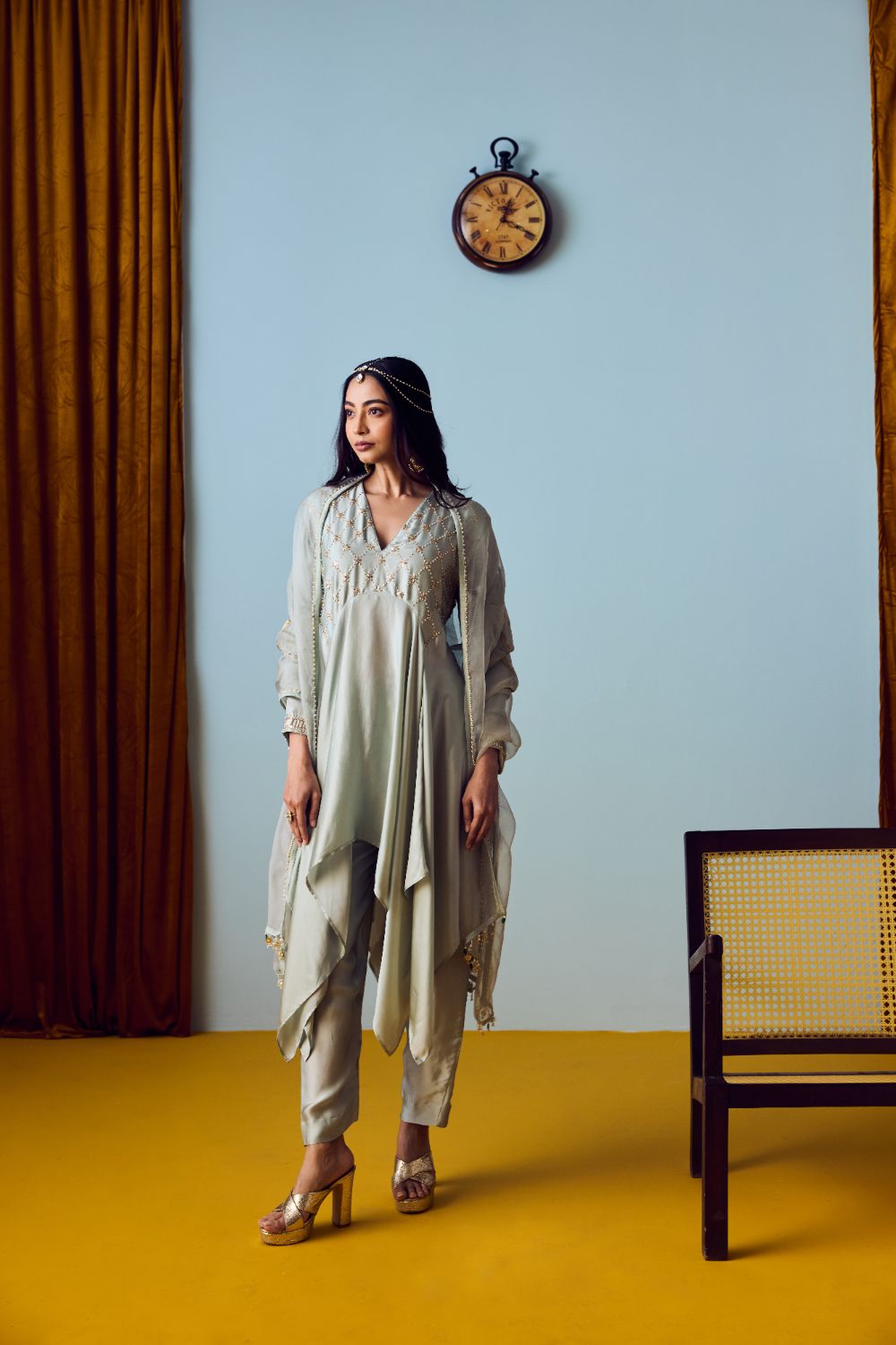 Here's a Three-piece set featuring an asymmetric kurta and sleek straight pants. The kurta flows freely from the upper waist down, creating graceful movement below the intricately embroidered yoke. Paired with straight pants designed with an elasticated waistband for comfort. The set is completed with organza silk hand embroidered dupatta. Model is wearing Size S and is 5ft 7inches in body height.