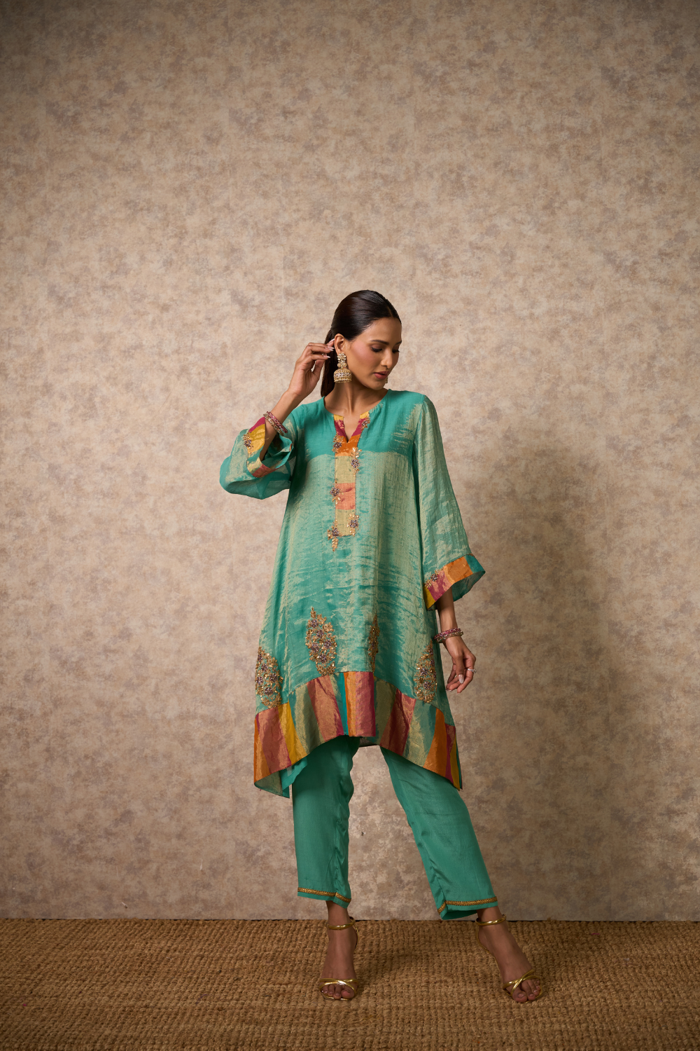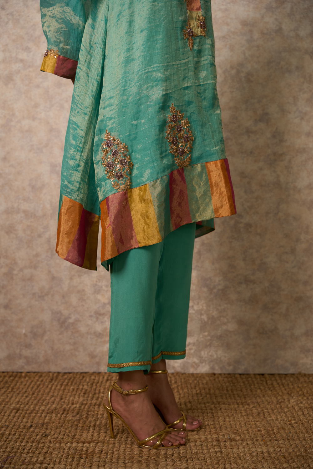 Asymetric indo-western top pant set with intricate zardozi and zari work on front and Back, flowing zardozi work sleeves with embroidered pants.Front adorned with woven tissue stripes.