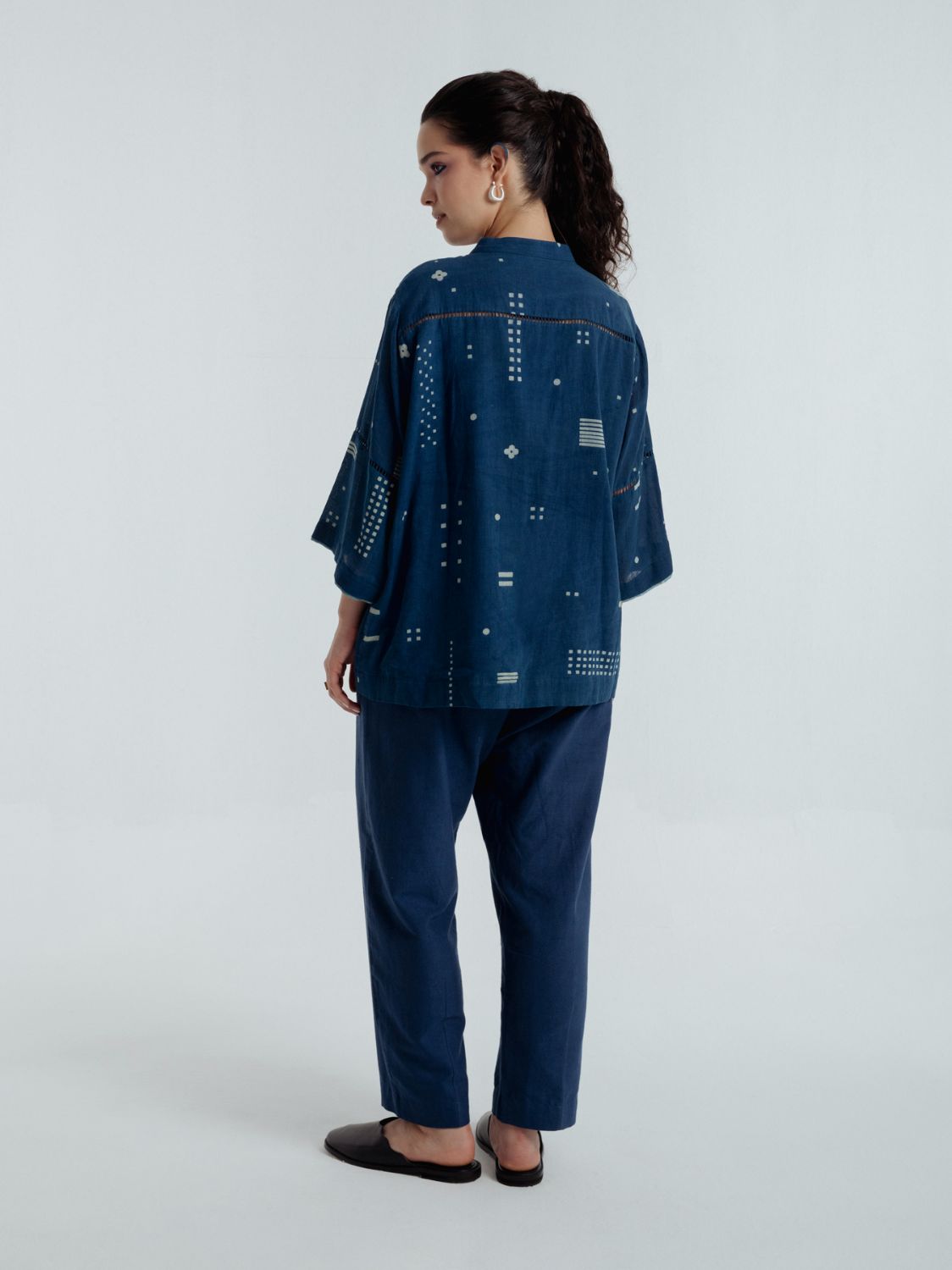 Delicate blue and white hand embroidered french knots making dots and lines, arranged in subtle organic motifs, add a quiet charm, while big Dabbu patterns create depth and engineered placement. Two embroidered motifs grace either side of the shirt, and natural shell buttons provide a refined finishing touch.
