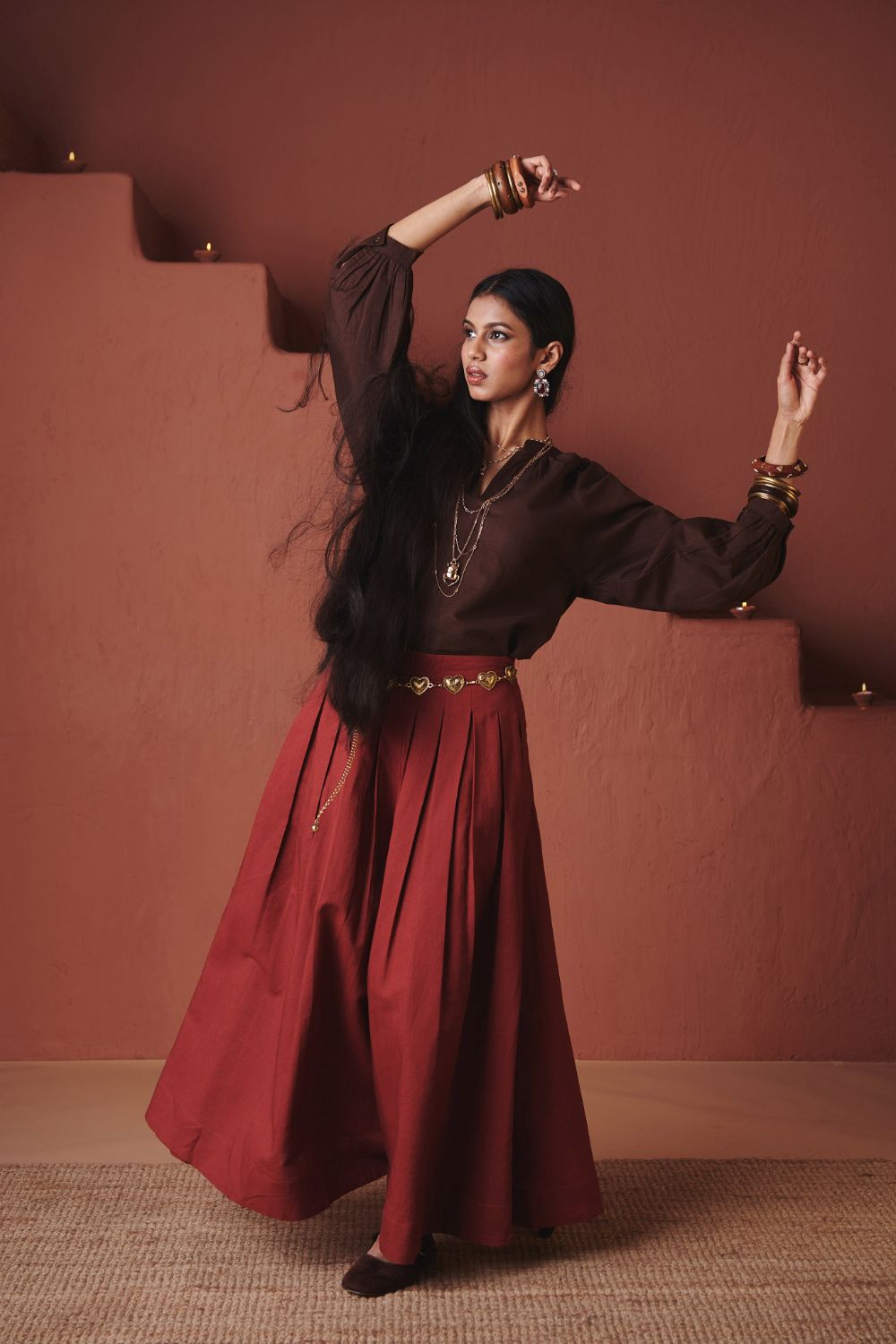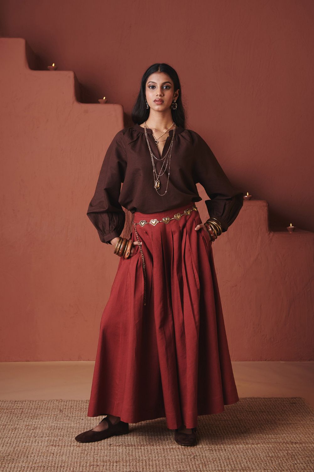 Multi-pleated co-linen pants crafted with a high waist and generous volume for a fluid, skirt-like flare. The structured pleats add definition and movement, making them a versatile piece that balances festive elegance with everyday comfort.
