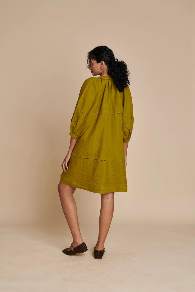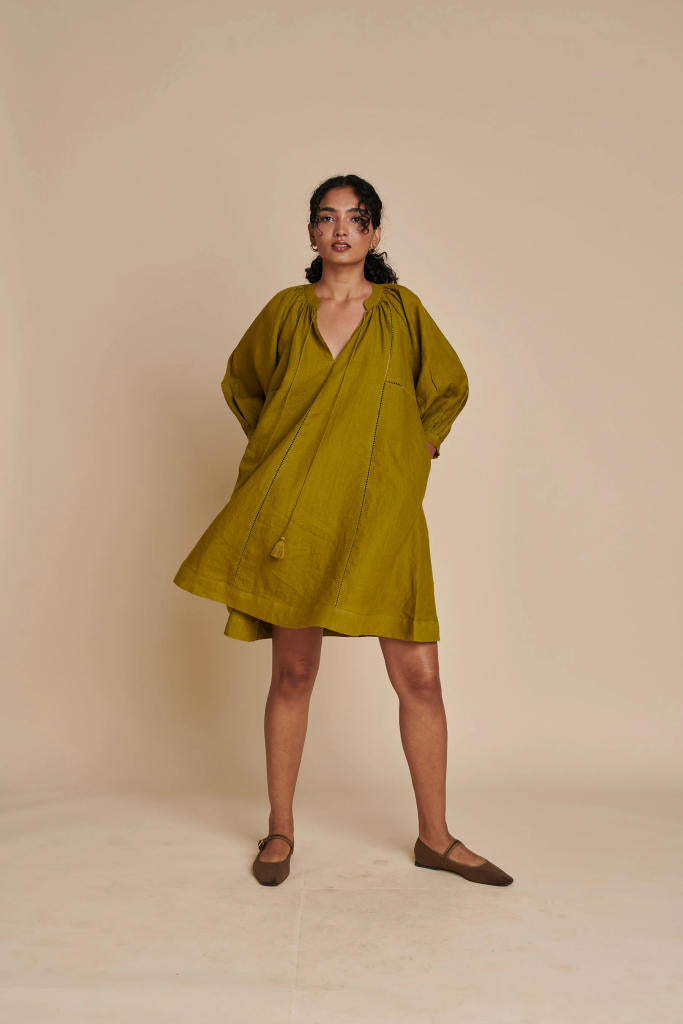 This summer dress is bound to make a statement! At the heart of the design, the lace inserts add a touch of ethereal beauty, creating an intricate visual enchancement. The puff sleeves add a playful and feminine touch while drawstrings at the neckline, which are adorned with tassels, add a bohemian flair to the dress.