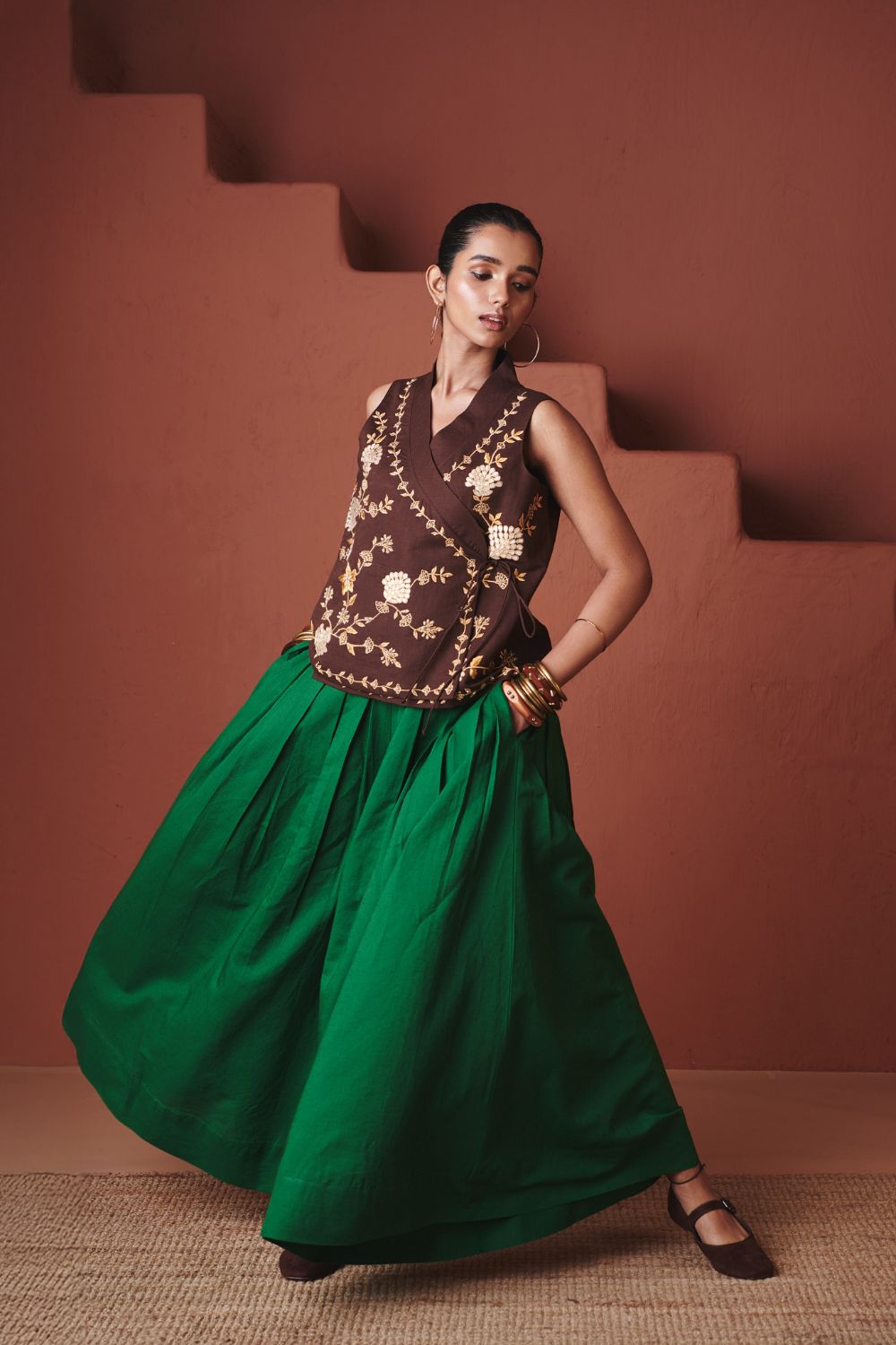 Multi-pleated co-linen pants crafted with a high waist and generous volume for a fluid, skirt-like flare. The structured pleats add definition and movement, making them a versatile piece that balances festive elegance with everyday comfort.