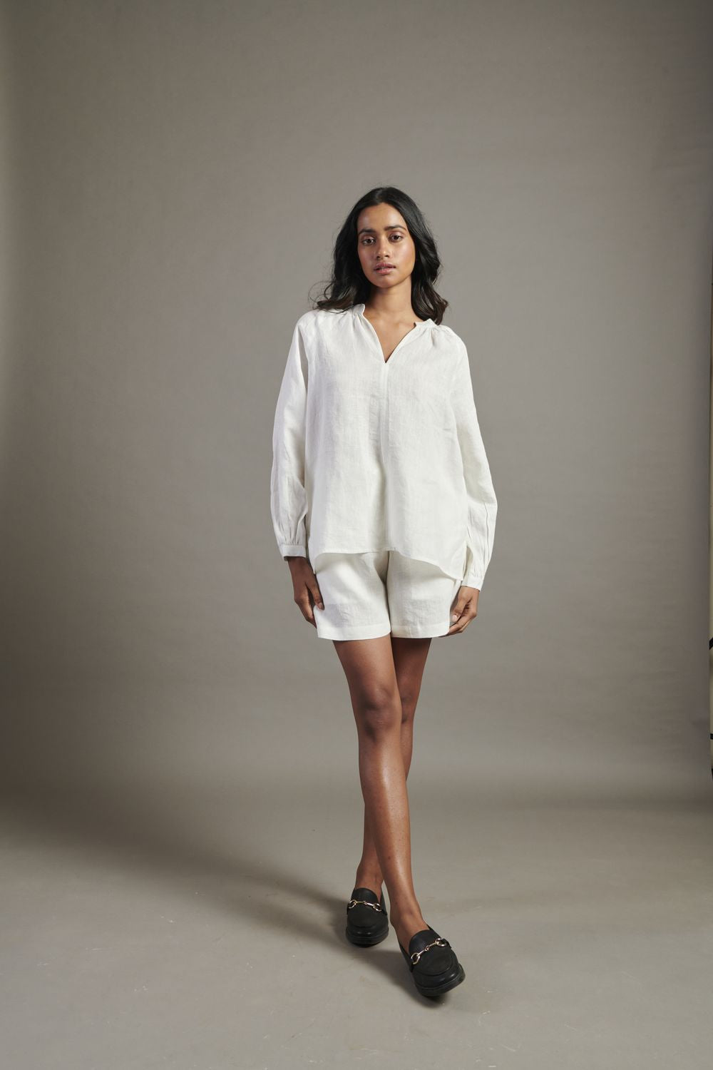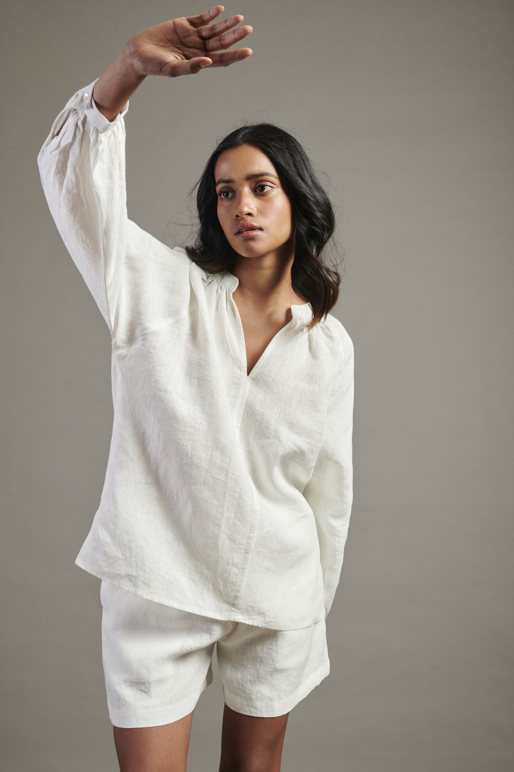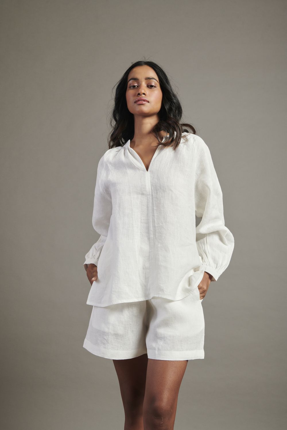 A fresh new take on our shorts set, meet our slow living favourite. The band collar and billowy sleeves lend to it's appeal, paired with shorts that you can take from home to brunch. Crafted in our signature pure linen, choose from earthy hues of Taj, Ellora and the newly introduced Dhaari stripes.